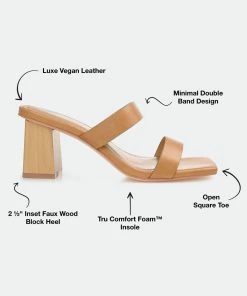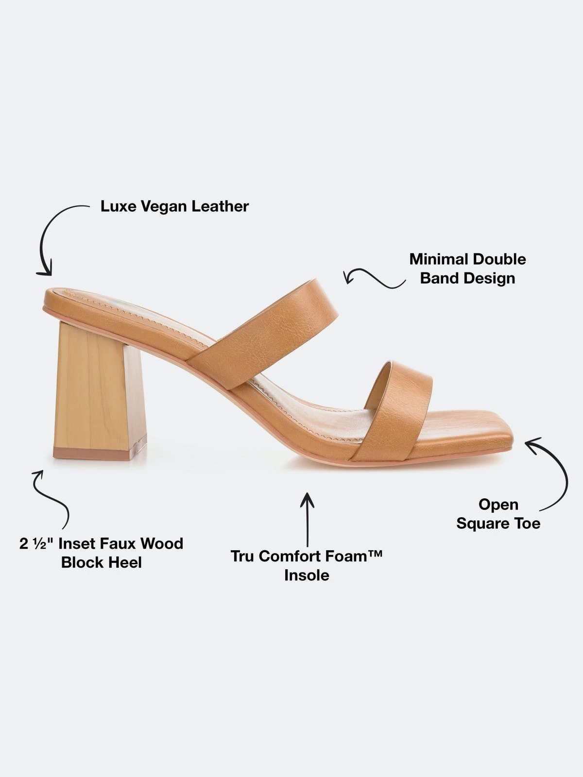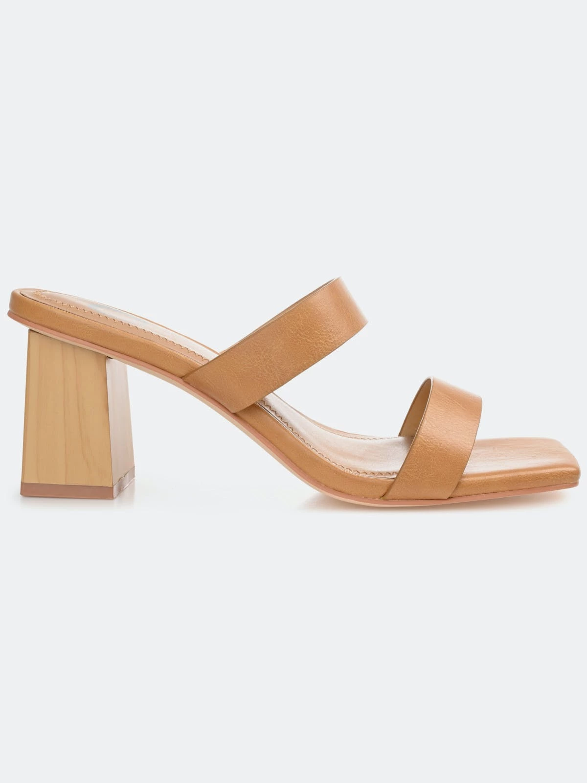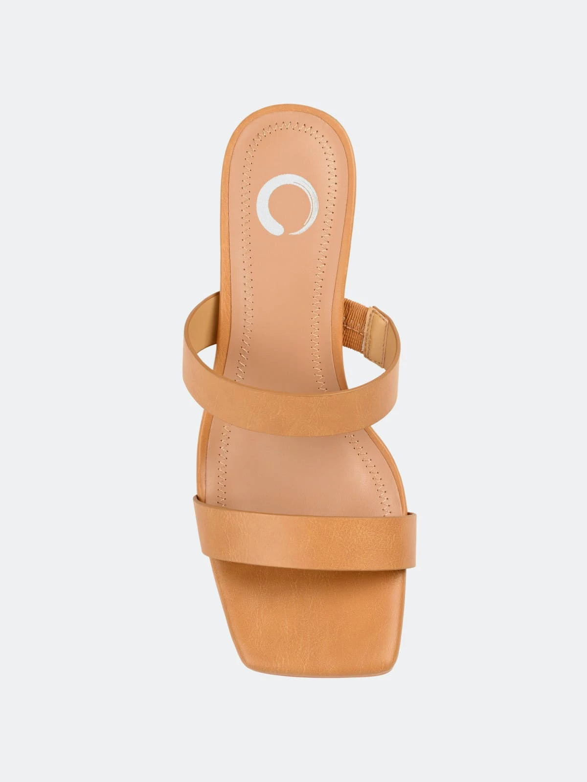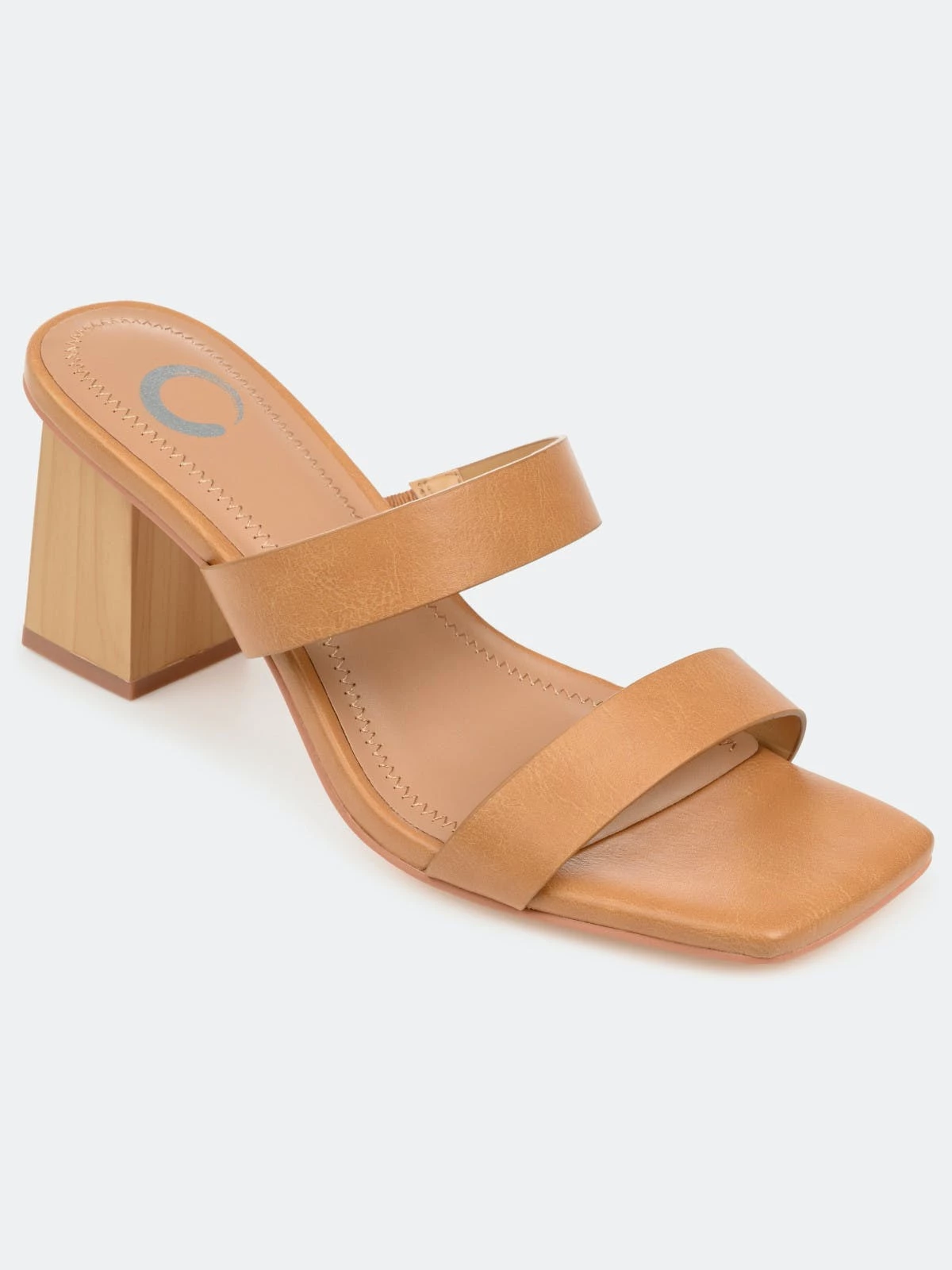 A stunner of sandal, the Nolla by Journee Collection. This style is easy to walk in with vegan leather uppers and a 4 mm Tru Comfort Foam™ footbed. Twin straps at the vamp and an inset block heel shape the design for a flattering fit.Heel Height:2 1/2-inchHeel Type: Block Heel Platform Height:Flat-inchShoe Width: MediumClosure Type: Slip-onStrap Type: Multi -StrapToe Style: OpenLining: Faux LeatherUpper Material: Vegan LeatherOutersole Material: Man-madeFootbed: 4 MM Tru Comfort Foam™All measurements are approximate and were taken using a size 6. Please note measurements may vary slightly by size.