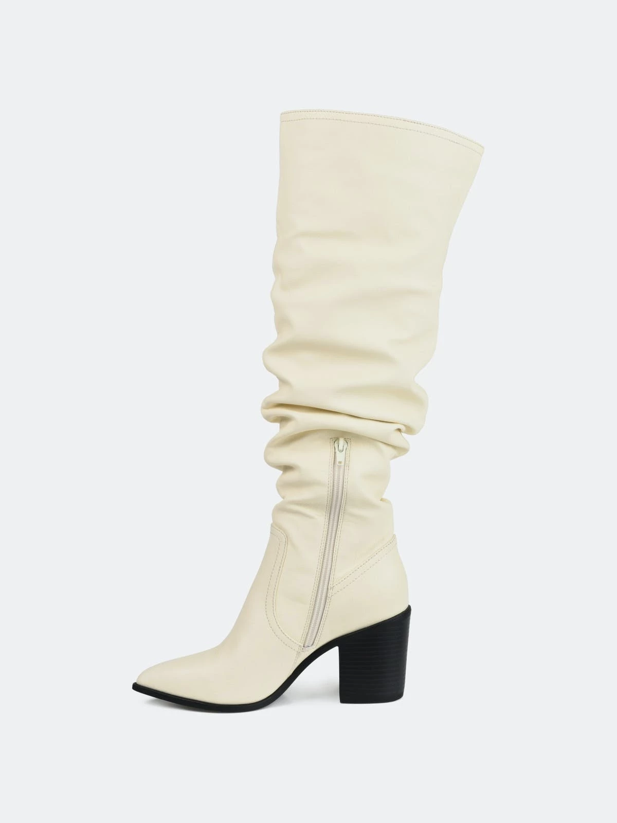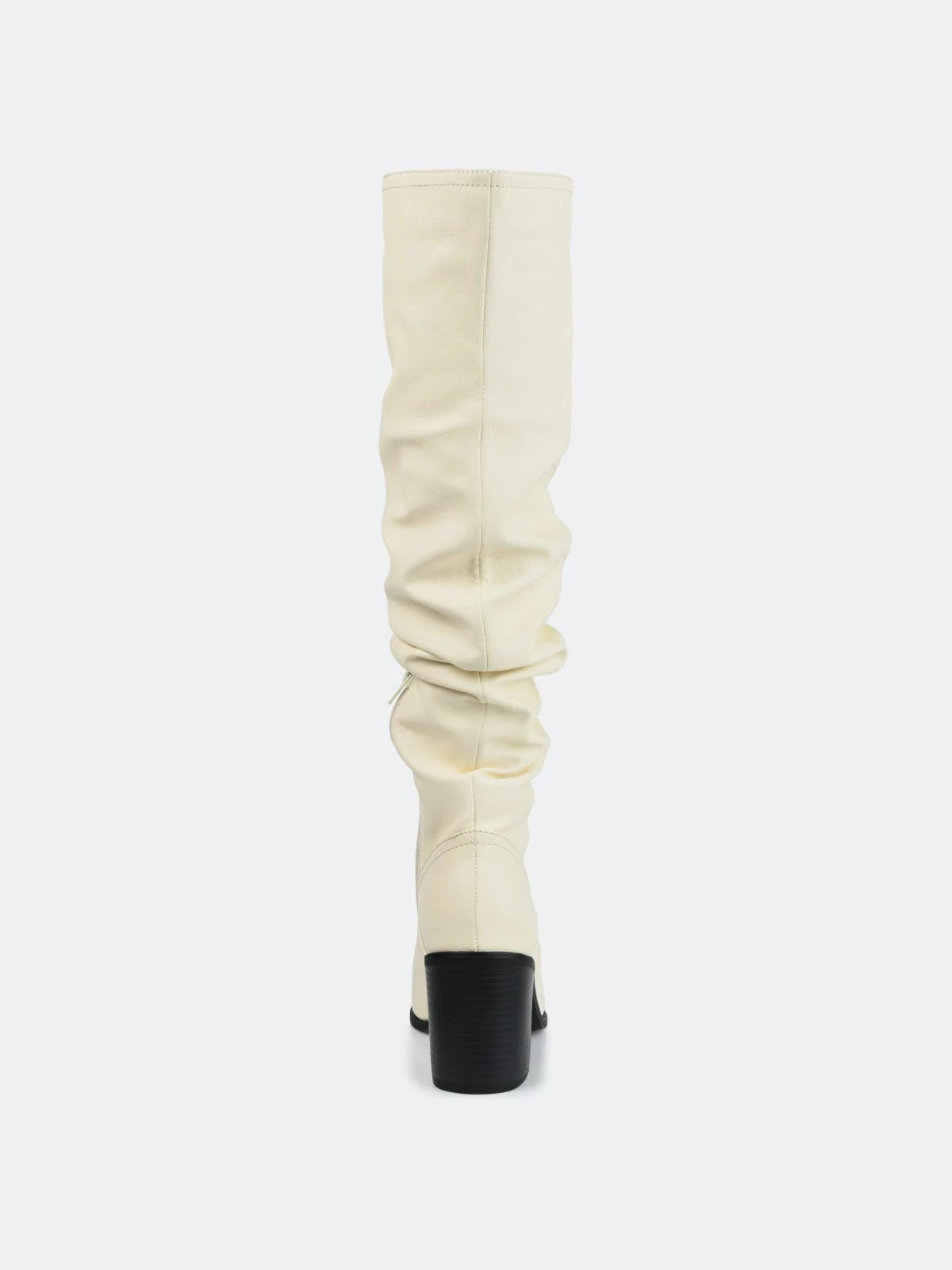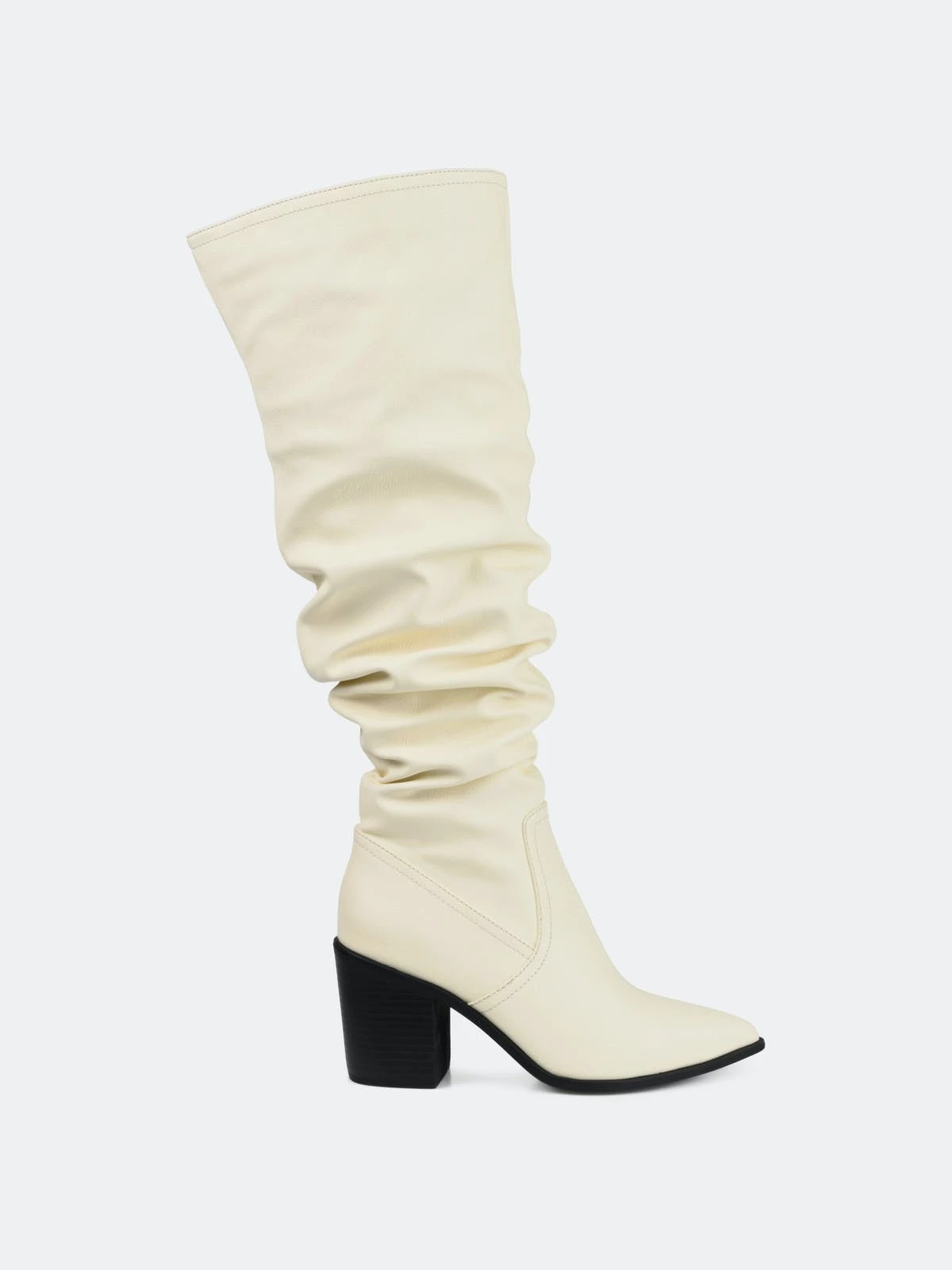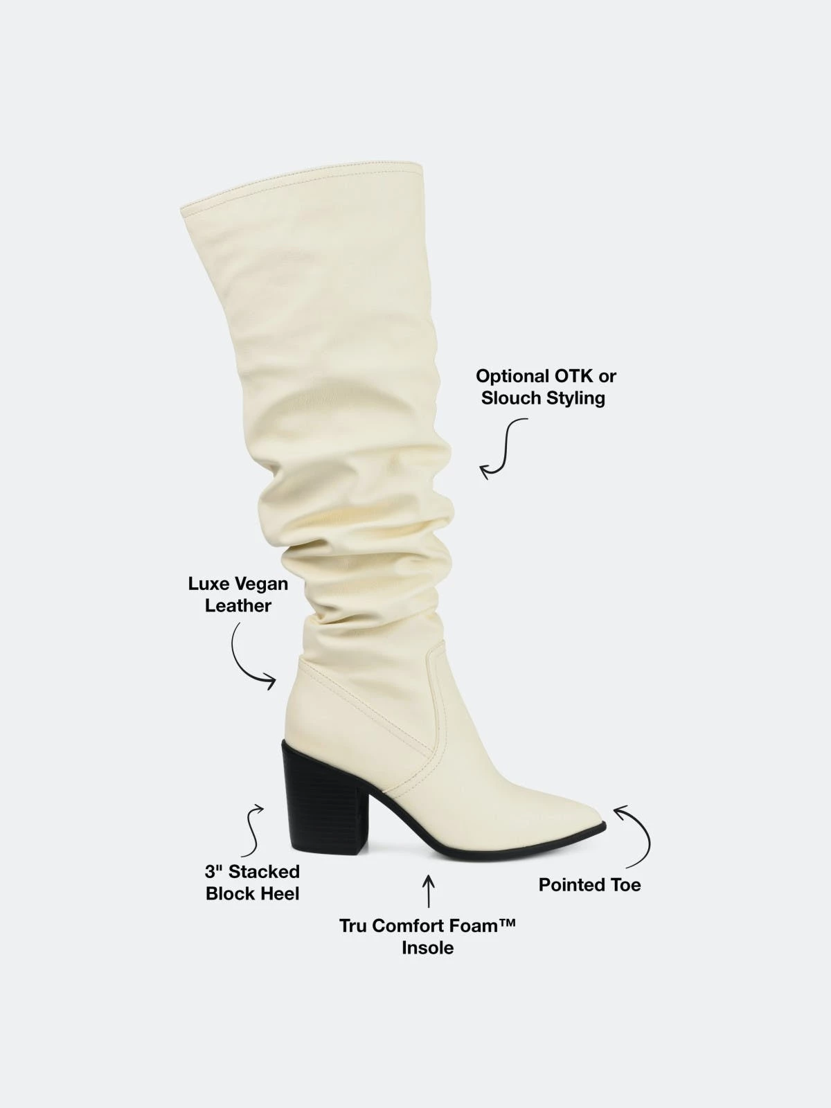 Simply chic, the Pia by Journee Collection. This over-the-knee boot adds an elevated finish to any outfit with its slouchy details and pointed-toe. A supportive 4 mm Tru Comfort Foam™ insole, vegan leather, and stacked block heel complete this upscale design.Heel Height: 3-inch. Heel Type: Stacked. Platform Height: Flat-inch. Shaft Height: 19 1/2 inches. Calf Circumference: 15 inches. Top Circumference: 17 inches. Shoe Width: Medium. Closure Type: Inside Zip. Toe Style: Pointed. Lining: Fabric. Upper Material: Vegan Leather. Outersole Material: Man-made. Footbed: 4 MM Tru Comfort Foam™. All measurements are approximate and were taken using a size 6. Please note measurements may vary slightly by size.