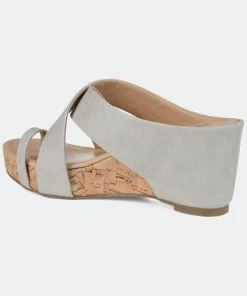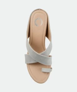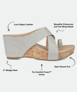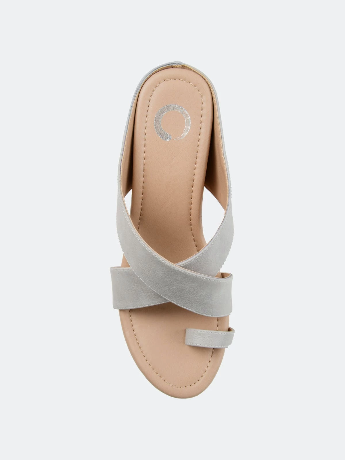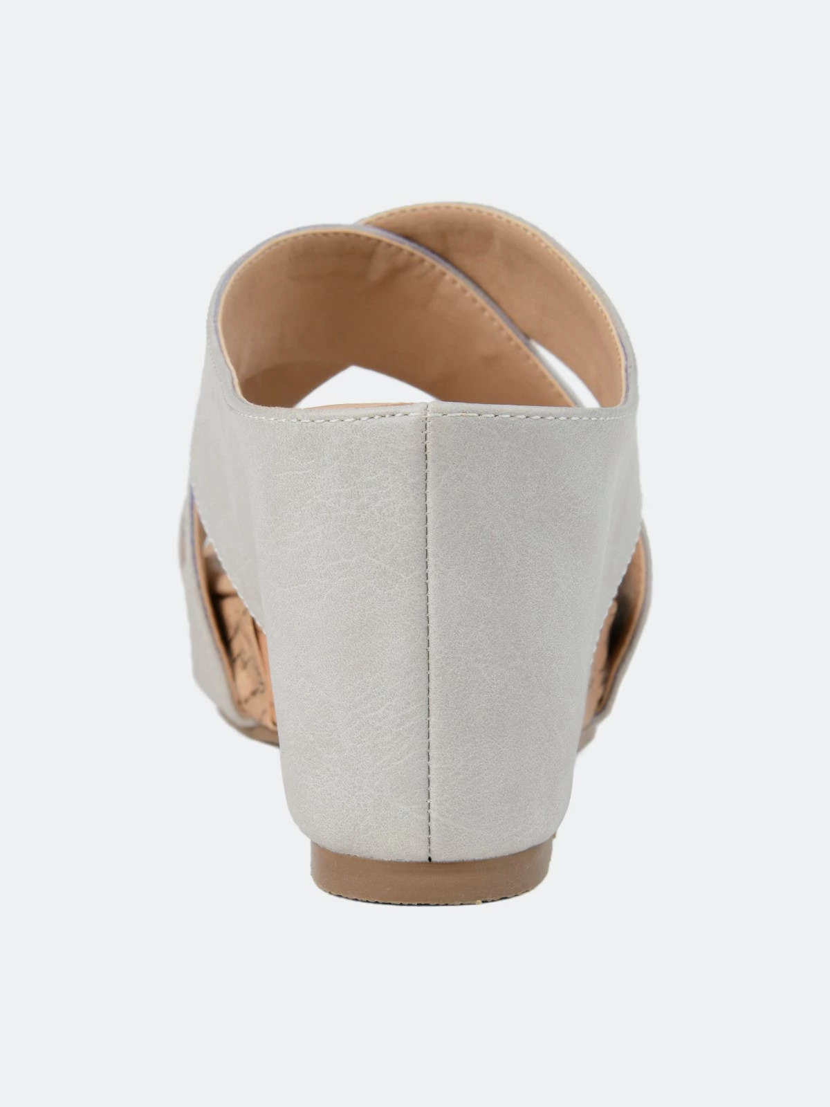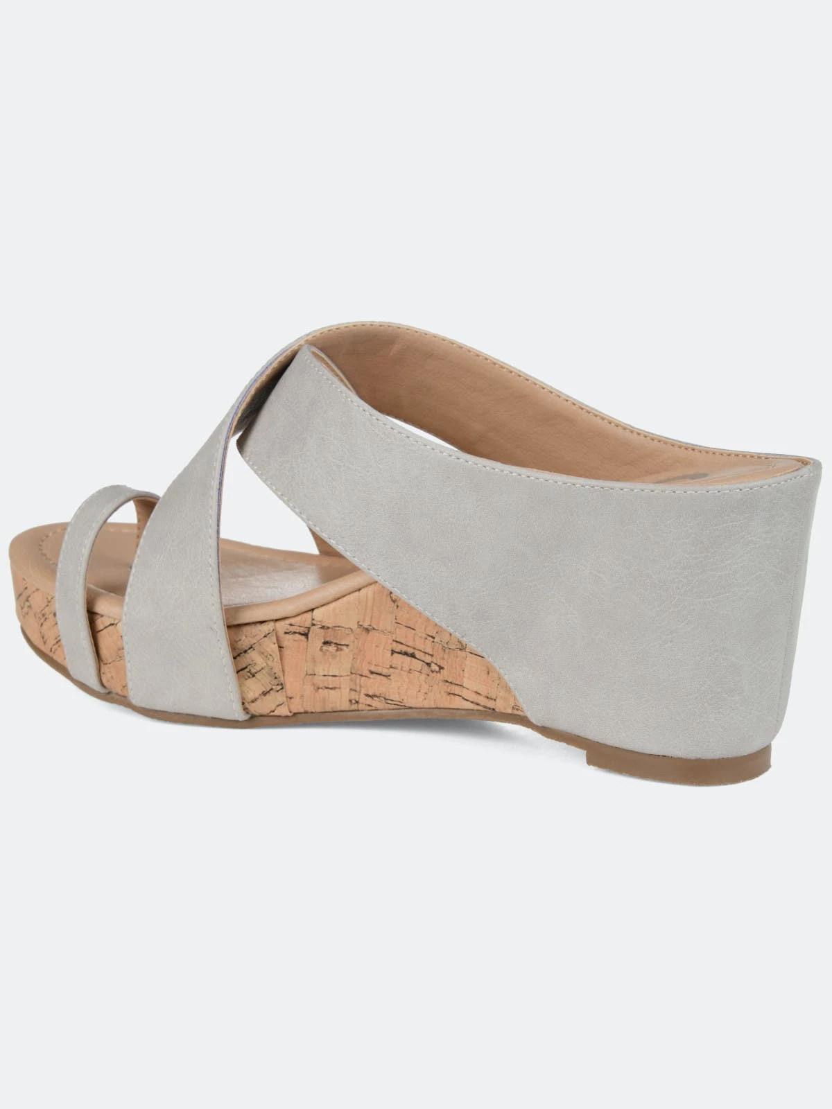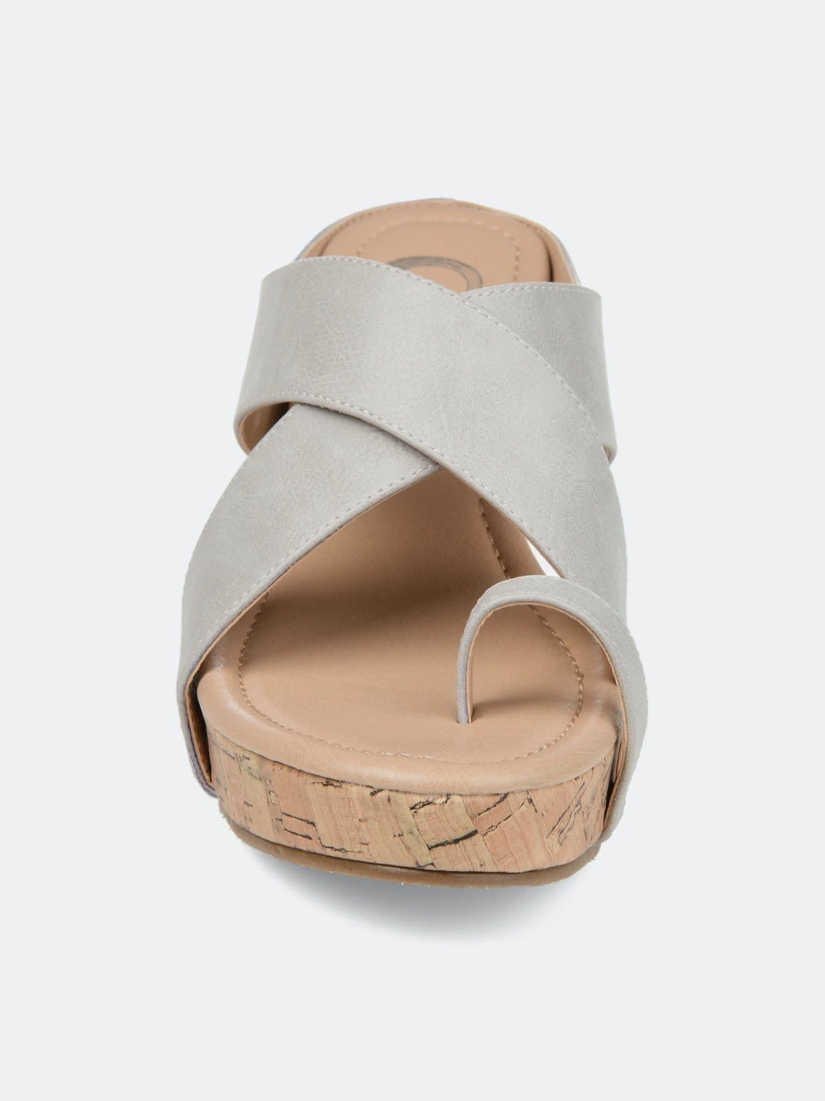 The Rayna features a beautiful crisscross design and a unique toe strap detail. The faux leather on the straps wrap gracefully behind the wedge heel, and synthetic cork materials on the outsole peep through on the platform.Heel Height:3-inchHeel Type: Wedge Platform Height:1 1/2-inchTop Circumference:9 1/4 inchesShoe Width: MediumClosure Type: Slip-onStrap Type: Toe StrapToe Style: OpenLining: Faux LeatherUpper Material: Faux LeatherOutersole Material: SyntheticFootbed: 4 MM Tru Comfort Foam™All measurements are approximate and were taken using a size 6. Please note measurements may vary slightly by size.