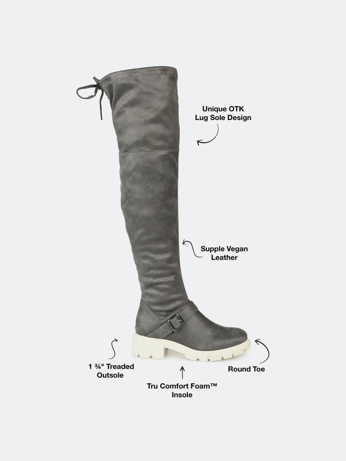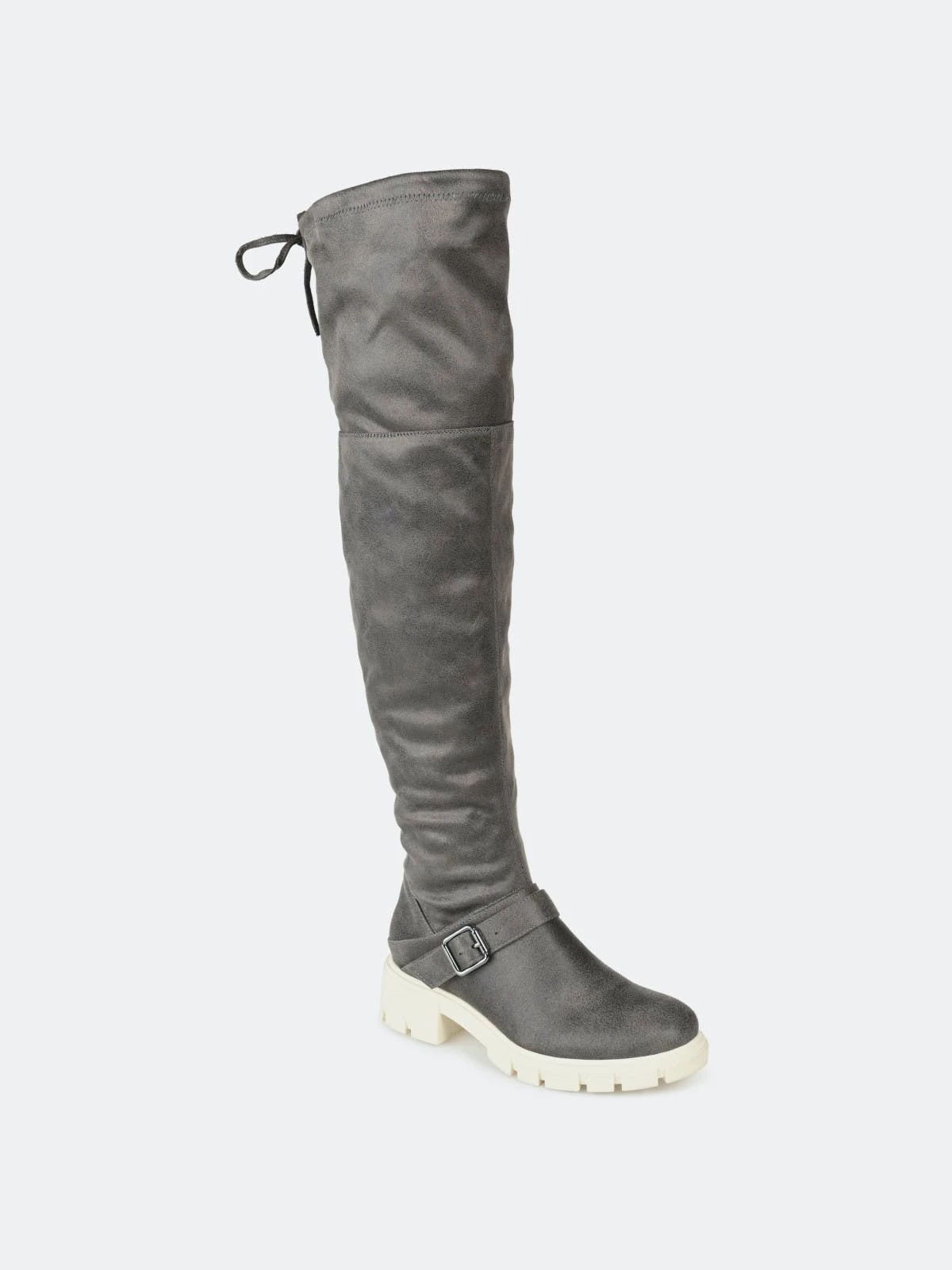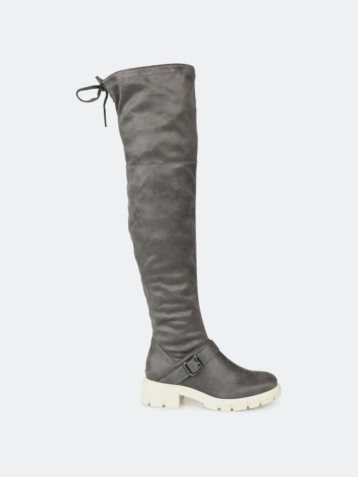Make a bold move in the Salisa boot by Journee Collection. This over-the-knee boot features an adjustable tie, a 4 mm Tru Comfort Foam™ footbed, and supple vegan leather for a comfortable fit. A chic lug sole and buckled strap finish this must-have.Heel Height: 1 3/4-inch. Heel Type: Block Heel. Platform Height: 1-inch. Shaft Height: 21 1/2 inches. Calf Circumference: 14 inches. Top Circumference: 17 1/2 inches. Shoe Width: Medium. Closure Type: Inside Zip. Toe Style: Round. Lining: Fabric. Upper Material: Vegan Leather. Outersole Material: Man-made. Footbed: 4 MM Tru Comfort Foam™. All measurements are approximate and were taken using a size 6. Please note measurements may vary slightly by size.
