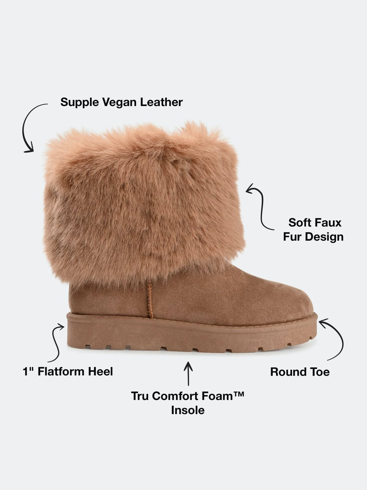 - Materials: Faux Leather Upper; Faux Fur Lining; Manmade Outsole; Tru Comfort Foam Footbed