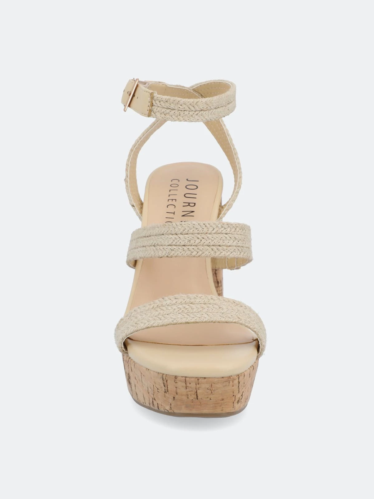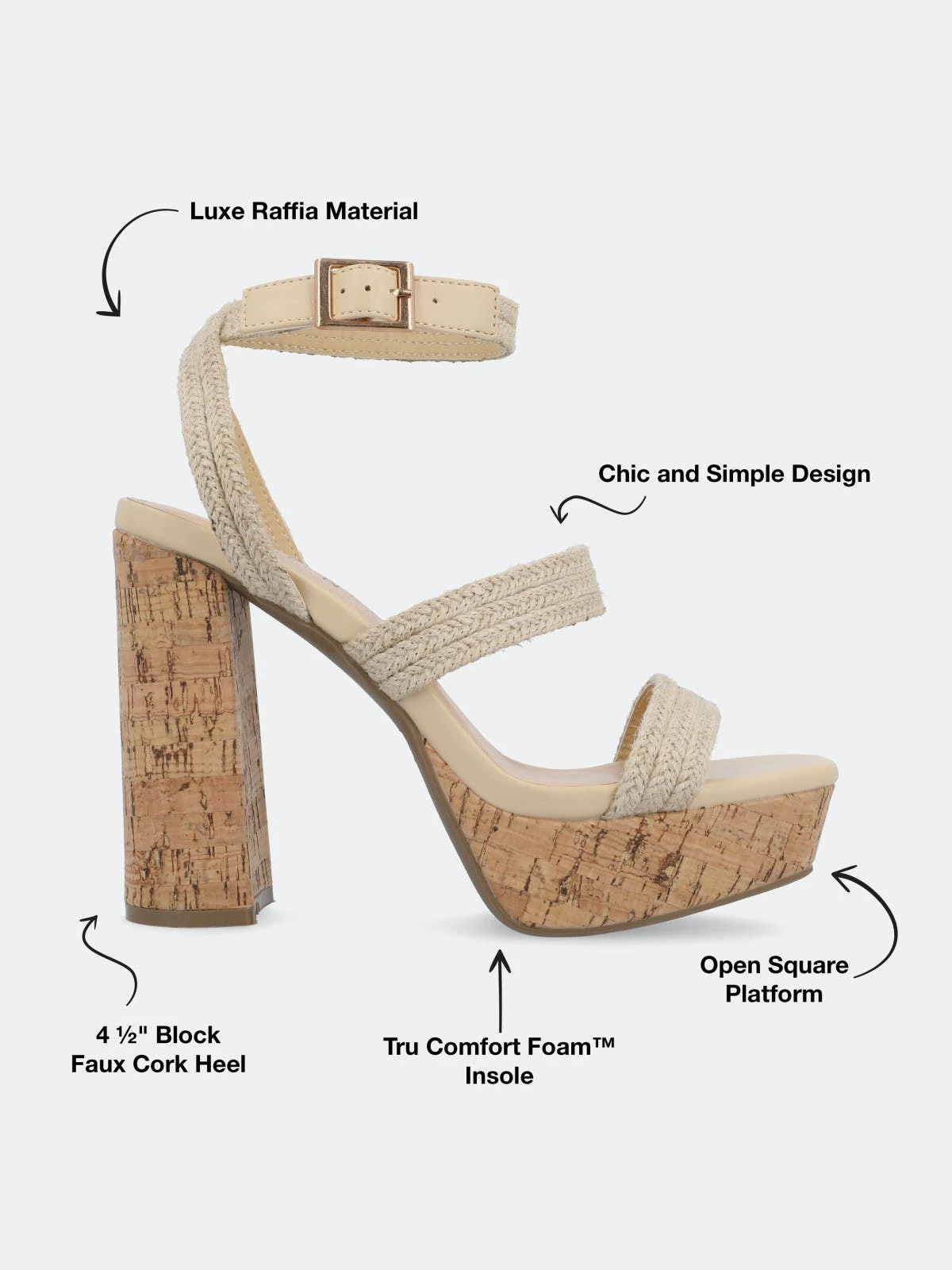 This sienne platform heels from journee collection will have you walking the night away in style and comfort. With their 4 mm tru comfort foam™ insole, raffia material, faux cork outsole, block heel, and multi-strap design, this look is sure to become a go-to. As a bonus, their buckled strap and open square toe are perfect for casual and dressy looks alike.
