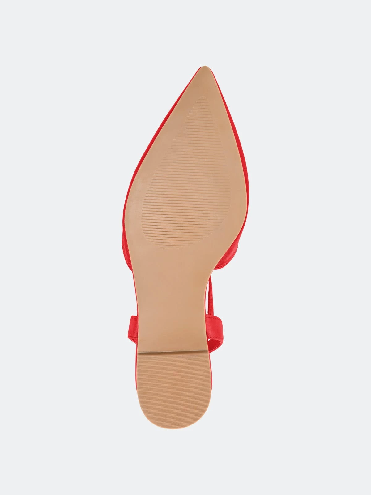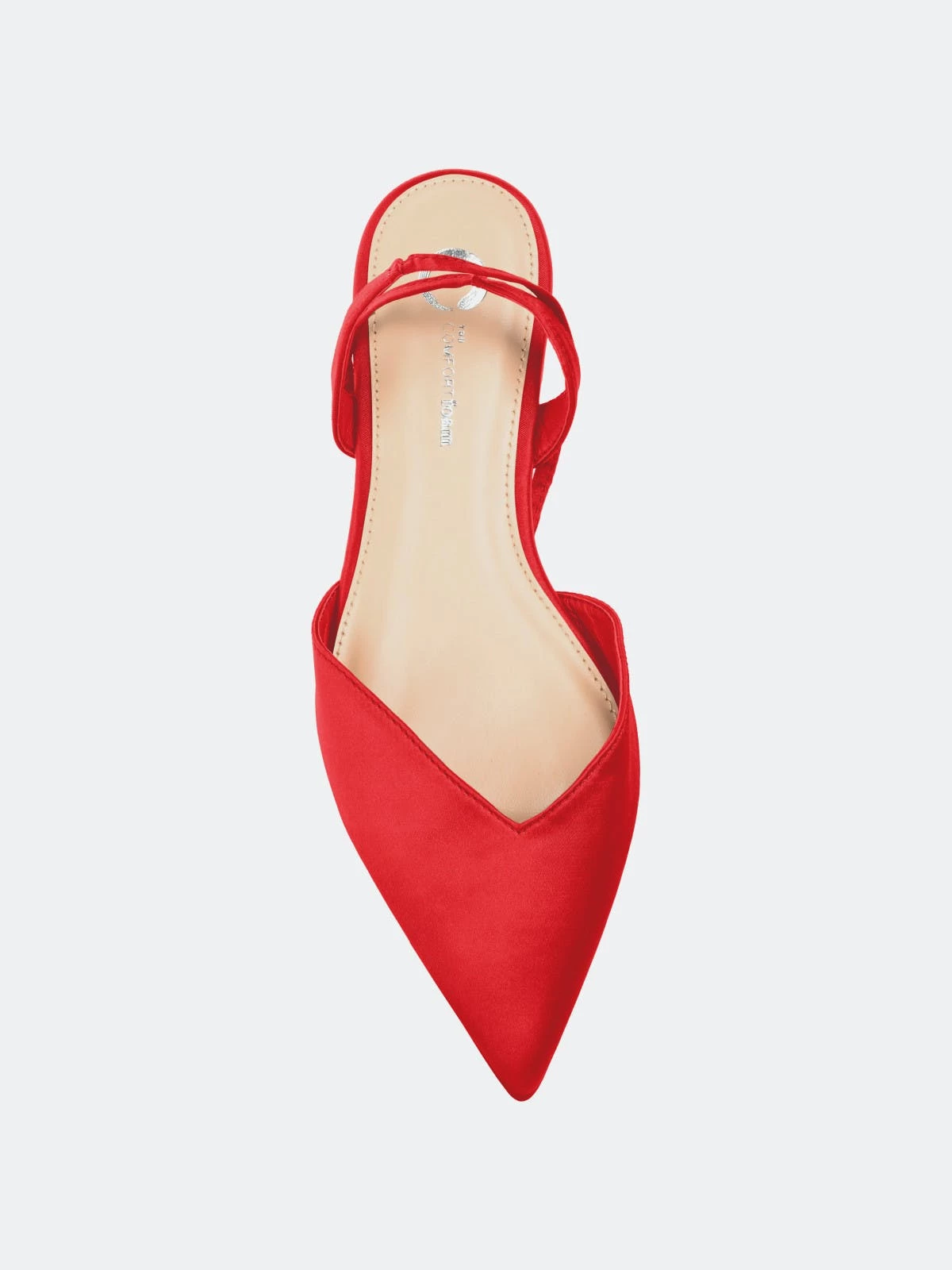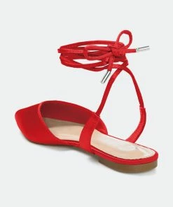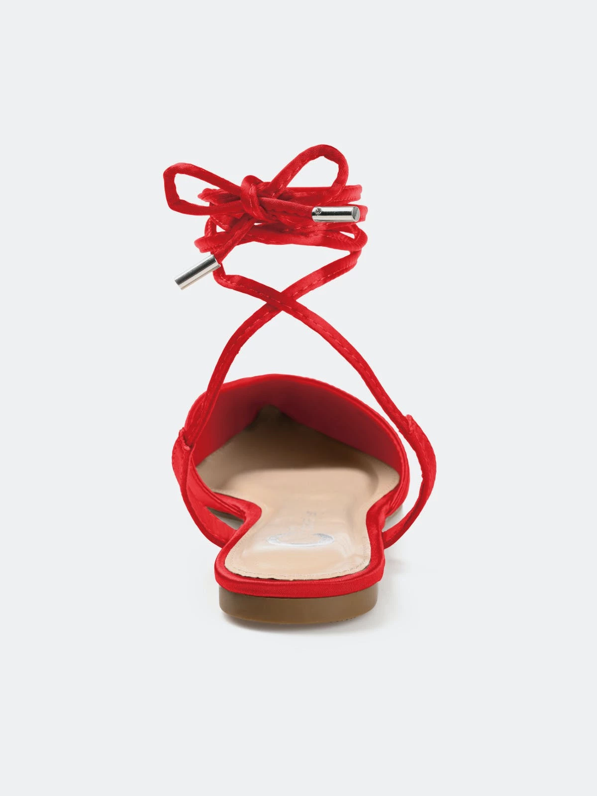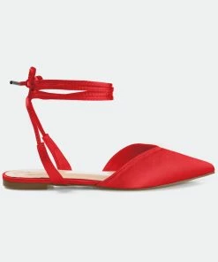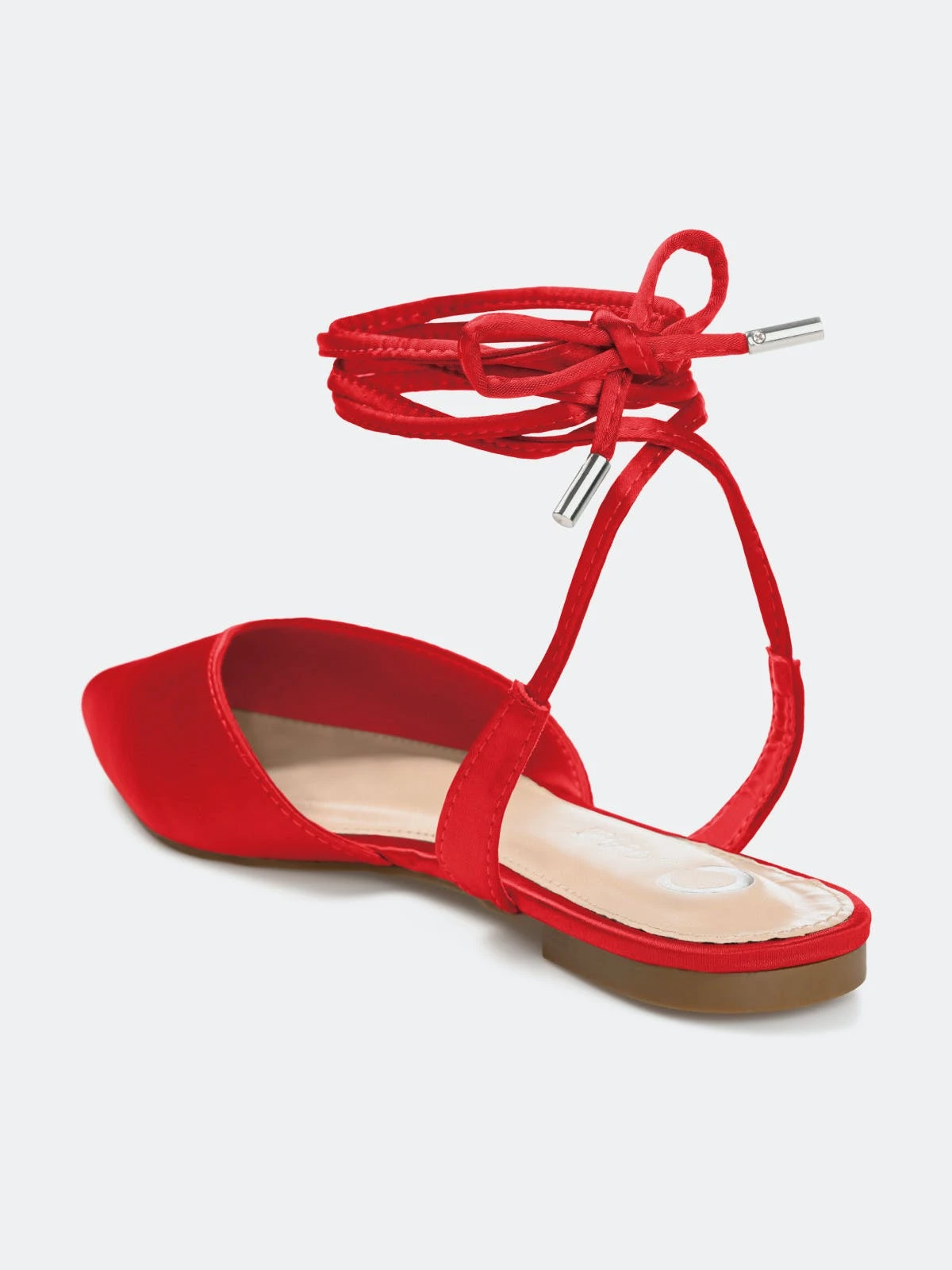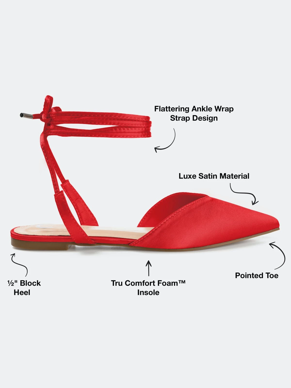 A party look without the fuss, the Theia by Journee Collection. This pointed-toe flat features silky satin uppers topped with a wraparound tie at the ankle for a ballet-inspired look. A 4 mm Tru Comfort Foam™ insole grounds the design for extra support.Heel Height:1/2-inchHeel Type: Block Heel Platform Height:Flat-inchShoe Width: MediumClosure Type: Tie UpStrap Type: Ankle WrapToe Style: PointedLining: Faux LeatherUpper Material: FabricOutersole Material: Man-madeFootbed: 4 MM Tru Comfort Foam™All measurements are approximate and were taken using a size 6. Please note measurements may vary slightly by size.
