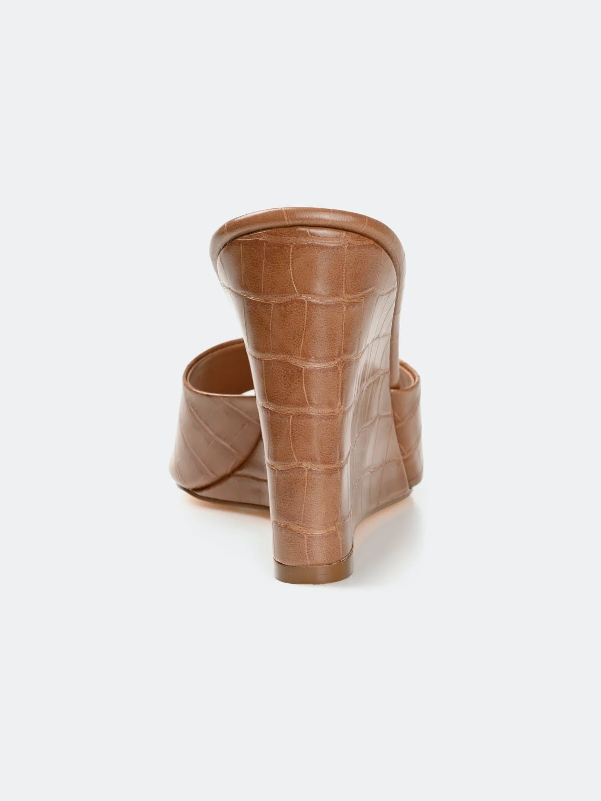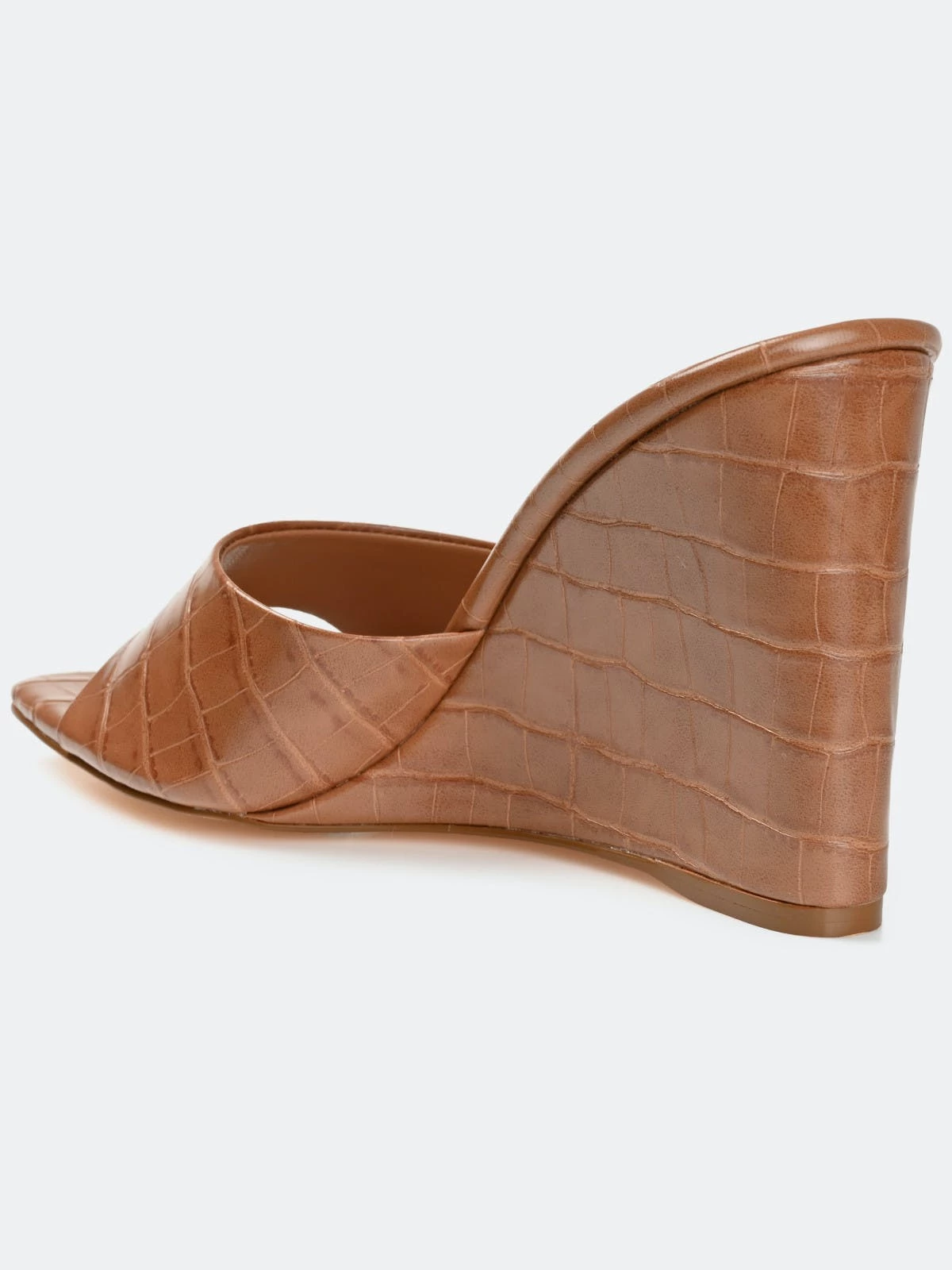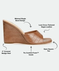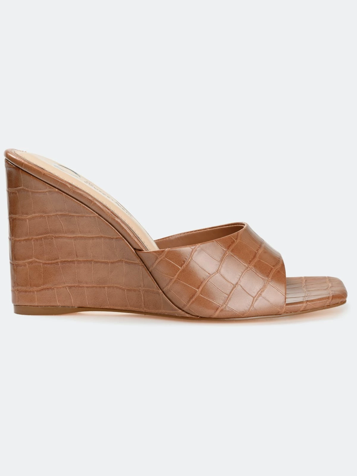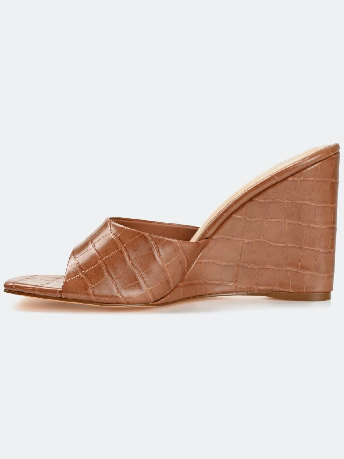 The comfortable heels you’ve been waiting for, the Vivvy by Journee Collection. This slip-on silhouette features croc textured vegan leather uppers complemented by a 4 mm Tru Comfort Foam™ footbed for a comfortable fit. A simple band at the toe and a lofty wedge heel define the shape.Heel Height:4-inchHeel Type: Wedge Platform Height:Flat-inchShoe Width: MediumClosure Type: Slip-onToe Style: OpenLining: Faux LeatherUpper Material: Vegan LeatherOutersole Material: Man-madeFootbed: 4 MM Tru Comfort Foam™All measurements are approximate and were taken using a size 6. Please note measurements may vary slightly by size.