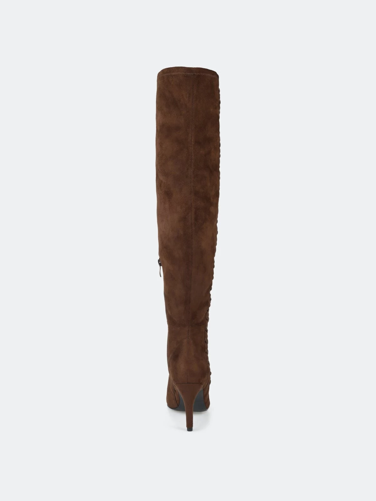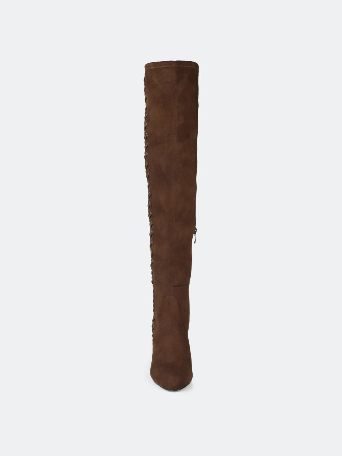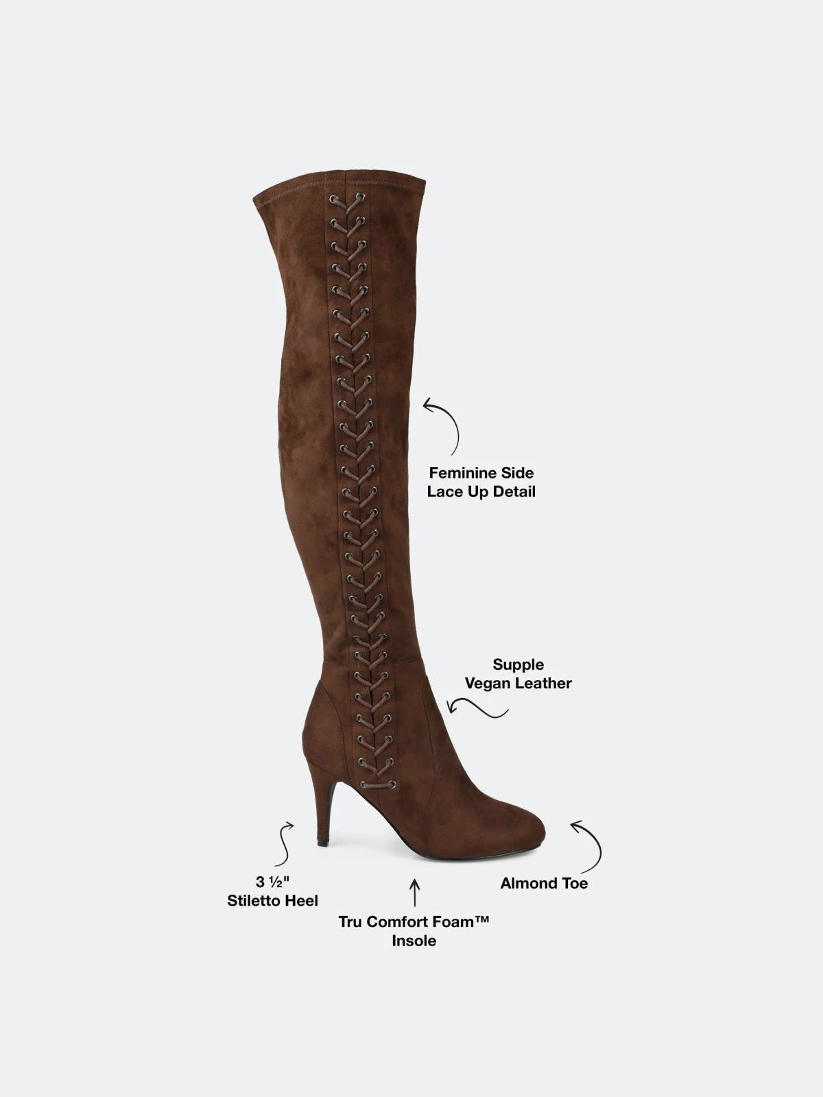Get a look that serves up sass and class with the Abie boot by Journee Collection. This wide-calf boot features vegan leather uppers that rise above the knees, detailed with a retro lace-up design with metal accents. A slender stiletto high heel and a 4 mm Tru Comfort Foam™ footbed finish this over-the-knee style.Heel Height: 3 1/2-inch. Heel Type: Stiletto. Platform Height: Flat-inch. Shaft Height: 20 inches. Calf Circumference: 14 1/2 inches. Top Circumference: 16 1/2 inches. Shoe Width: Medium. Closure Type: Inside Zip. Toe Style: Almond. Lining: Fabric. Upper Material: Vegan Leather. Outersole Material: Man-made. Footbed: 4 MM Tru Comfort Foam™. All measurements are approximate and were taken using a size 6. Please note measurements may vary slightly by size.