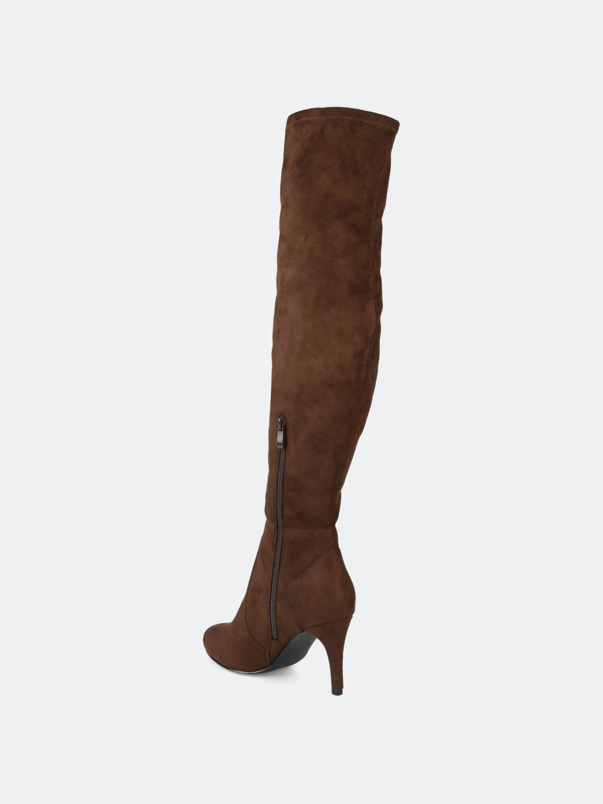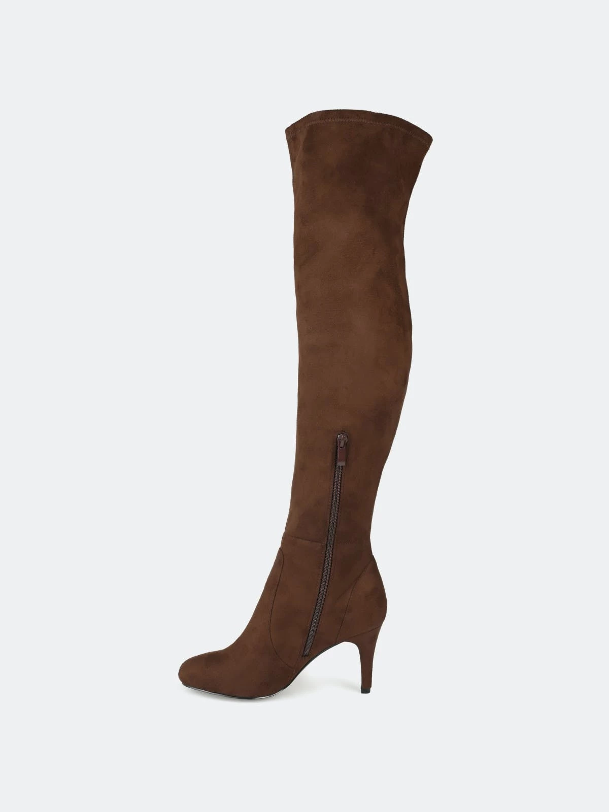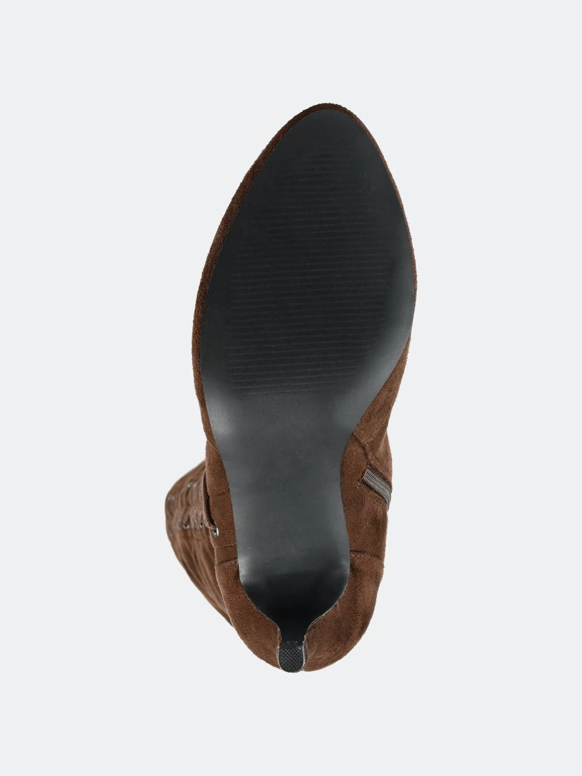 Get a look that serves up sass and class with the Abie boot by Journee Collection. This wide-calf boot features vegan leather uppers that rise above the knees, detailed with a retro lace-up design with metal accents. A slender stiletto high heel and a 4 mm Tru Comfort Foam™ footbed finish this over-the-knee style.Heel Height: 3 1/2-inch. Heel Type: Stiletto. Platform Height: Flat-inch. Shaft Height: 20 inches. Calf Circumference: 14 1/2 inches. Top Circumference: 16 1/2 inches. Shoe Width: Medium. Closure Type: Inside Zip. Toe Style: Almond. Lining: Fabric. Upper Material: Vegan Leather. Outersole Material: Man-made. Footbed: 4 MM Tru Comfort Foam™. All measurements are approximate and were taken using a size 6. Please note measurements may vary slightly by size.