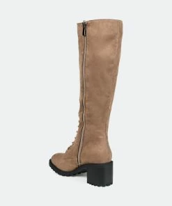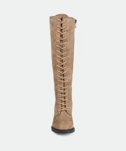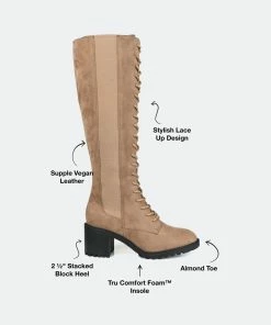 Go for a bold look this fall with the Jenicca boots by Journee Collection. This knee-high boot is detailed with a stacked block heel and a classic lace-up closure. Supple vegan leather, a wide-calf, and a 4 mm Tru Comfort Foam™ insole finish this retro look for a comfortable fit.Heel Height: 2 1/2-inch. Heel Type: Stacked. Platform Height: 1/2-inch. Shaft Height: 14 1/2 inches. Calf Circumference: 14 1/2 inches. Top Circumference: 15 inches. Shoe Width: Medium. Closure Type: Inside Zip. Toe Style: Almond. Lining: Fabric. Upper Material: Vegan Leather. Outersole Material: Man-made. Footbed: 4 MM Tru Comfort Foam™. All measurements are approximate and were taken using a size 6. Please note measurements may vary slightly by size.