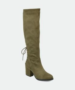 Change it up with the Wide Calf Leeda boot by Journee Collection. This adorable heeled boot features a lace-up detail in the back with a bow to finish it off. There is also a stretch gore on the side as needed to extend. You’ll look fabulous in this beautiful faux suede heeled boot.Heel Height: 2 3/4-inch. Heel Type: Block Heel. Platform Height: 1/2-inch. Shaft Height: 16 inches. Calf Circumference: 15 inches. Top Circumference: 15 1/2 inches. Shoe Width: Medium. Closure Type: Inside Zip. Toe Style: Almond. Lining: Faux Fur. Upper Material: Faux Suede. Outersole Material: Faux Suede over Synthetic. Footbed: 4 MM Tru Comfort Foam™. All measurements are approximate and were taken using a size 6. Please note measurements may vary slightly by size.