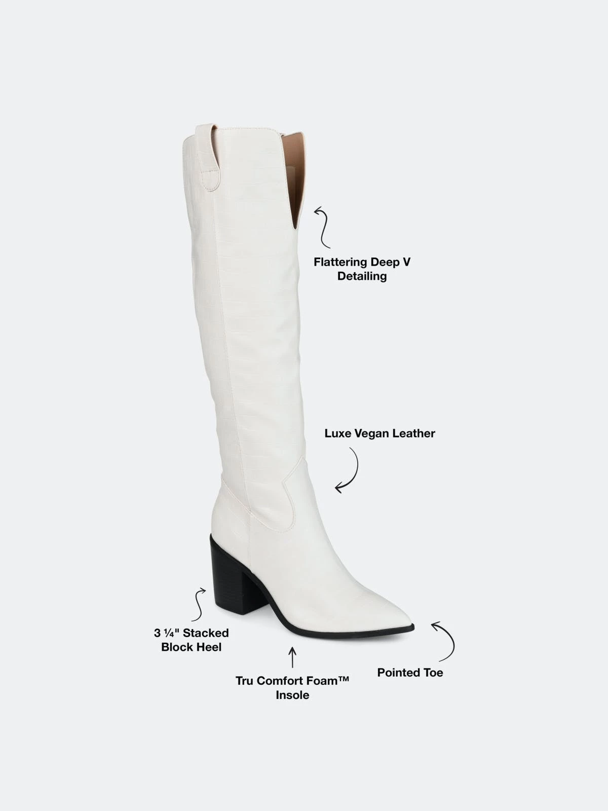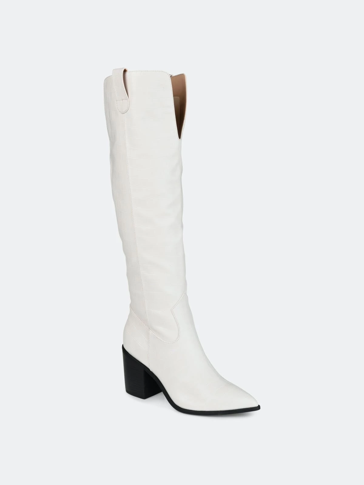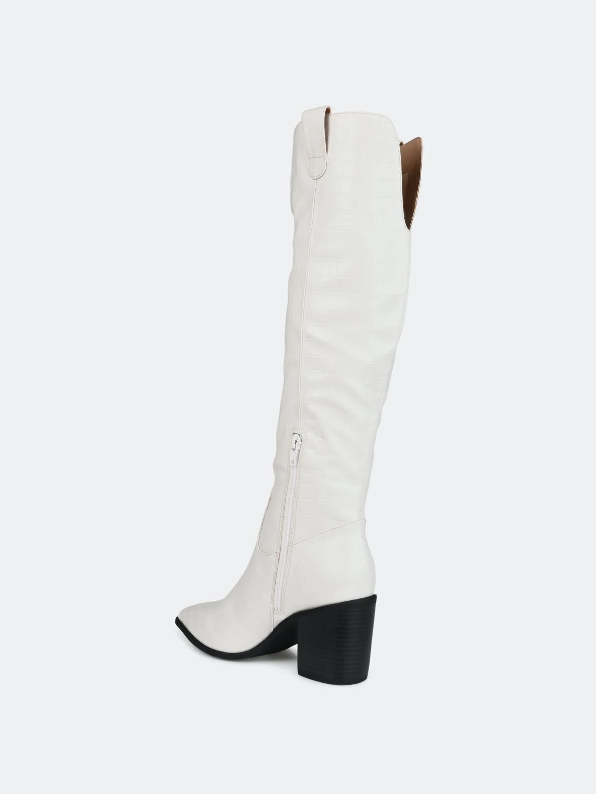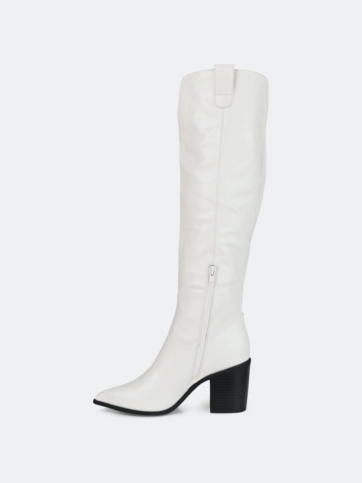 Do you prefer the city or the country? Embrace both sides with the Therese boot by Journee Collection. A stacked block heel and croc textured vegan leather detail this knee-high boot for a sassy look. This rodeo-inspired design features a wide-calf and a 4 mm Tru Comfort Foam™ insole for supportive and comfortable wear.Heel Height: 3 1/4-inch. Heel Type: Stacked. Platform Height: Flat-inch. Shaft Height: 16 1/2 inches. Calf Circumference: 15 1/2 inches. Top Circumference: 16 inches. Shoe Width: Medium. Closure Type: Inside Zip. Toe Style: Pointed. Lining: Fabric. Upper Material: Vegan Leather. Outersole Material: Man-made. Footbed: 4 MM Tru Comfort Foam™. All measurements are approximate and were taken using a size 6. Please note measurements may vary slightly by size.