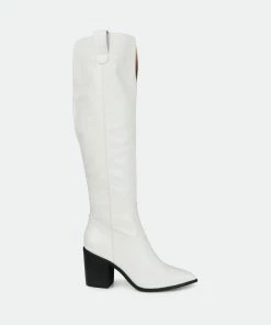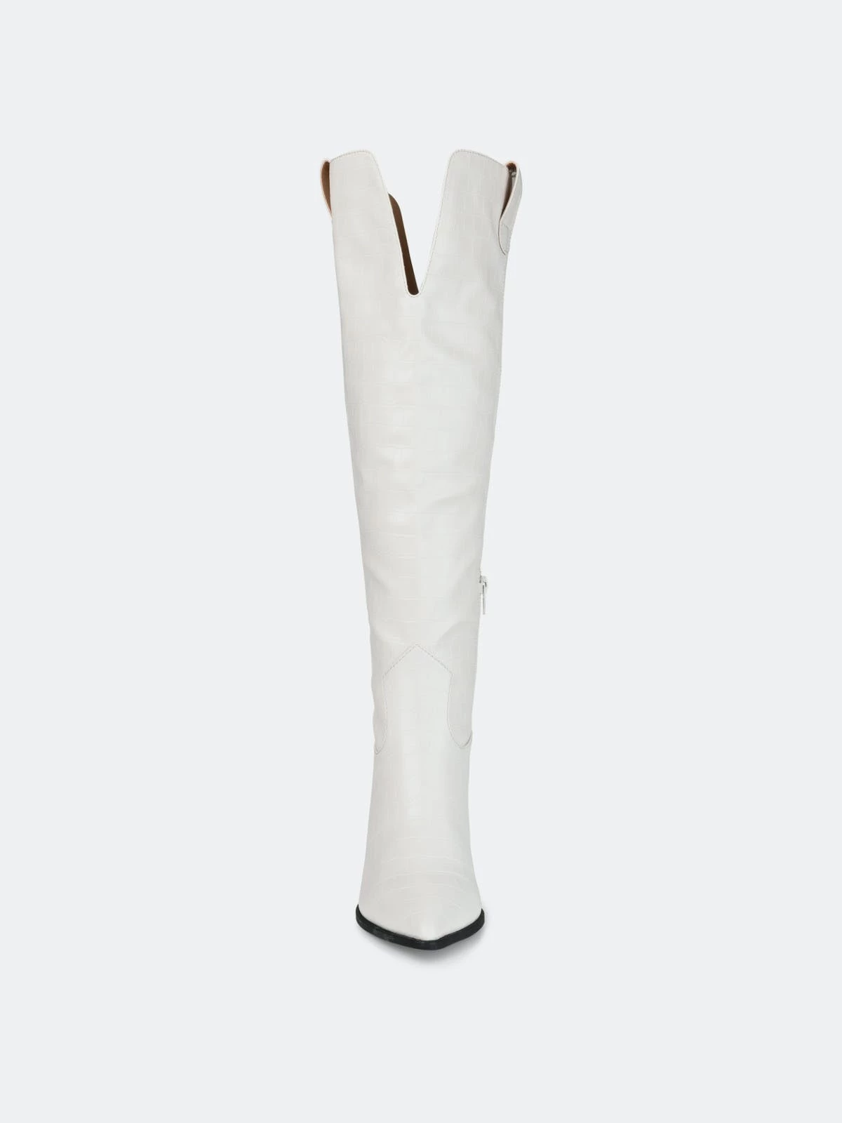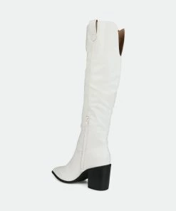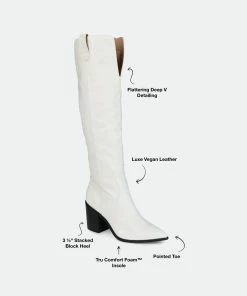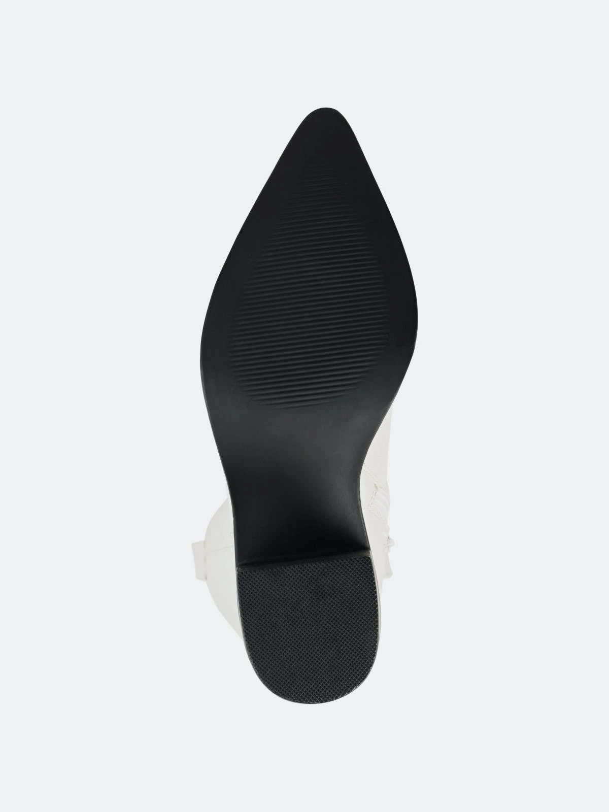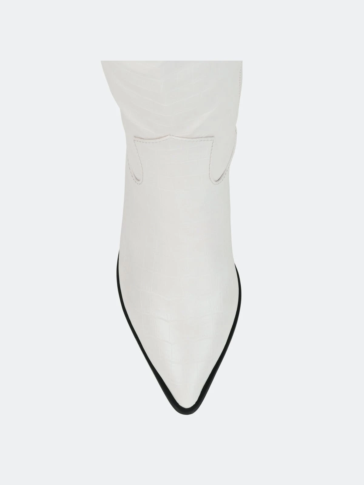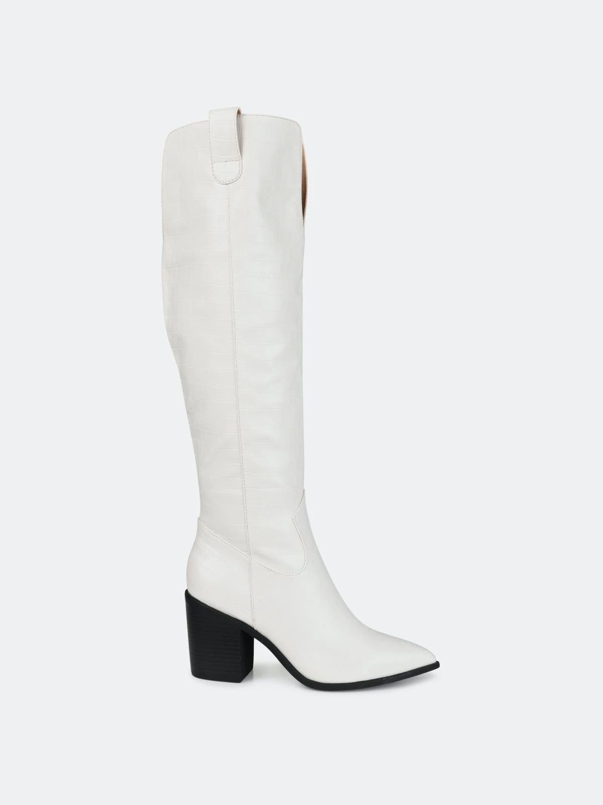 Do you prefer the city or the country? Embrace both sides with the Therese boot by Journee Collection. A stacked block heel and croc textured vegan leather detail this knee-high boot for a sassy look. This rodeo-inspired design features a wide-calf and a 4 mm Tru Comfort Foam™ insole for supportive and comfortable wear.Heel Height: 3 1/4-inch. Heel Type: Stacked. Platform Height: Flat-inch. Shaft Height: 16 1/2 inches. Calf Circumference: 15 1/2 inches. Top Circumference: 16 inches. Shoe Width: Medium. Closure Type: Inside Zip. Toe Style: Pointed. Lining: Fabric. Upper Material: Vegan Leather. Outersole Material: Man-made. Footbed: 4 MM Tru Comfort Foam™. All measurements are approximate and were taken using a size 6. Please note measurements may vary slightly by size.