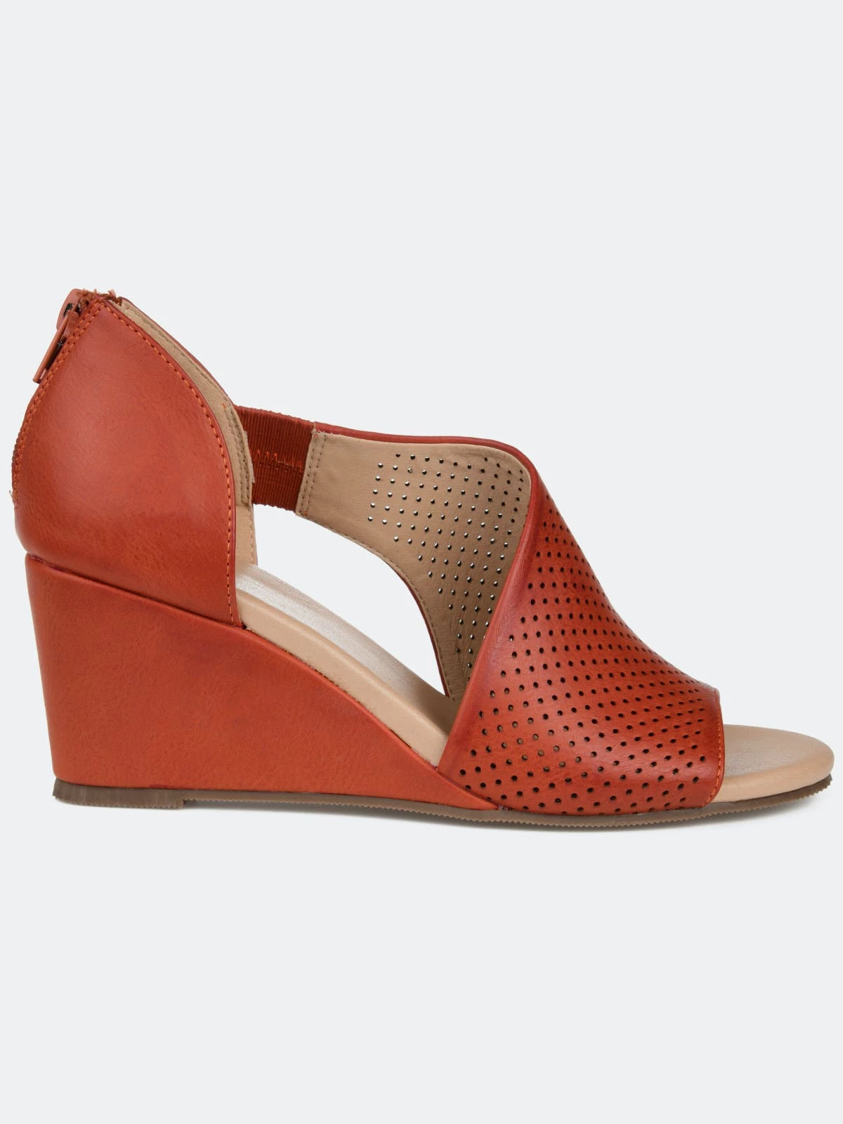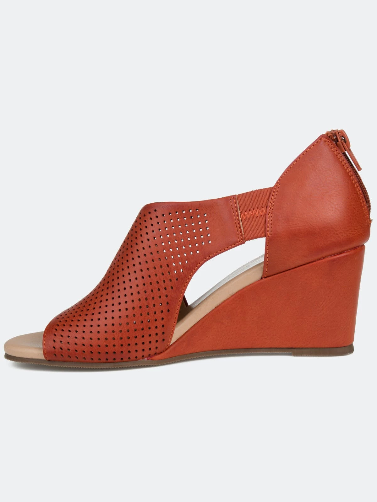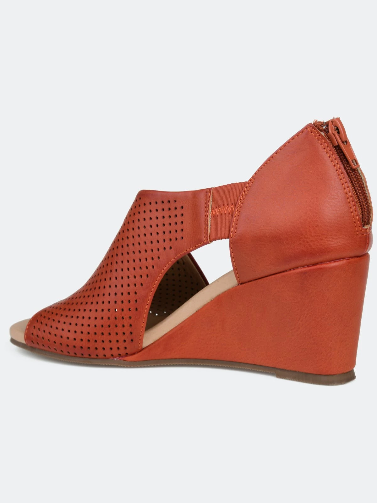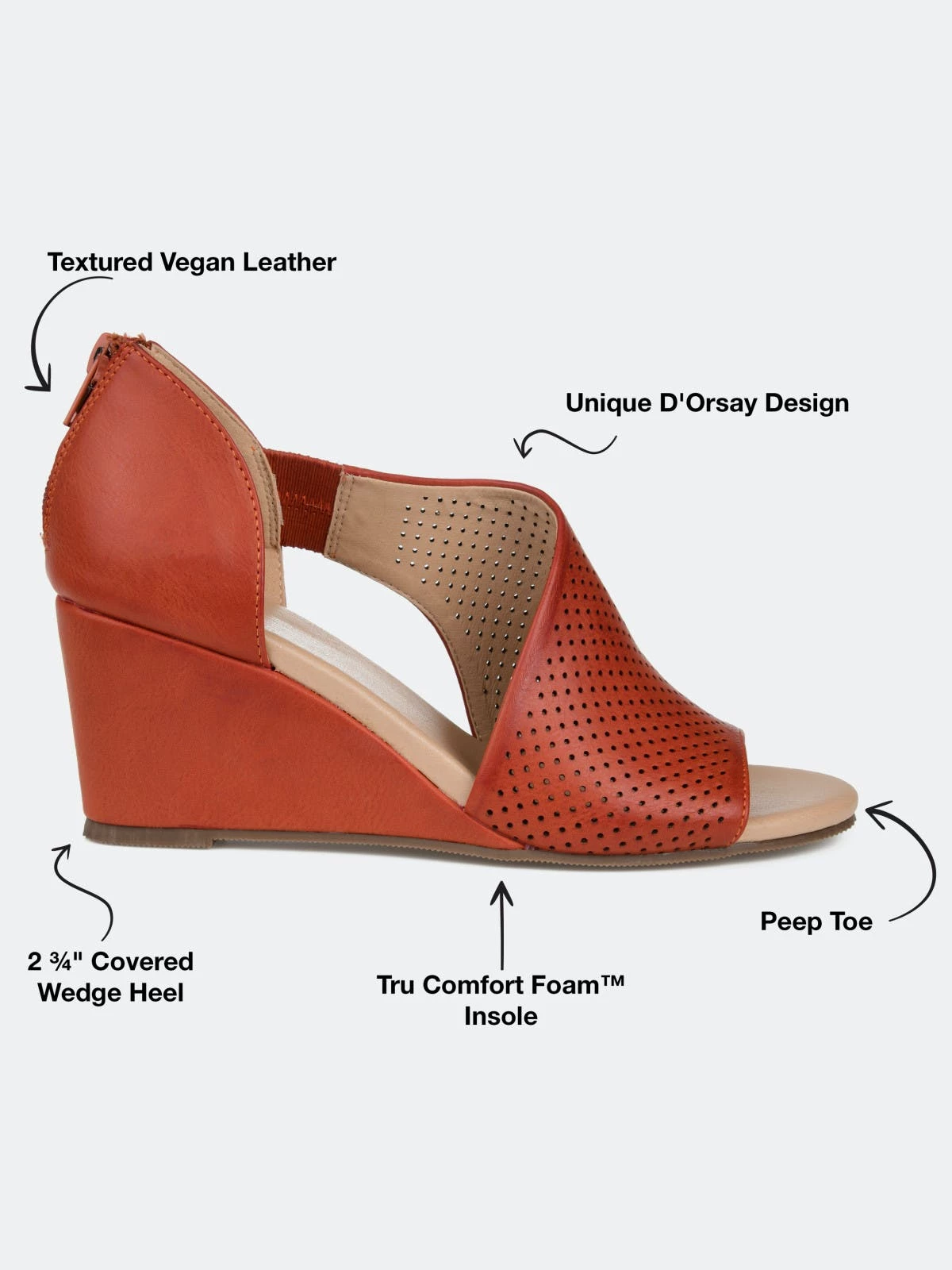 Add a touch of texture to your look with the Aretha heels by Journee Collection. This trendy style is crafted with perforated vegan leather uppers detailed with a covered wedge heel and a darling peep toe. A stretch accent, side cutout, and 4 mm Tru Comfort Foam™ footbed finish this wide-width style for all-day comfort.Heel Height:2 3/4-inchHeel Type: Wedge Platform Height:1/2-inchShoe Width: WideClosure Type: Back Heel ZipStrap Type: Ankle CuffToe Style: PeepLining: Faux LeatherUpper Material: Faux LeatherOutersole Material: Faux Leather over SyntheticFootbed: 4 MM Tru Comfort Foam™All measurements are approximate and were taken using a size 6. Please note measurements may vary slightly by size.