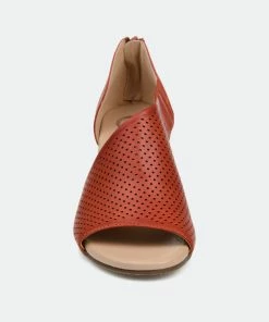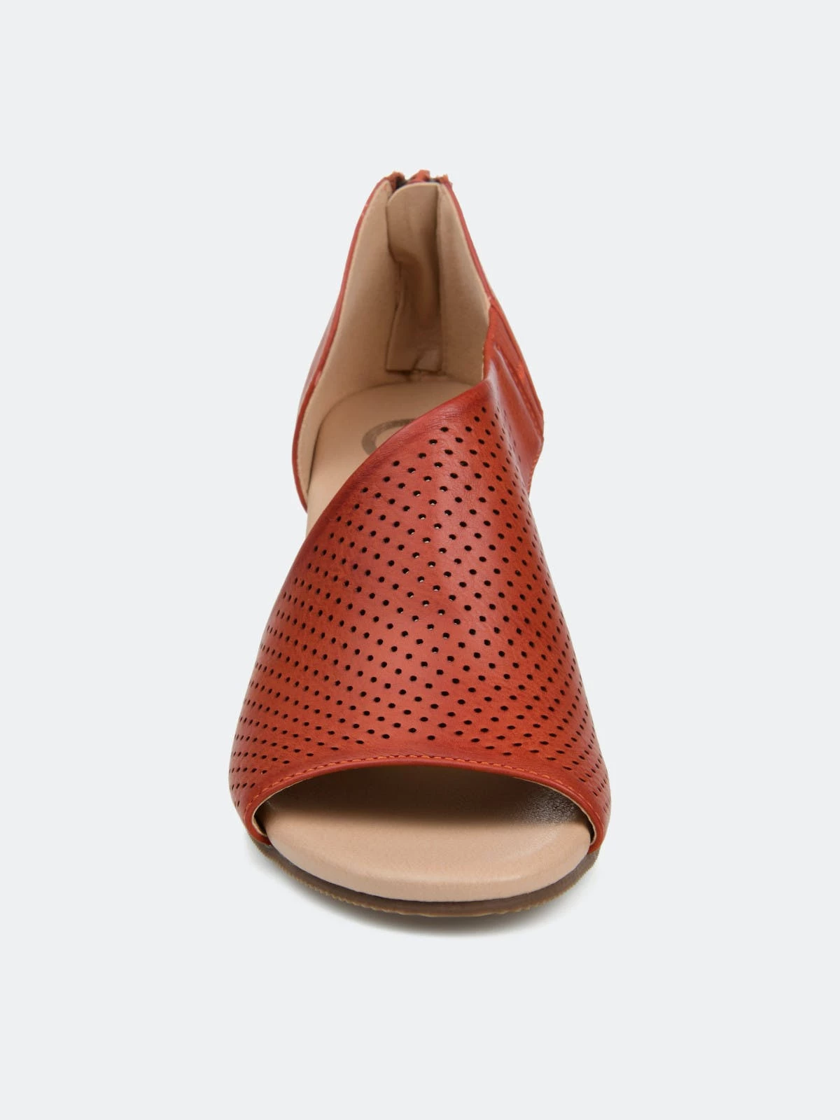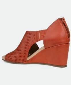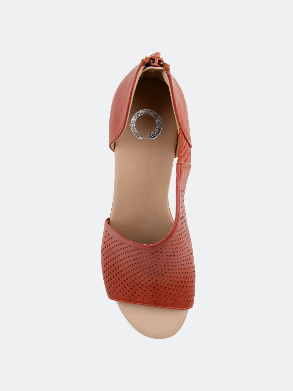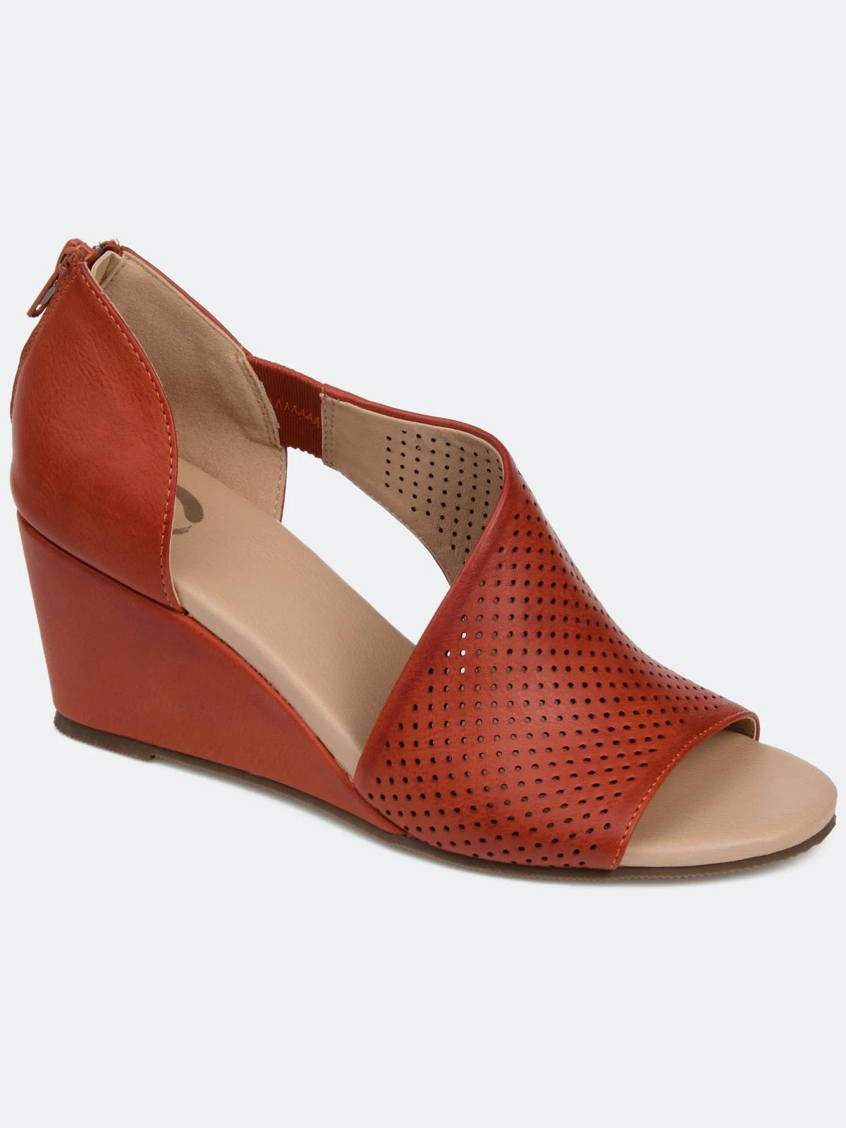 Add a touch of texture to your look with the Aretha heels by Journee Collection. This trendy style is crafted with perforated vegan leather uppers detailed with a covered wedge heel and a darling peep toe. A stretch accent, side cutout, and 4 mm Tru Comfort Foam™ footbed finish this wide-width style for all-day comfort.Heel Height:2 3/4-inchHeel Type: Wedge Platform Height:1/2-inchShoe Width: WideClosure Type: Back Heel ZipStrap Type: Ankle CuffToe Style: PeepLining: Faux LeatherUpper Material: Faux LeatherOutersole Material: Faux Leather over SyntheticFootbed: 4 MM Tru Comfort Foam™All measurements are approximate and were taken using a size 6. Please note measurements may vary slightly by size.