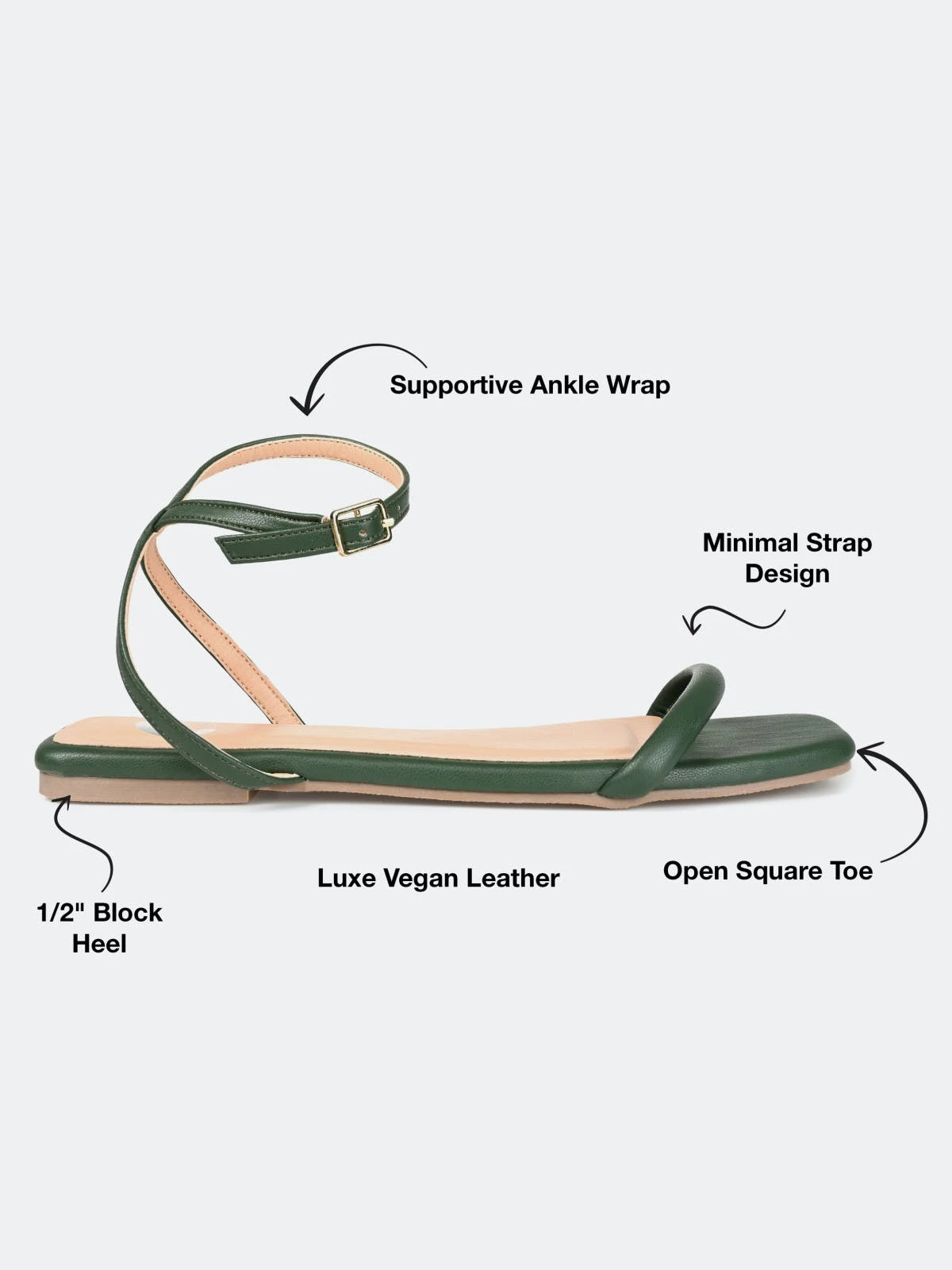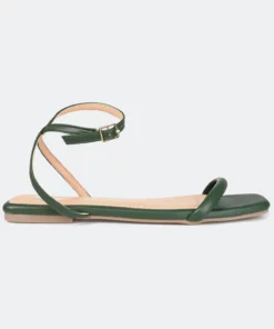 Simple and sleek, the Veena by Journee Collection. With slender strap details at the toes and a padded footbed, you’ll always feel comfortable in this style. This sassy sandal is complete with supple vegan leather uppers and a buckle closure.Heel Height:1/2-inchHeel Type: Block Heel Platform Height:Flat-inchShoe Width: MediumClosure Type: BuckleStrap Type: AnkleToe Style: OpenLining: Faux LeatherUpper Material: Vegan LeatherOutersole Material: Man-madeFootbed: PaddedAll measurements are approximate and were taken using a size 6. Please note measurements may vary slightly by size.