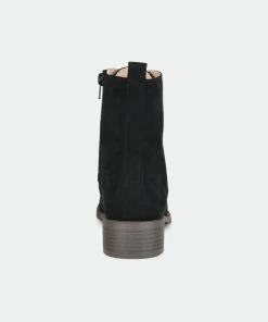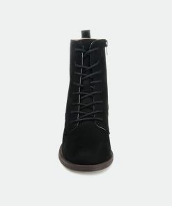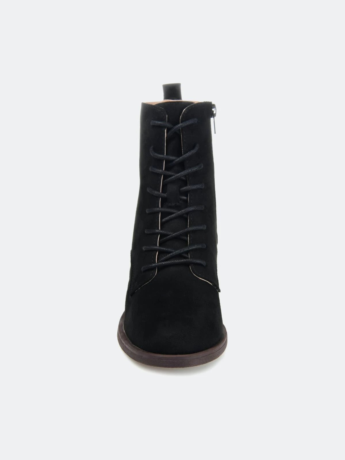 A classic lace-up detail highlights the vamp of this style-savvy version of a combat boot. The Vienna by Journee Collection is an almond-toe silhouette rendered with soft vegan leather uppers with a side zipper entry. A stacked block heel and cushioned footbed complete the look for a comfortable lift.Heel Height: 1 1/2-inch. Heel Type: Block Heel. Platform Height: 1/2-inch. Shaft Height: 5 1/2 inches. Top Circumference: 10 inches. Shoe Width: Medium. Closure Type: Inside Zip. Toe Style: Almond. Lining: Fabric. Upper Material: Vegan Leather. Outersole Material: Man-made. Footbed: Cushioned. All measurements are approximate and were taken using a size 6. Please note measurements may vary slightly by size.