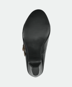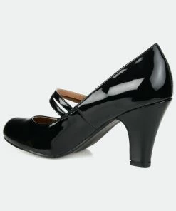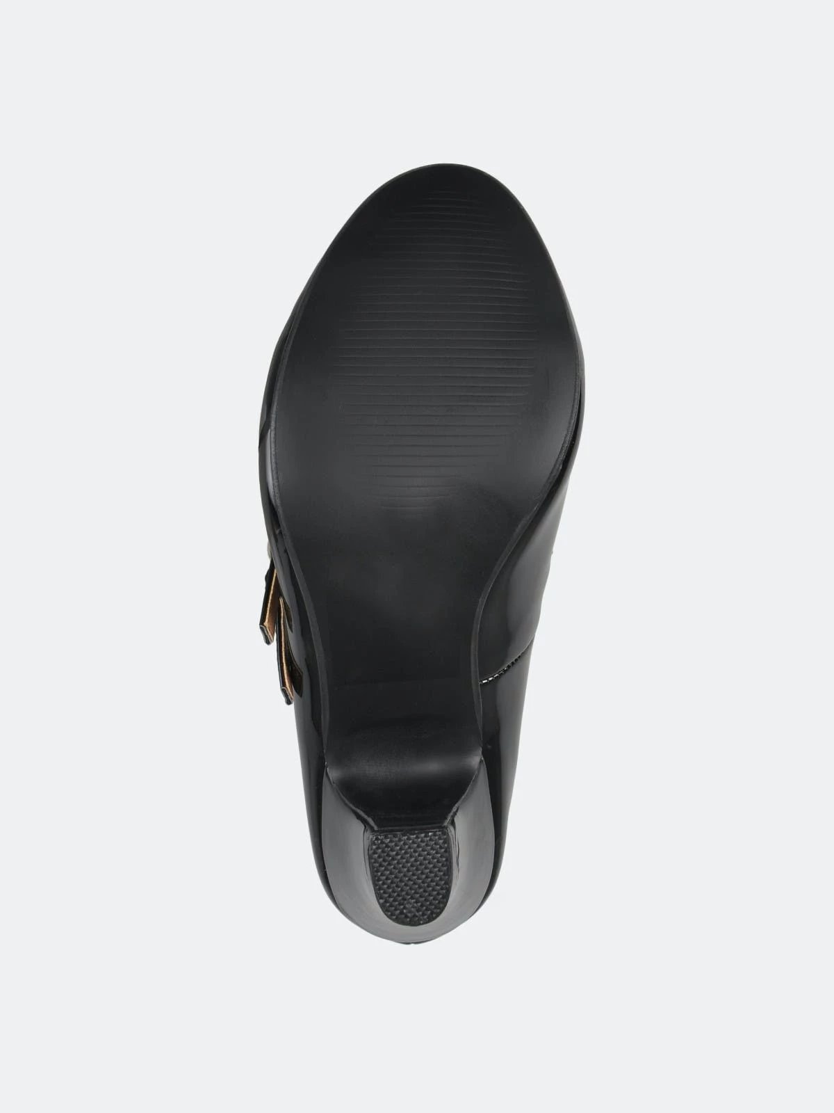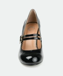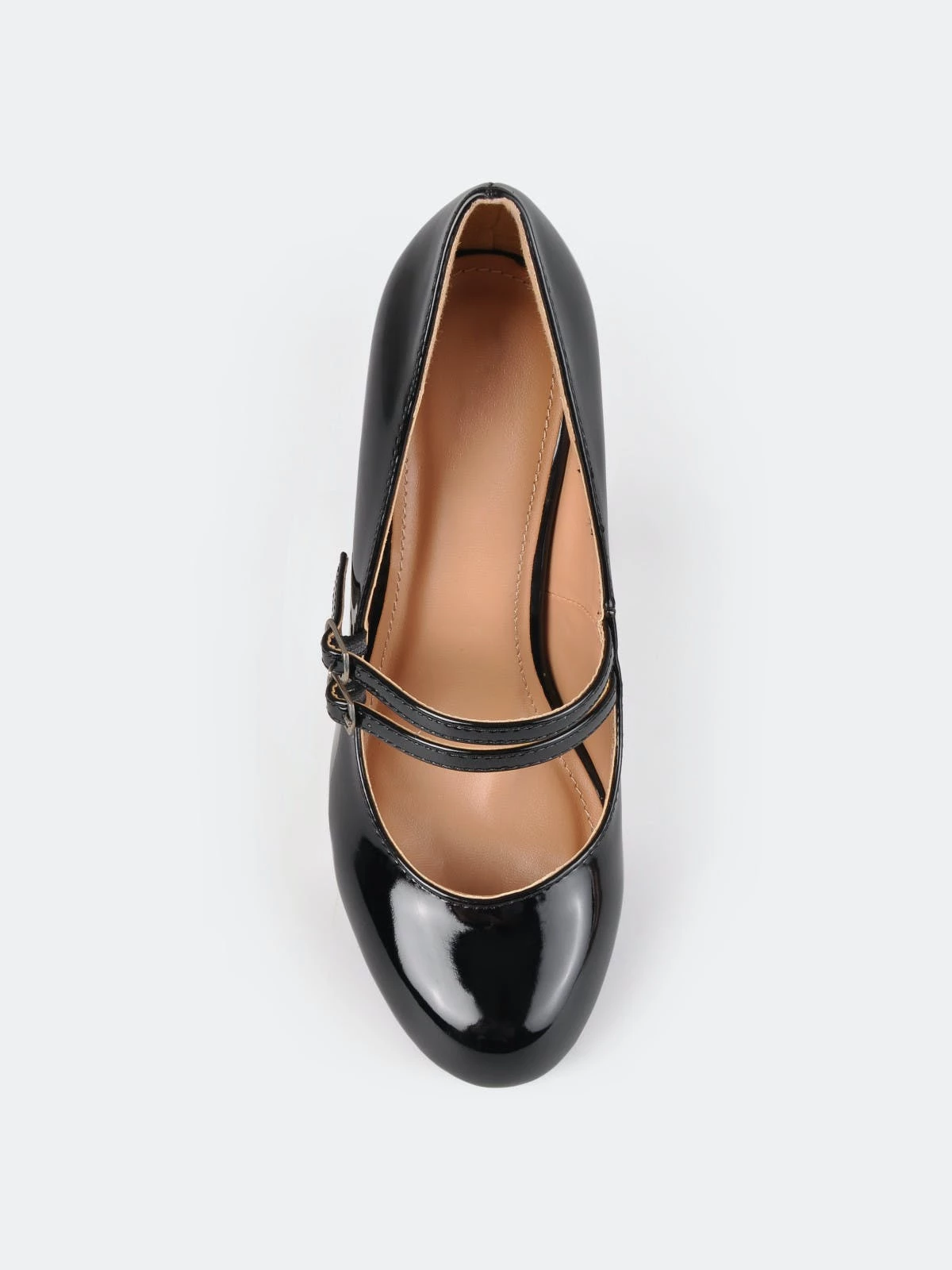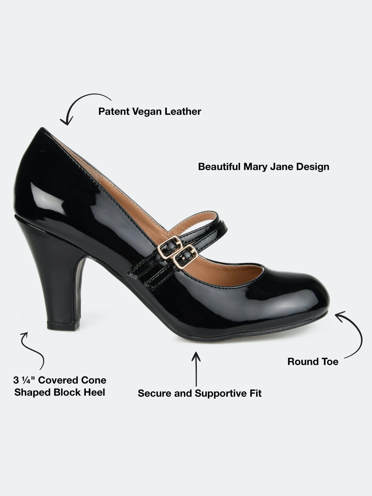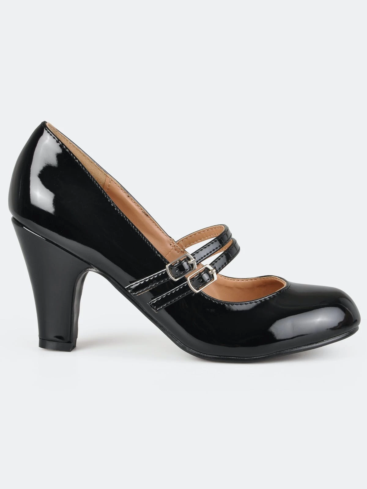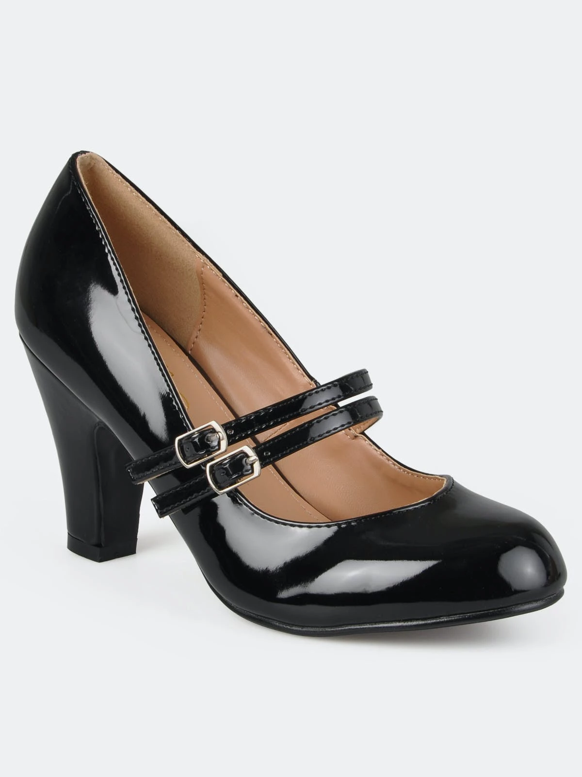 Show off classic style in Mary Jane pumps by Journee Collection. These pumps feature faux leather uppers and highlight a double strap design with dainty buckle accents across the tops of each shoe.Heel Height:3 1/4-inchHeel Type: Block Heel Platform Height:1/2-inchShoe Width: MediumClosure Type: BuckleToe Style: RoundLining: Faux LeatherUpper Material: Faux LeatherOutersole Material: Faux Leather over SyntheticFootbed: PaddedAll measurements are approximate and were taken using a size 6. Please note measurements may vary slightly by size.
