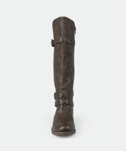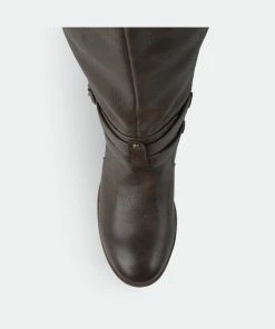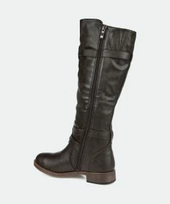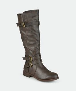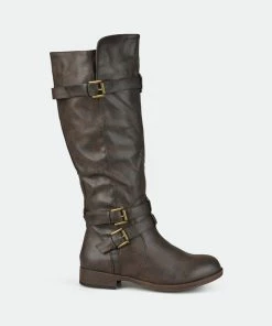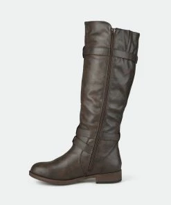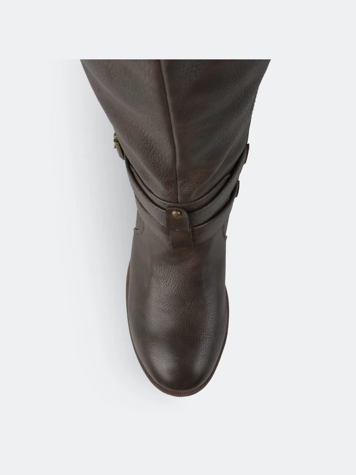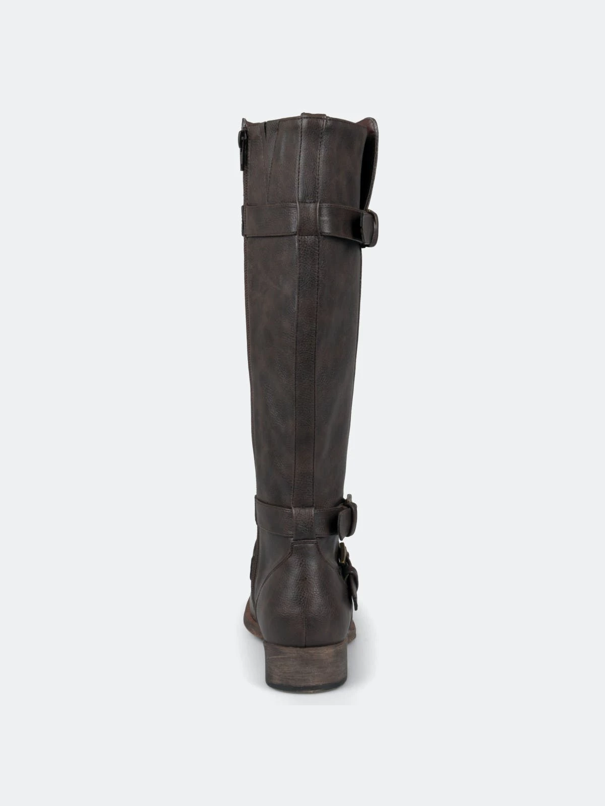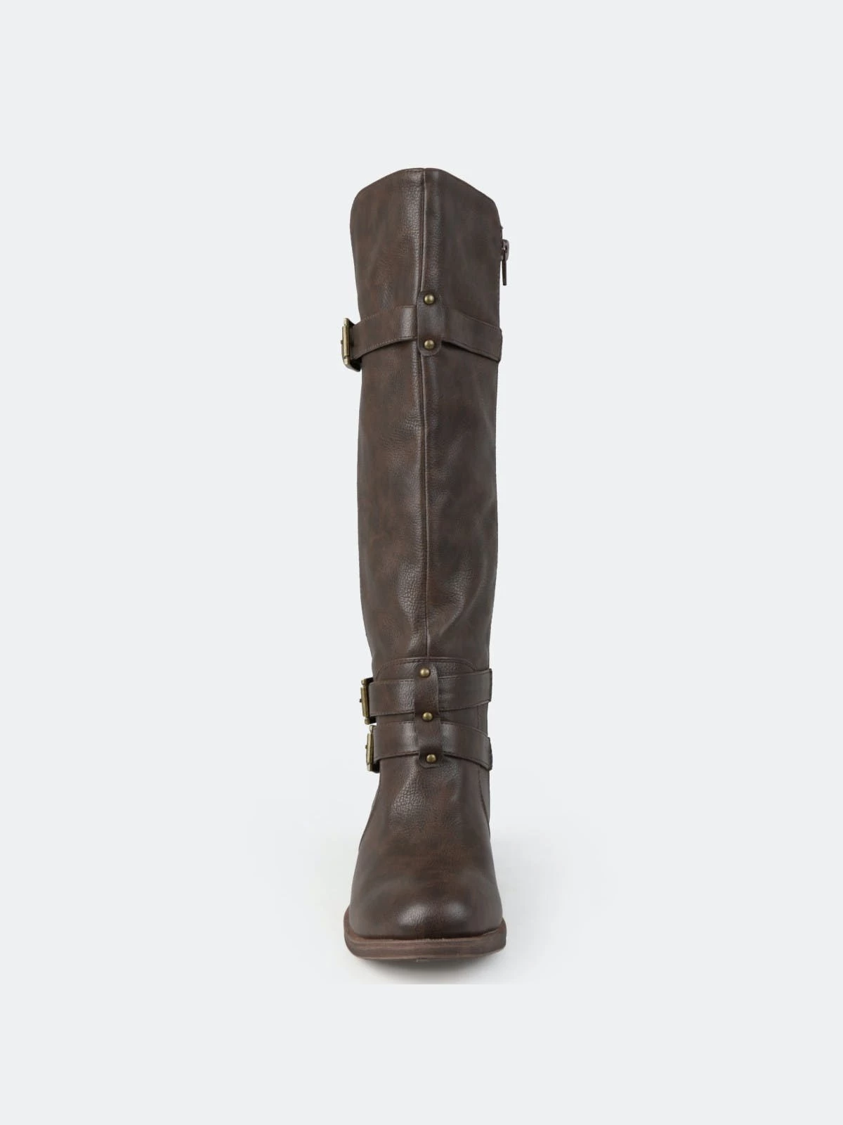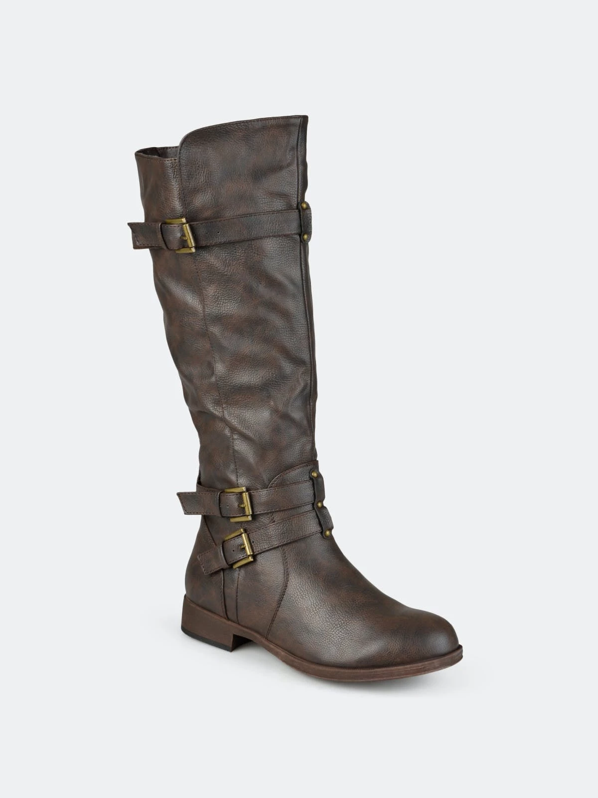 These stylish wide calf boots by Journee Collection feature premium faux leather uppers that rise below the knees and highlight subtle top-stitched detail and dainty straps with buckles at the ankles and on the shafts.Heel Height: 1-inch. Heel Type: Stacked. Platform Height: 1/2-inch. Shaft Height: 16 1/2 inches. Calf Circumference: 15 1/2 inches. Top Circumference: 16 1/2 inches. Shoe Width: Medium. Closure Type: Inside Zip. Toe Style: Round. Lining: Fabric. Upper Material: Faux Leather. Outersole Material: Man-made. Footbed: Padded. All measurements are approximate and were taken using a size 6. Please note measurements may vary slightly by size.