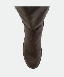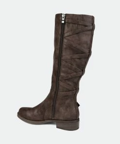 If you love a good riding boot, then you’ll love the Carly boot by Journee Collection. This wide calf boot has such a different look to it with the zig zag lace detail. It’s so quirky and can easily spice up any winter outfit. This boot also features an almond toe shape and a distressed coloring.Heel Height: 1 1/2-inch. Heel Type: Stacked. Platform Height: 1/2-inch. Shaft Height: 14 inches. Calf Circumference: 15 3/4 inches. Top Circumference: 16 inches. Shoe Width: Medium. Closure Type: Inside Zip. Toe Style: Almond. Lining: Fabric. Upper Material: Faux Leather. Outersole Material: Man-made. Footbed: Padded. All measurements are approximate and were taken using a size 6. Please note measurements may vary slightly by size.