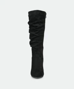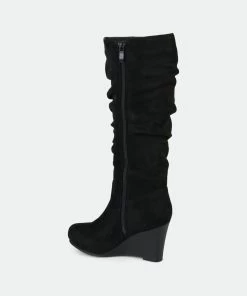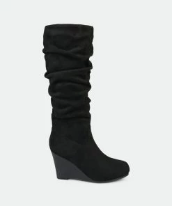Show off stylish design in slouchy wedge boots by Journee Collection. These mid-calf boots are made with soft faux suede uppers with slouchy detail and an inside zipper. Stacked wedge heels provide attractive lift and round toes finish the style.Heel Height: 3-inch. Heel Type: Wedge. Platform Height: 1-inch. Shaft Height: 15 inches. Calf Circumference: 16 1/2 inches. Top Circumference: 16 1/2 inches. Shoe Width: Medium. Closure Type: Inside Zip. Toe Style: Round. Lining: Fabric. Upper Material: Faux Suede. Outersole Material: Man-made. Footbed: Padded. All measurements are approximate and were taken using a size 6. Please note measurements may vary slightly by size.