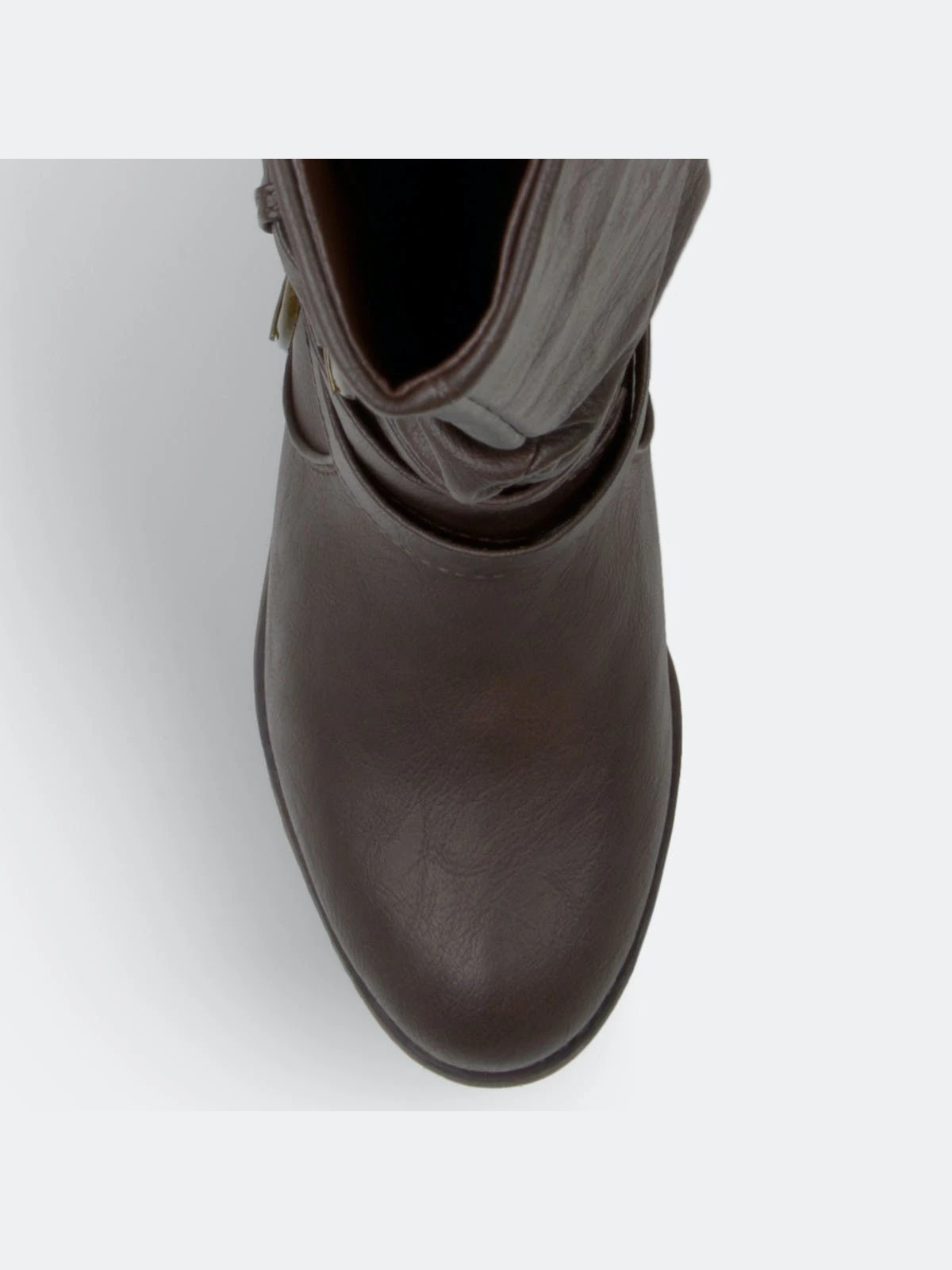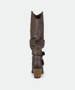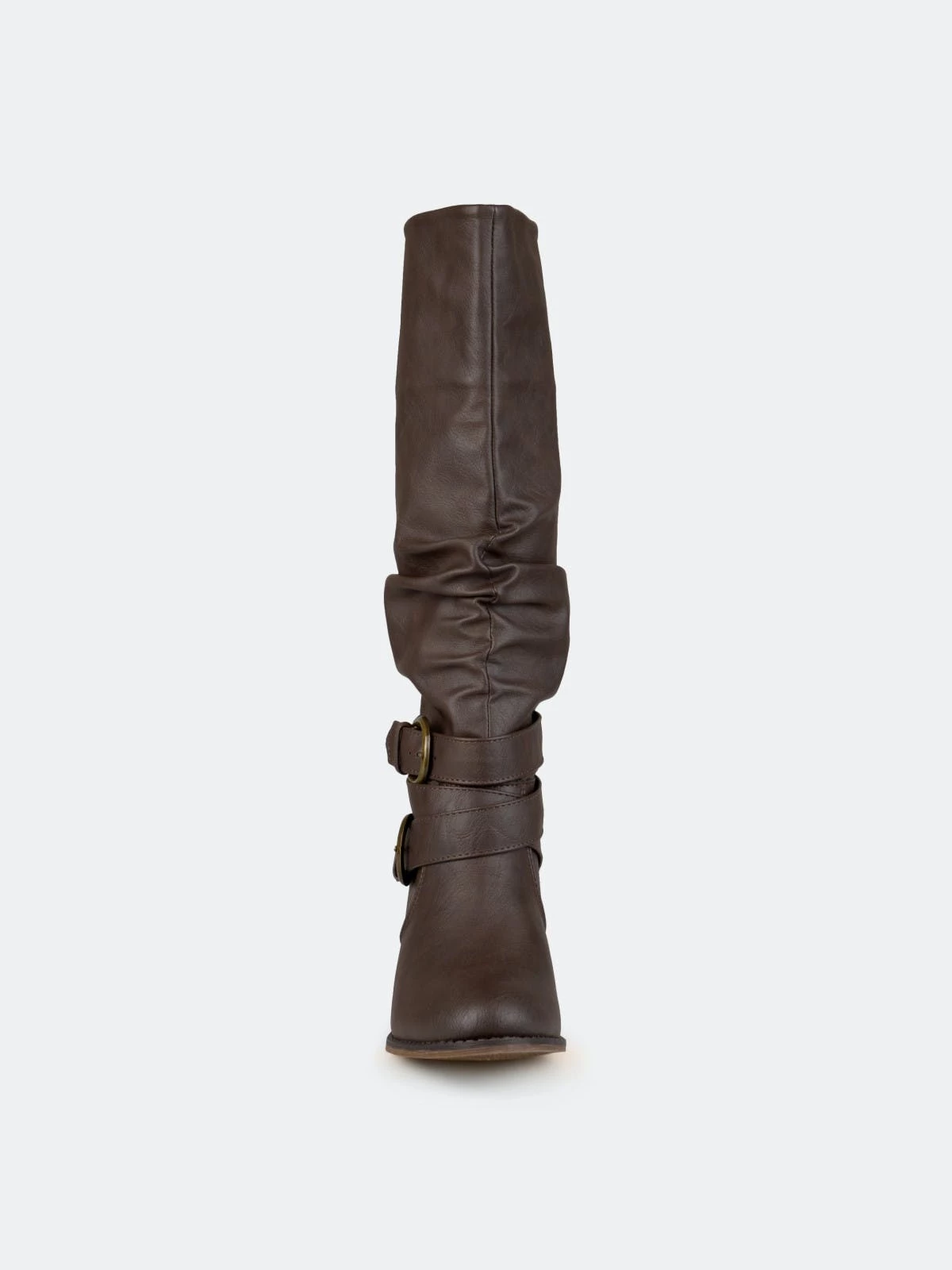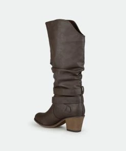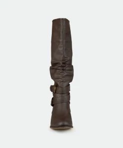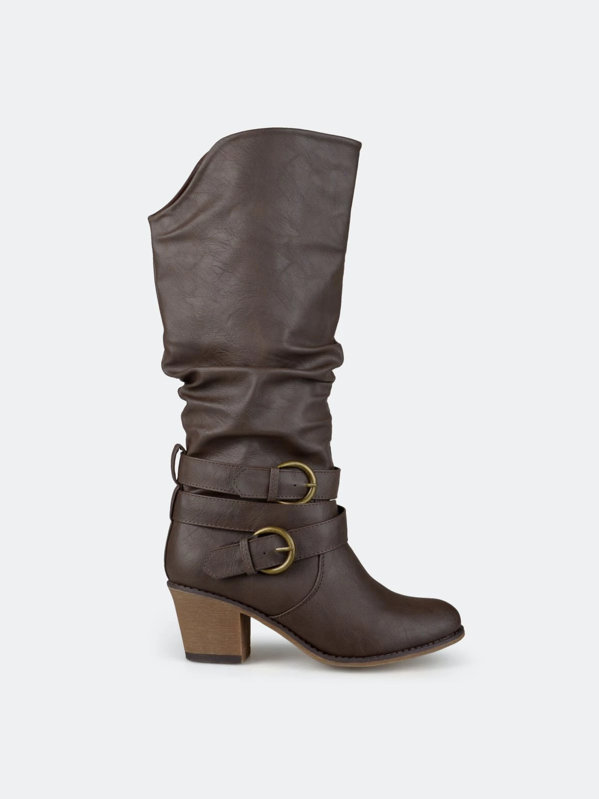 Step into trend-setting style with these buckle boots by Journee Collection. These fashionable wide-calf boots feature premium faux leather uppers that rise mid-calf with slightly raised angular vamps in the front.Heel Height: 2 1/4-inch. Heel Type: Stacked. Platform Height: 1/2-inch. Shaft Height: 14 inches. Calf Circumference: 16 1/2 inches. Top Circumference: 16 1/2 inches. Shoe Width: Medium. Closure Type: Pull-on. Toe Style: Round. Lining: Fabric. Upper Material: Faux Leather. Outersole Material: Man-made. Footbed: Padded. All measurements are approximate and were taken using a size 6. Please note measurements may vary slightly by size.