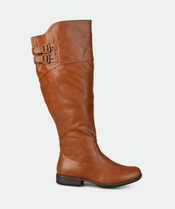 Take on the season in fabulous wide calf boots by Journee Collection. These knee-high boots highlight premium uppers that rise to the knees and feature a wide-calf style. Contrasting outsoles and double strap detail with buckles completes the look.Heel Height: 1-inch. Heel Type: Stacked. Platform Height: 1/2-inch. Shaft Height: 17 inches. Calf Circumference: 17 inches. Top Circumference: 18 inches. Shoe Width: Medium. Closure Type: Inside Zip. Toe Style: Round. Lining: Fabric. Upper Material: Faux Leather. Outersole Material: Man-made. Footbed: Padded. All measurements are approximate and were taken using a size 6. Please note measurements may vary slightly by size.