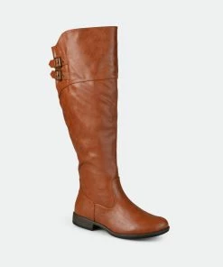 Take on the season in fabulous wide calf boots by Journee Collection. These knee-high boots highlight premium uppers that rise to the knees and feature a wide-calf style. Contrasting outsoles and double strap detail with buckles completes the look.Heel Height: 1-inch. Heel Type: Stacked. Platform Height: 1/2-inch. Shaft Height: 17 inches. Calf Circumference: 17 inches. Top Circumference: 18 inches. Shoe Width: Medium. Closure Type: Inside Zip. Toe Style: Round. Lining: Fabric. Upper Material: Faux Leather. Outersole Material: Man-made. Footbed: Padded. All measurements are approximate and were taken using a size 6. Please note measurements may vary slightly by size.