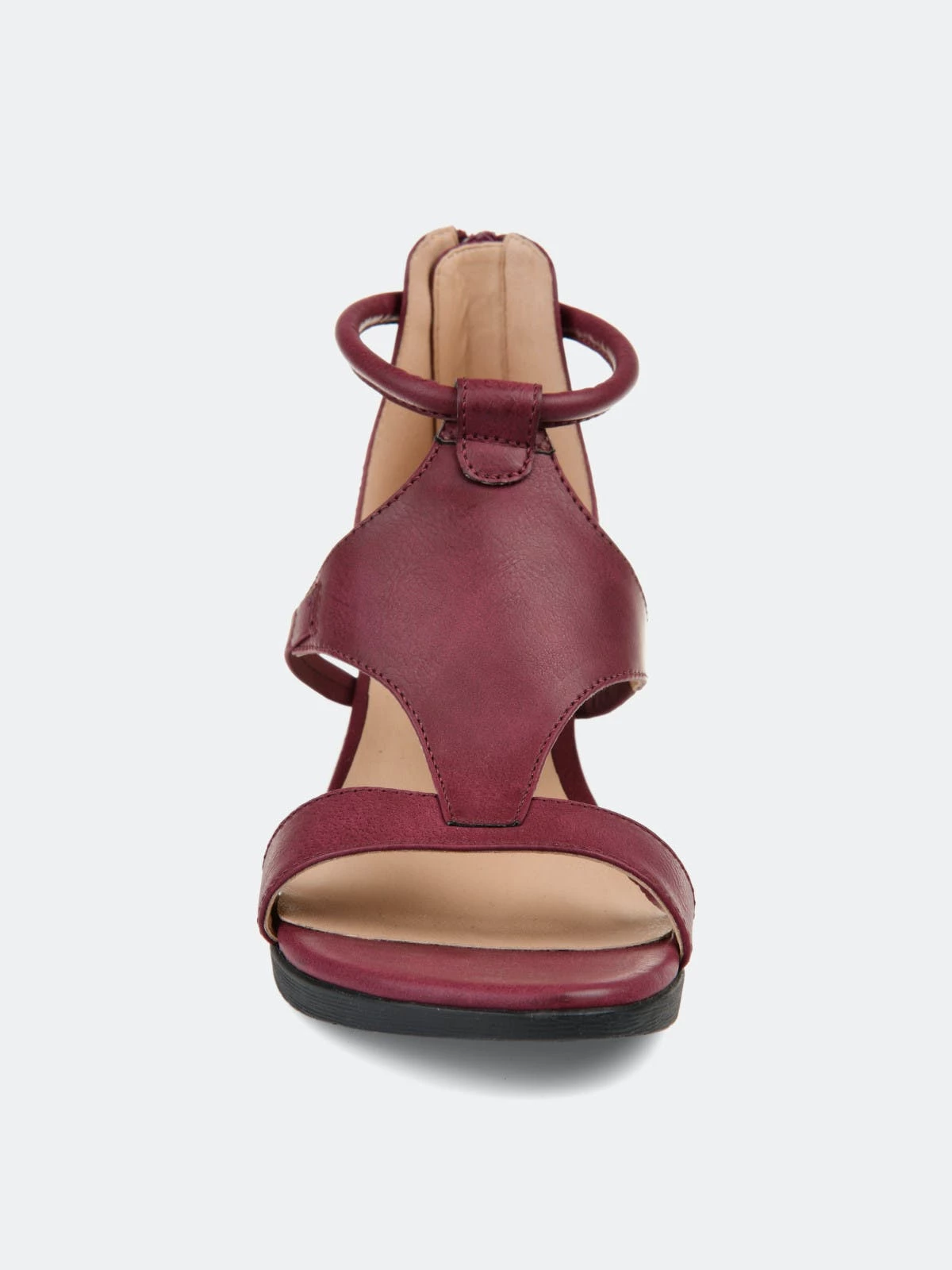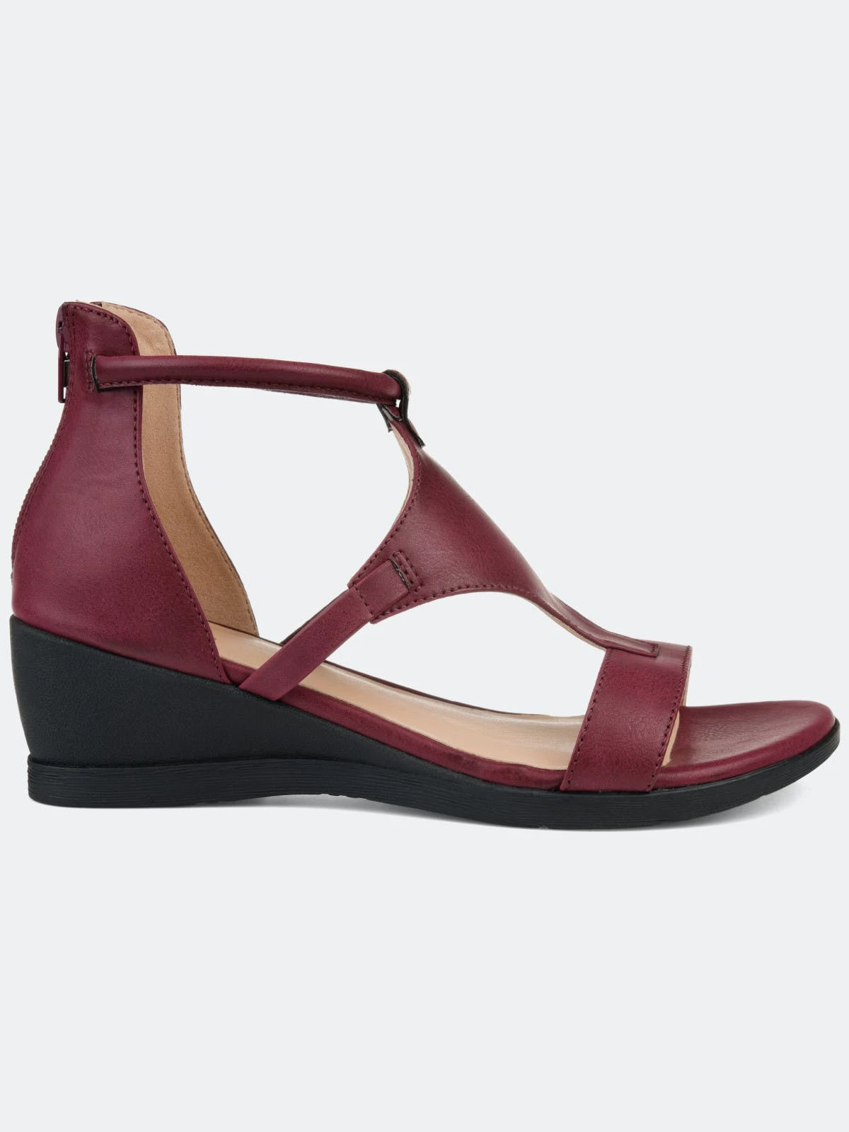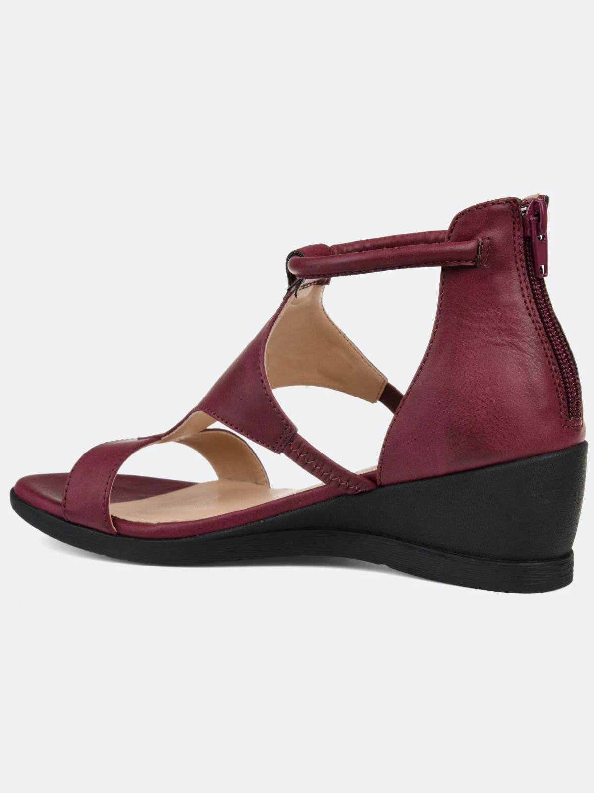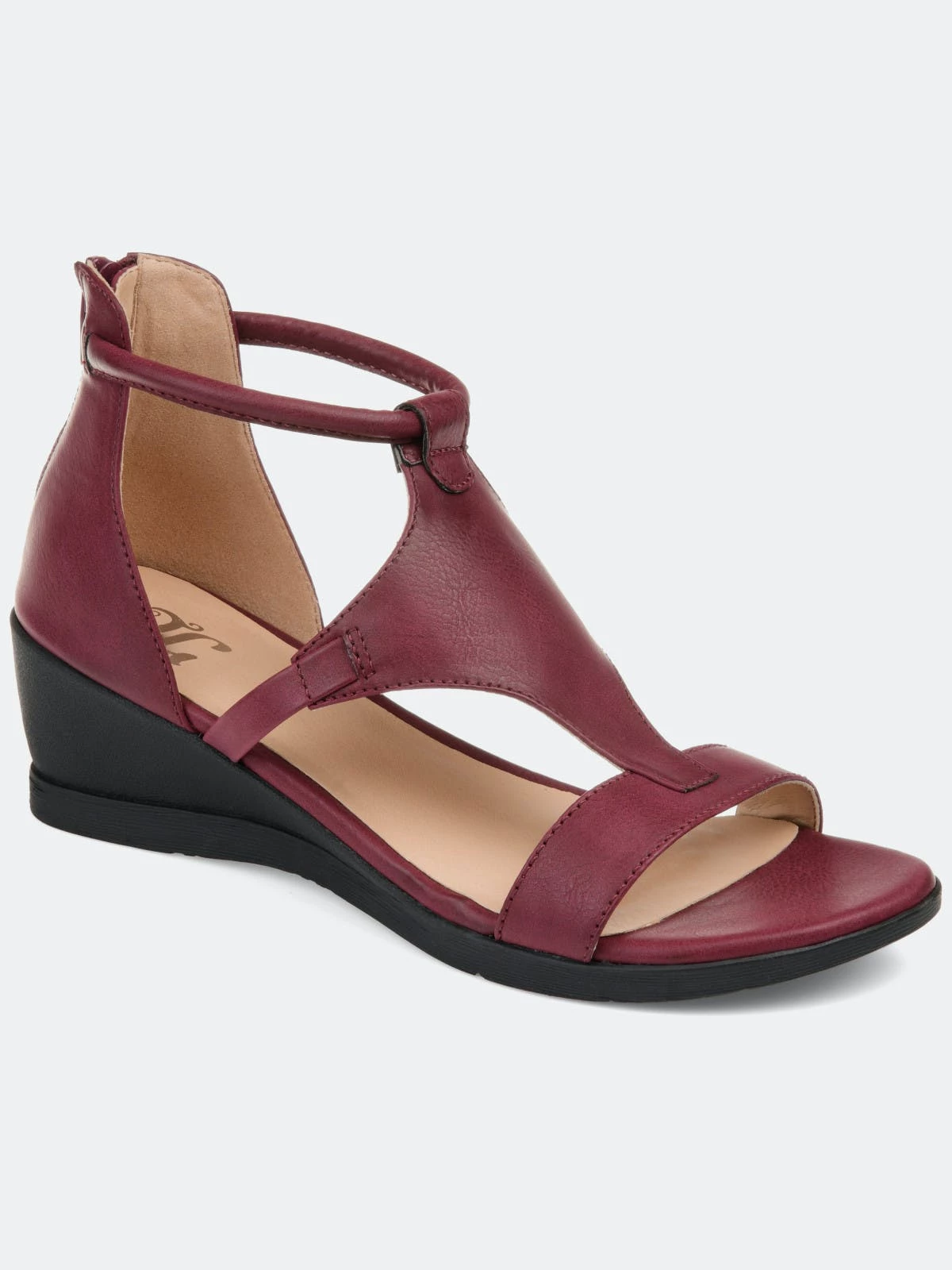 The perfect new addition to your summer closet, the Trayle by Journee Collection. This wide-width caged sandal features soft vegan leather grounded by a rubber wedge heel and padded insole. A back zipper entry finishes the look, so they are easy to slip on.Heel Height:2-inchHeel Type: Wedge Platform Height:1-inchShoe Width: WideClosure Type: Back Heel ZipStrap Type: T-StrapToe Style: OpenLining: Faux LeatherUpper Material: Faux LeatherOutersole Material: RubberFootbed: PaddedAll measurements are approximate and were taken using a size 6. Please note measurements may vary slightly by size.