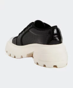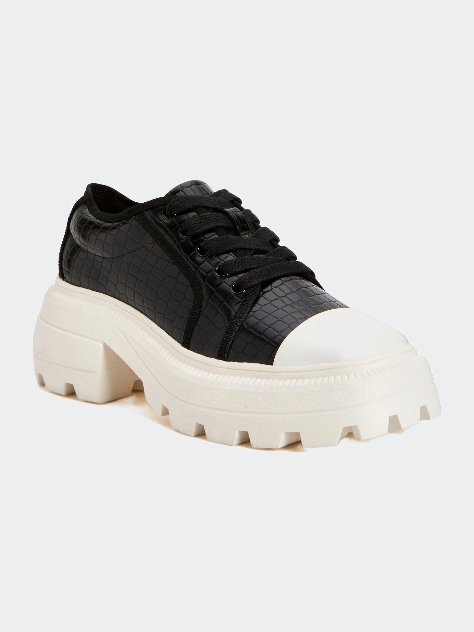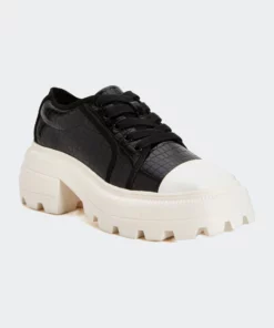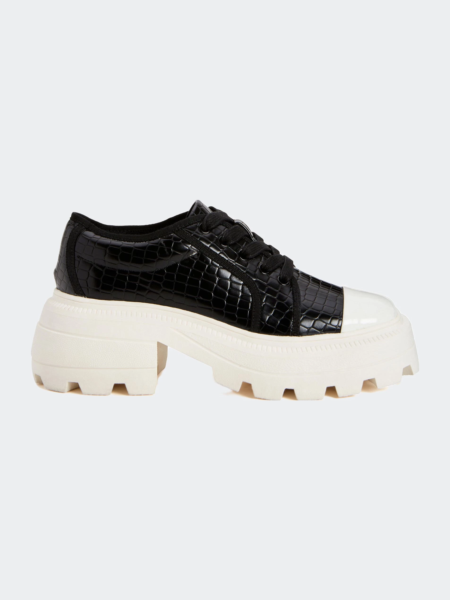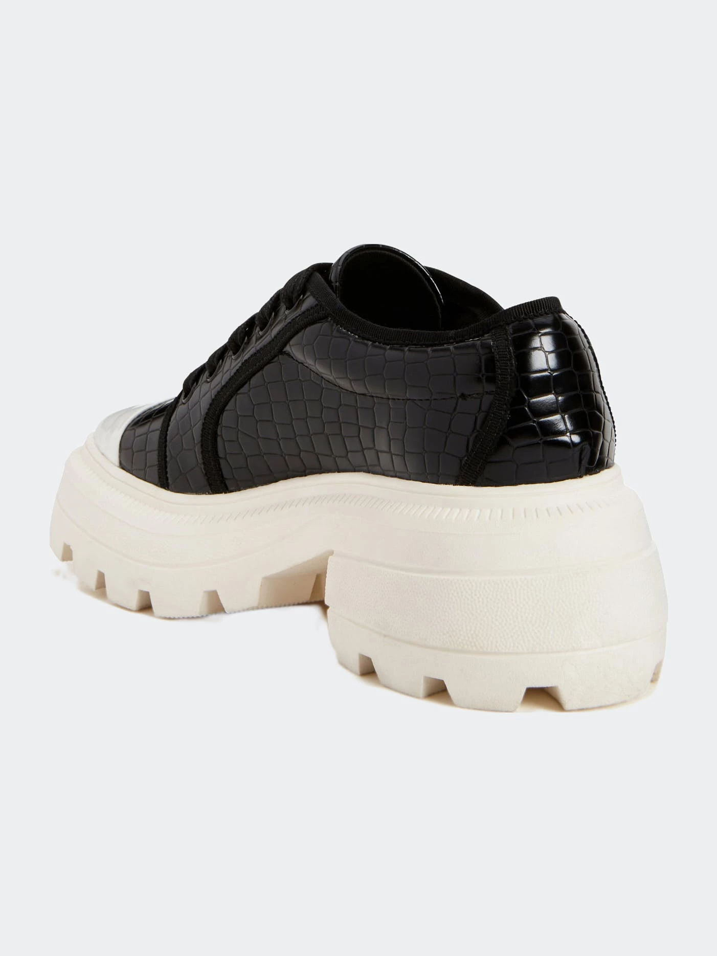 The Geli solid sneaker is a cool classic lifted by a lug sole and easy lace-up in Croco Emboss material with Patent toe-cap.