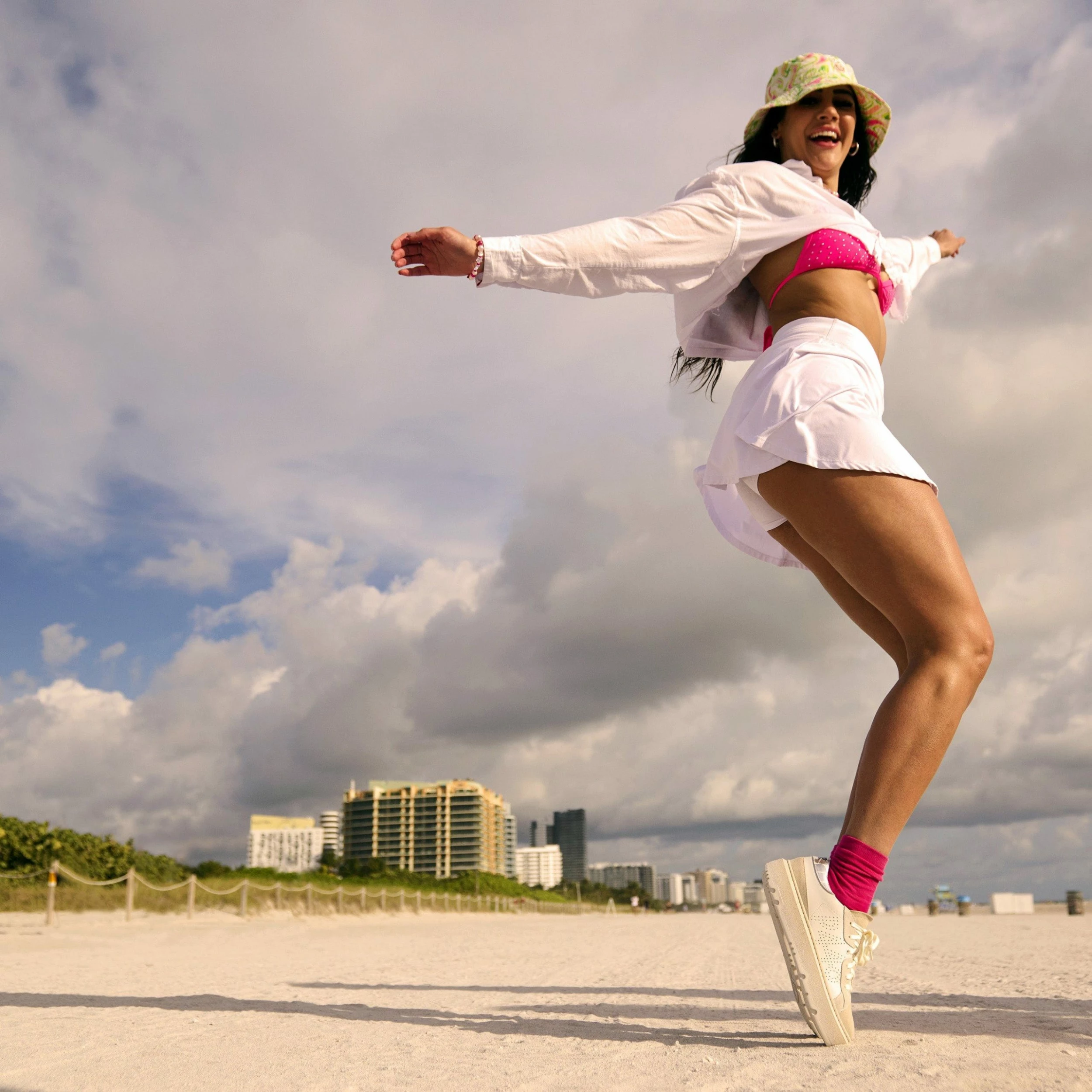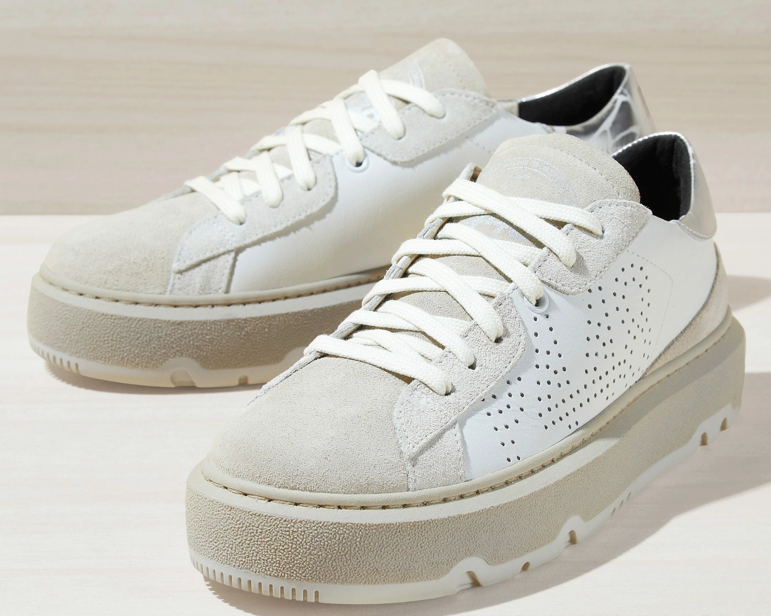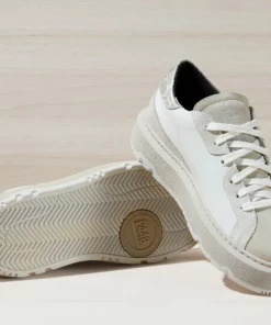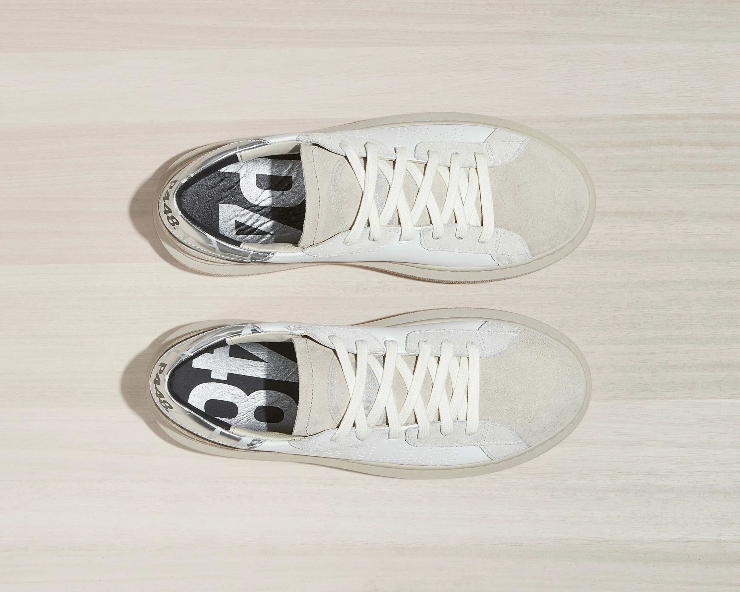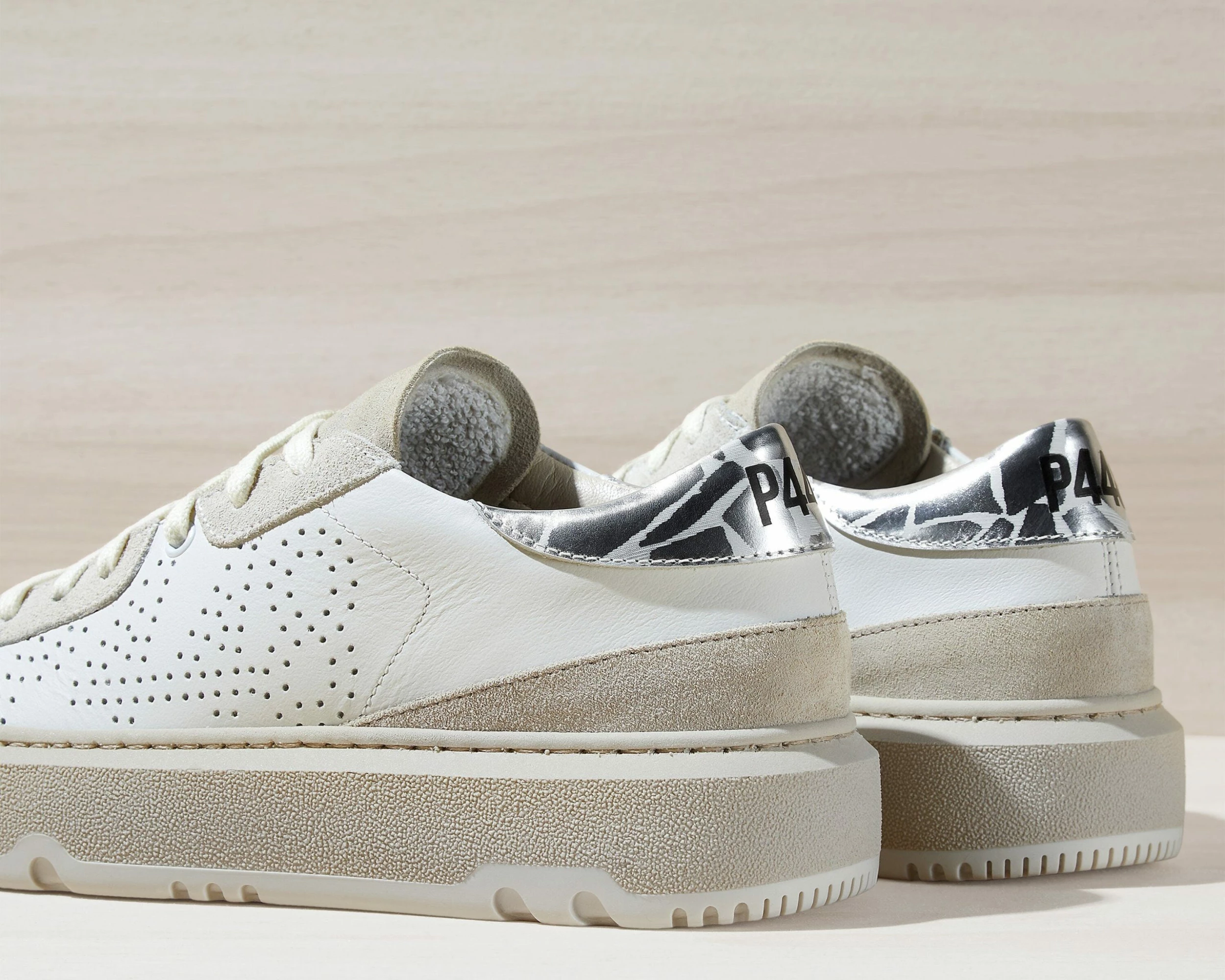 Aerial Ecru/Mirror makes a case for crisp white leather and complementary neutral details. A white and silver shimmering giraffe-print leather heel tab is there for when your wild side wants out.