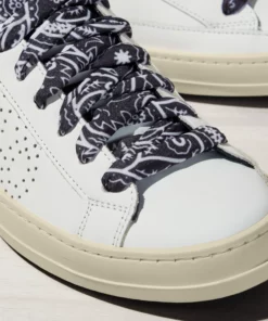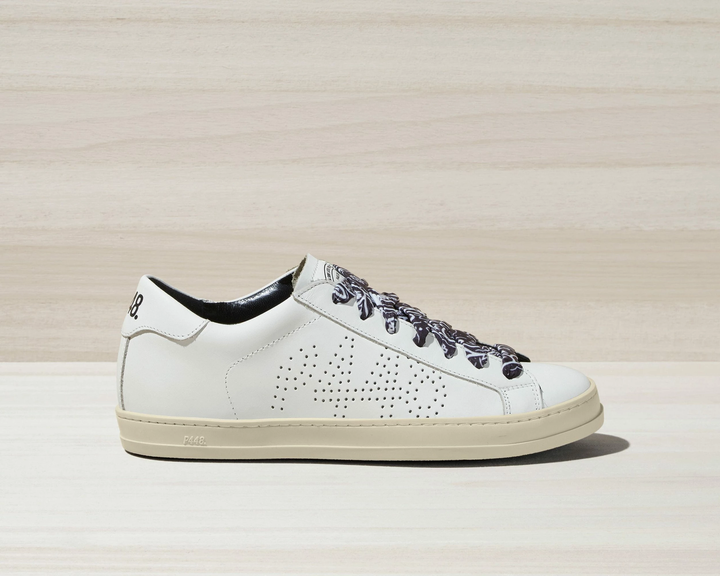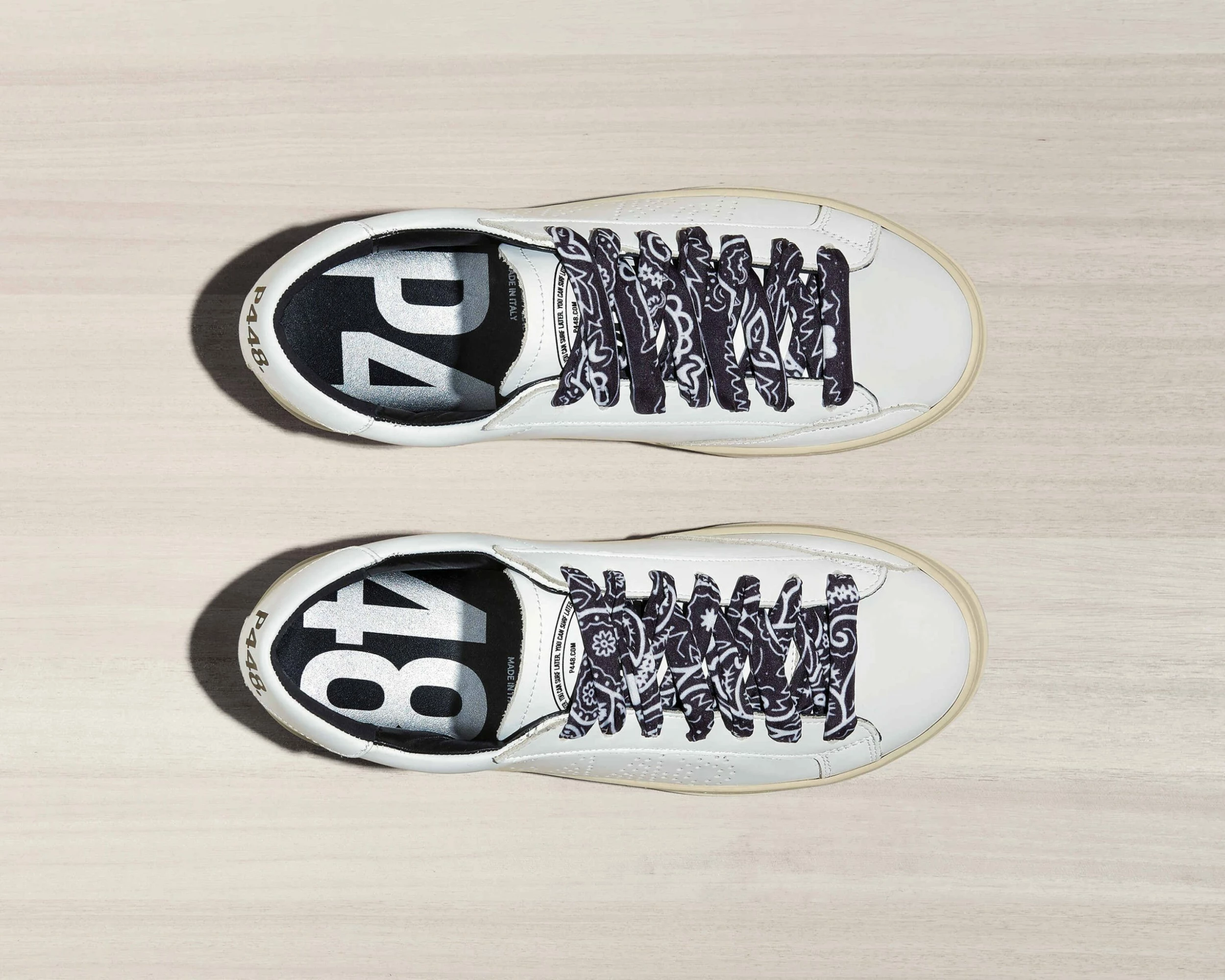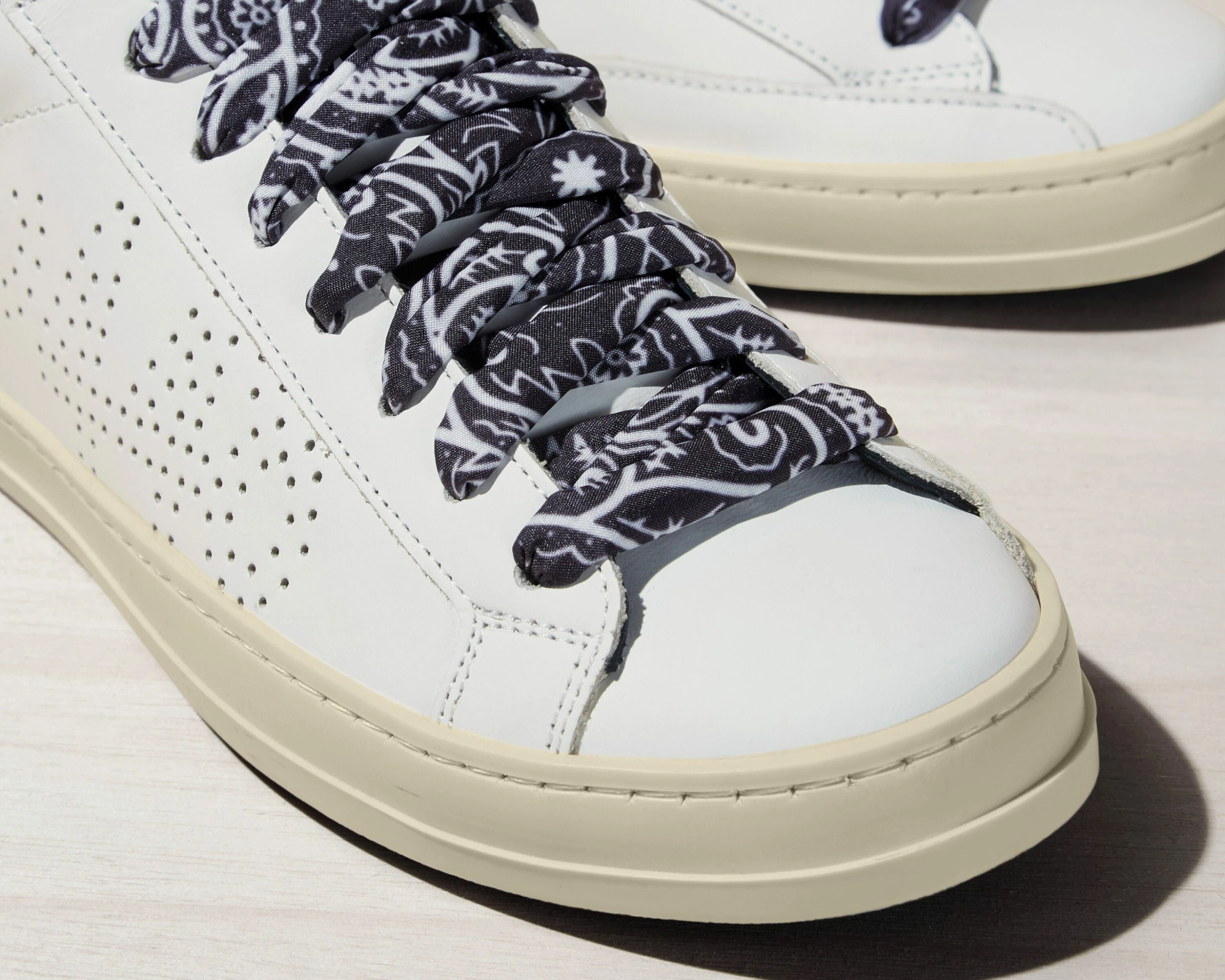 An (almost) monochrome moment. This John Black Bandana is ultra-versatile in all-over white leather. Black bandana print laces add unexpected attitude and personality.
