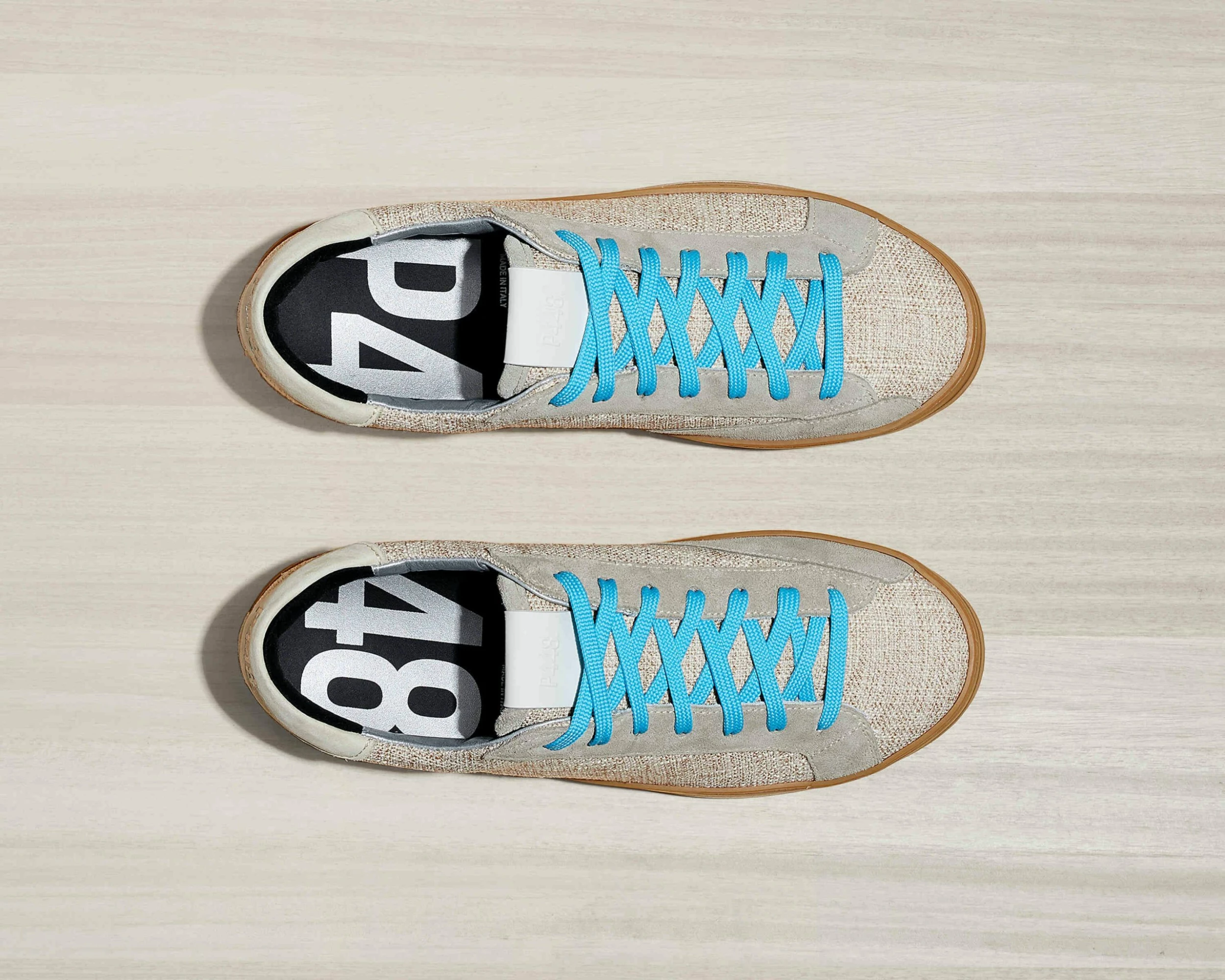 – Beige & off-white linen textile upper, tongue & toe
