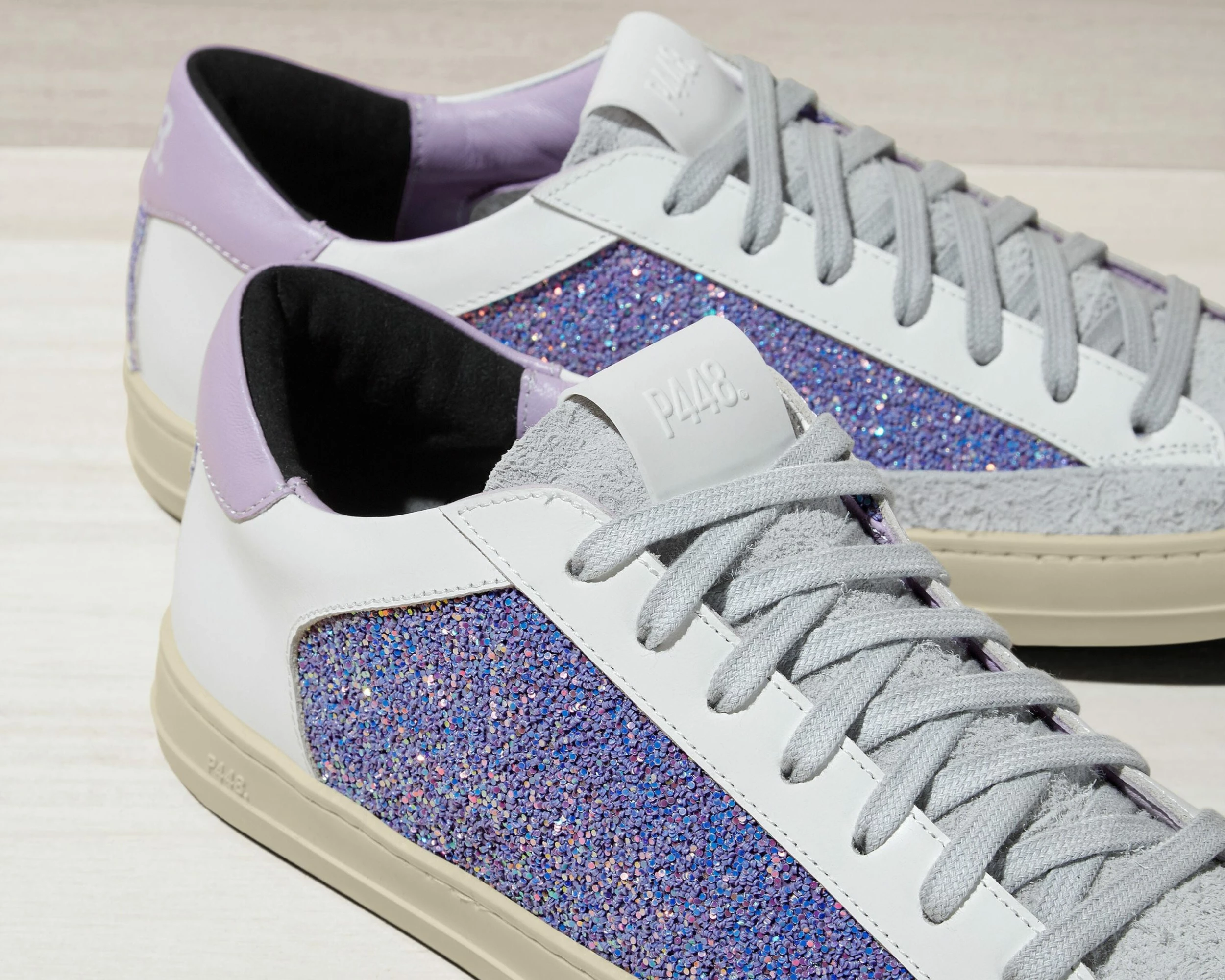 – Iridescent lavender multi-glitter upper