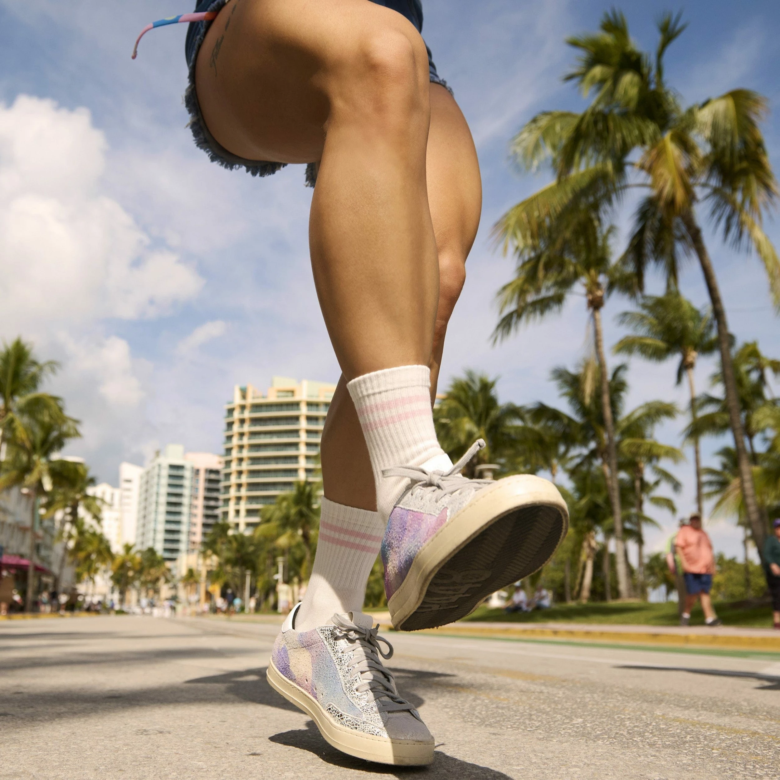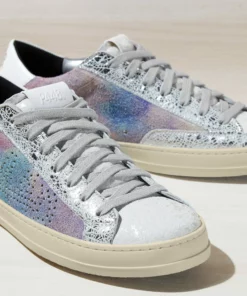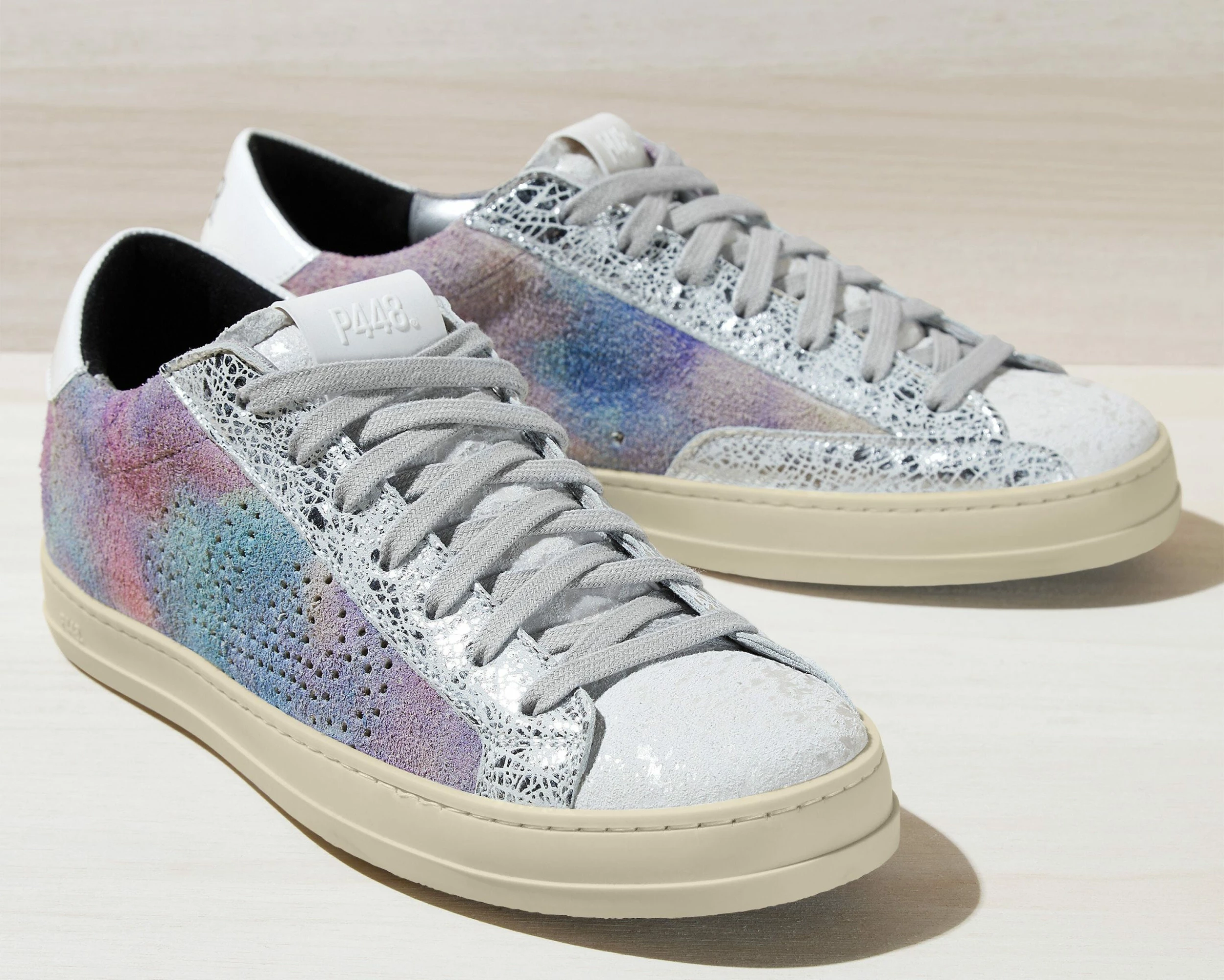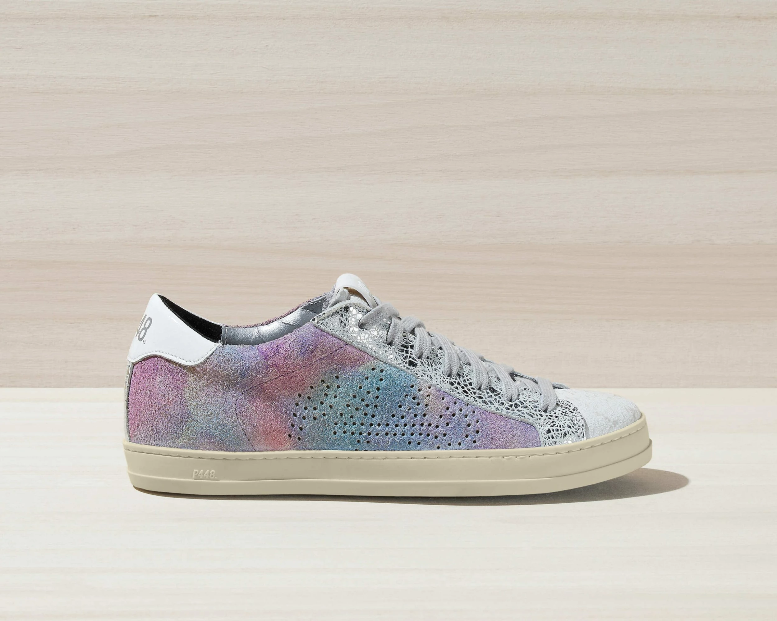 Feeling groovy. The John Plot blends shades of blue and pink in tie-dyed suede set off with silver cracked leather accents.