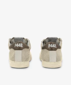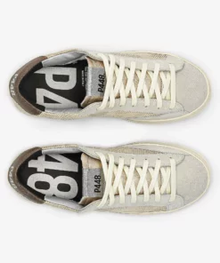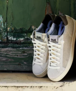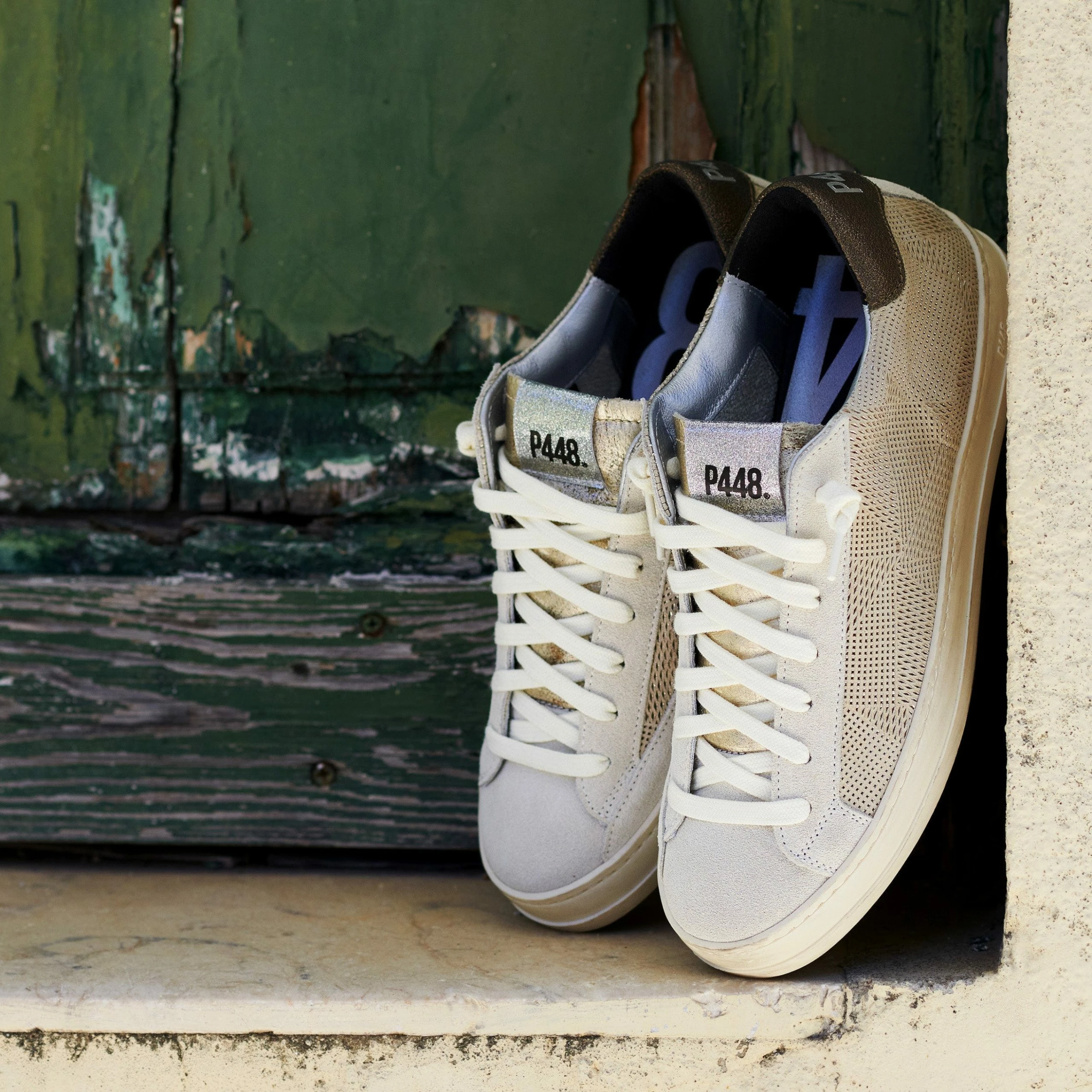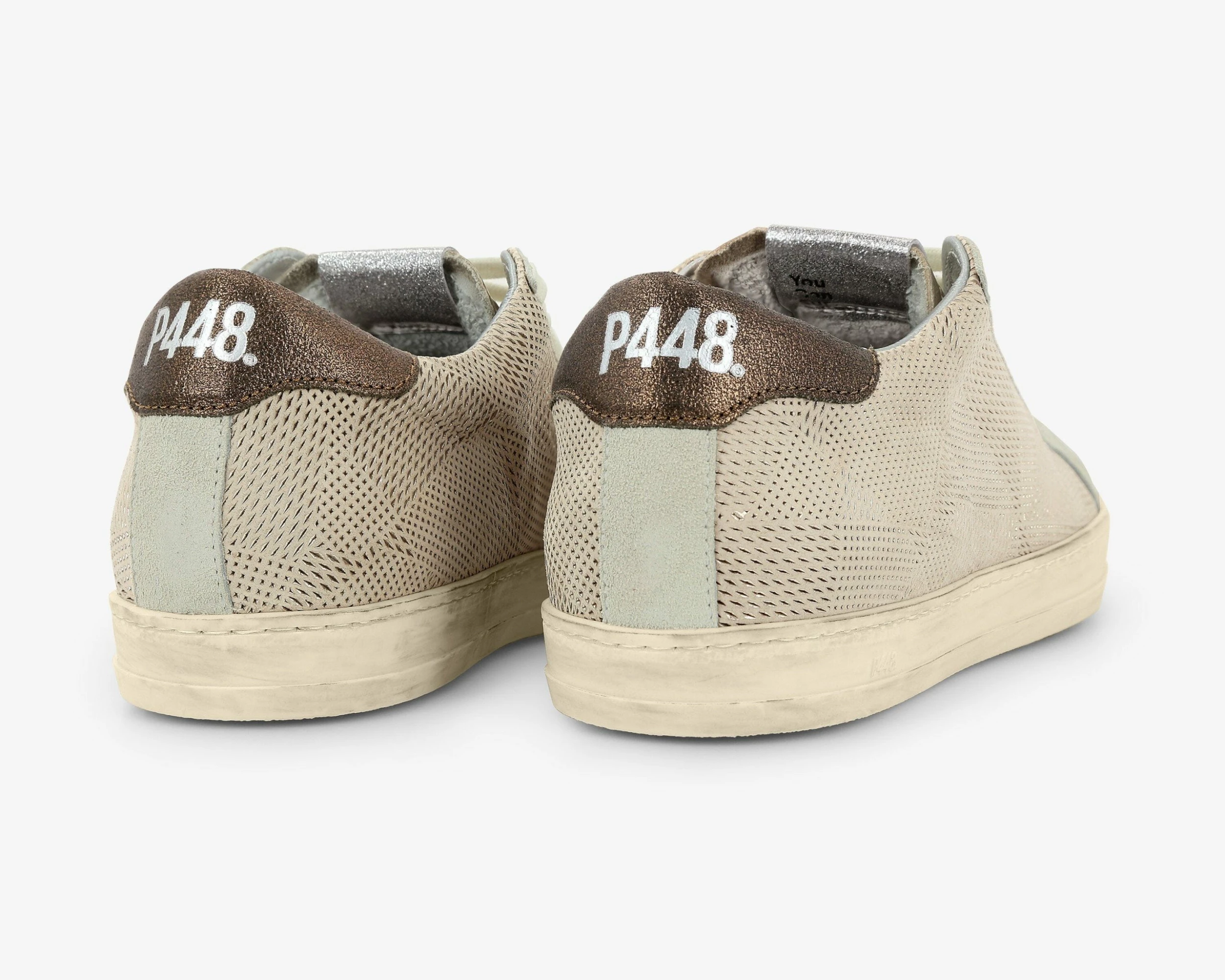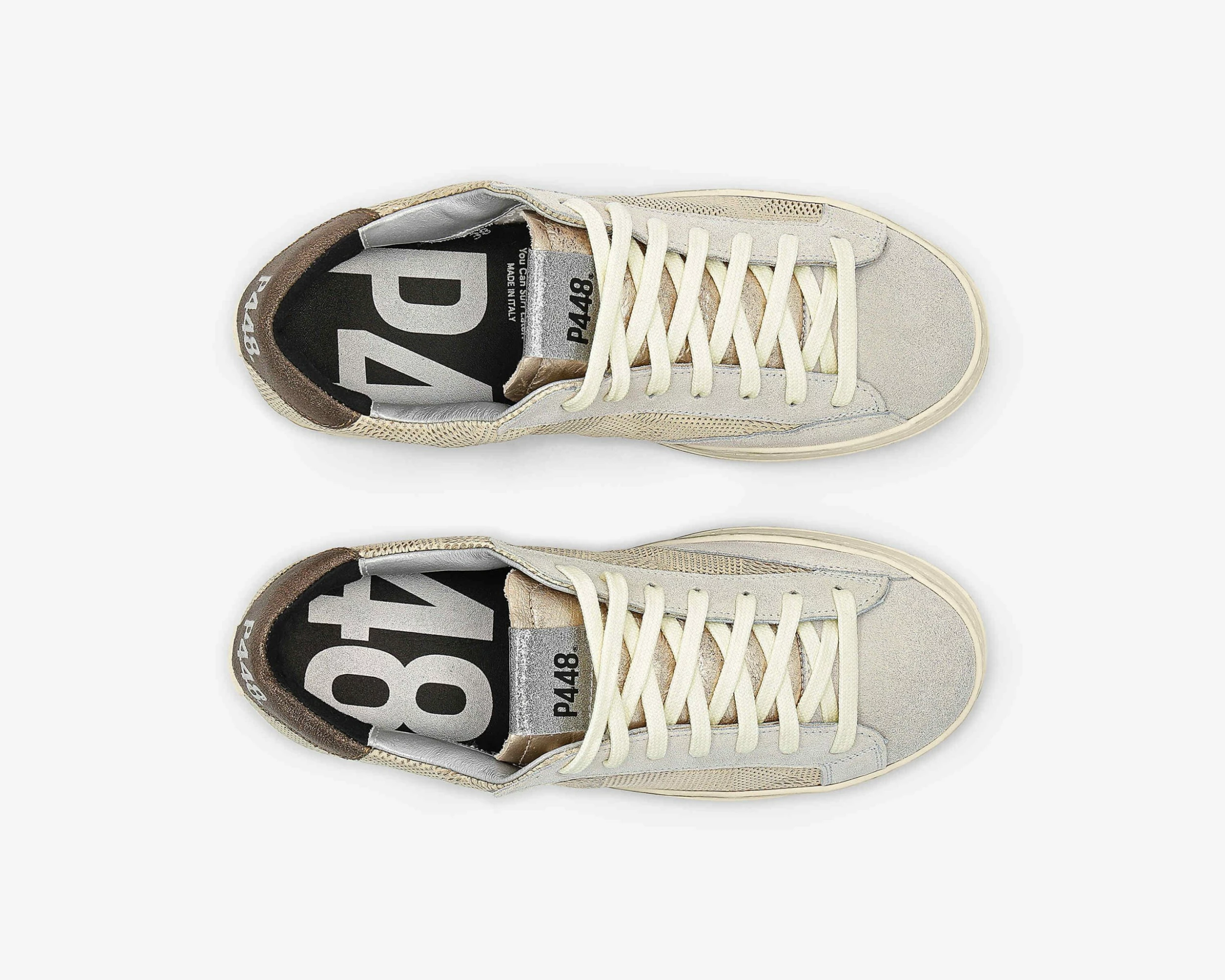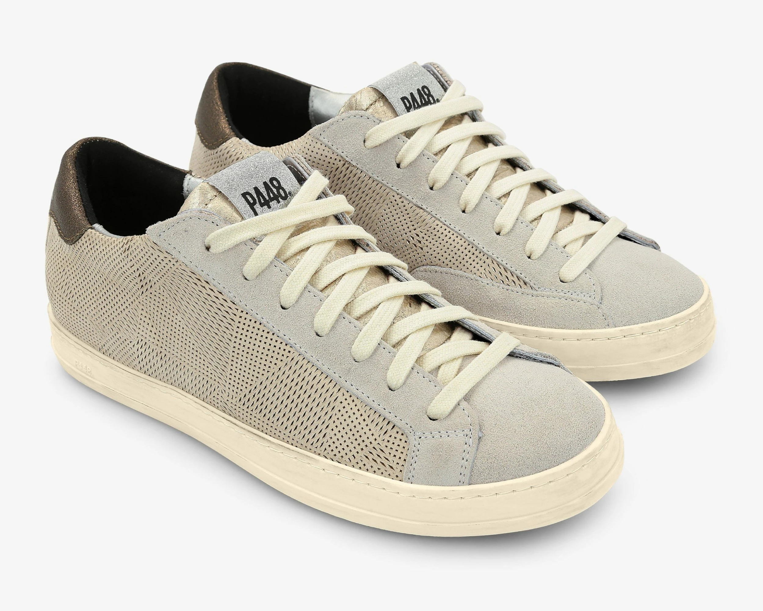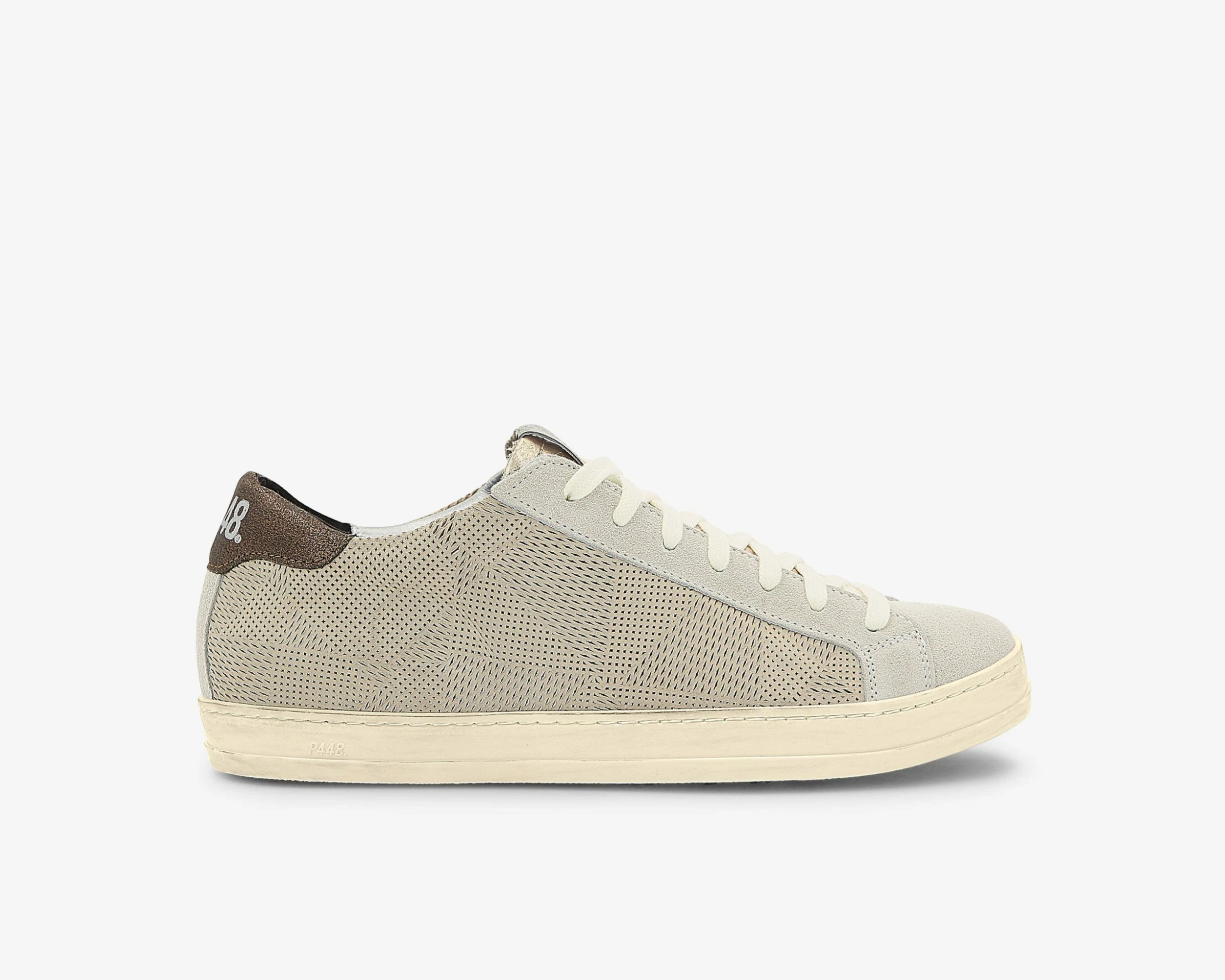 Expect the unexpected. Meet the John Prisma, featuring a beige suede upper with a metallic gold underlay, an abstract printed gold-patent tongue, cashmere suede trim, toe, a metallic bronze heel tab and cream cotton laces.