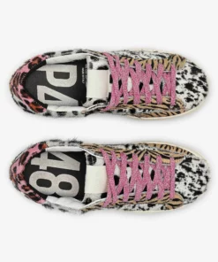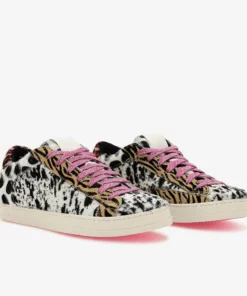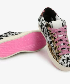 Introducing the John Multifur, the classic low-top silhouette you love with design details you won’t expect. This style features black and white dalmatian-printed hair calf upper, toe, & tongue with cow-print accents and tiger-printed trim, and a pink & black leopard printed heel tab. Finished with pink melange laces and a fluorescent pink tread.