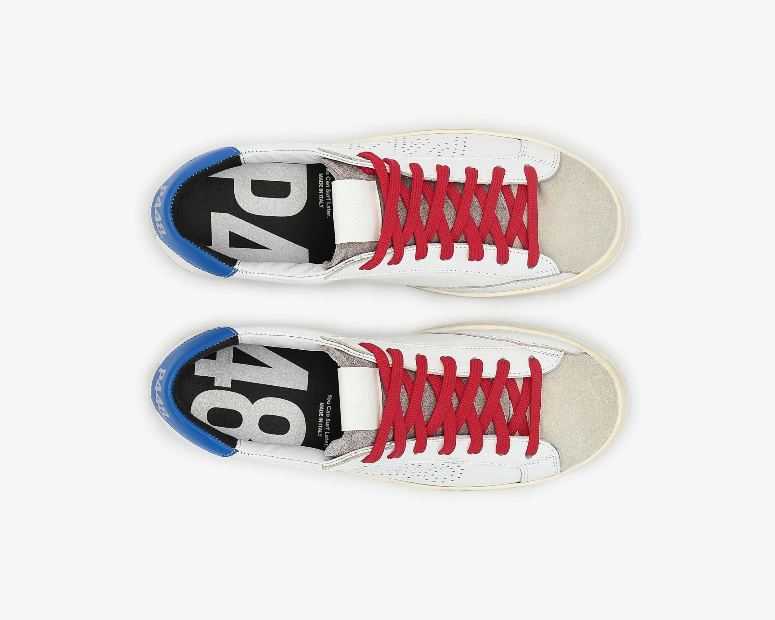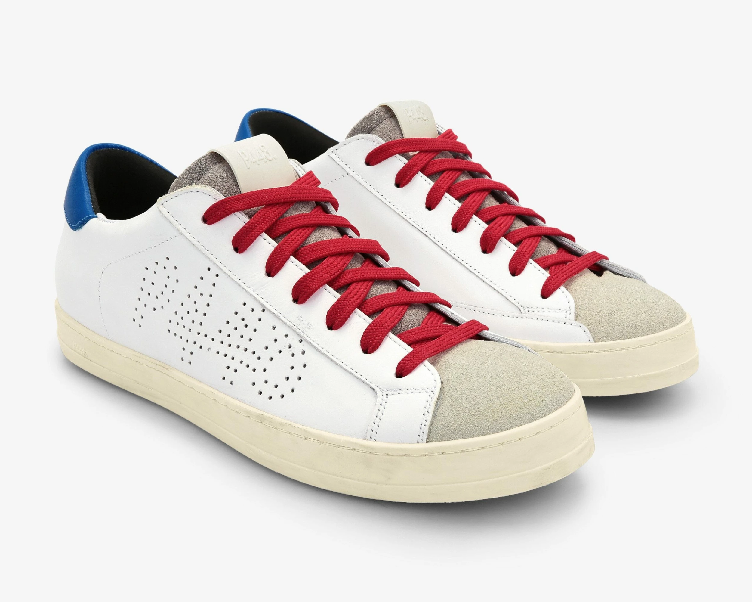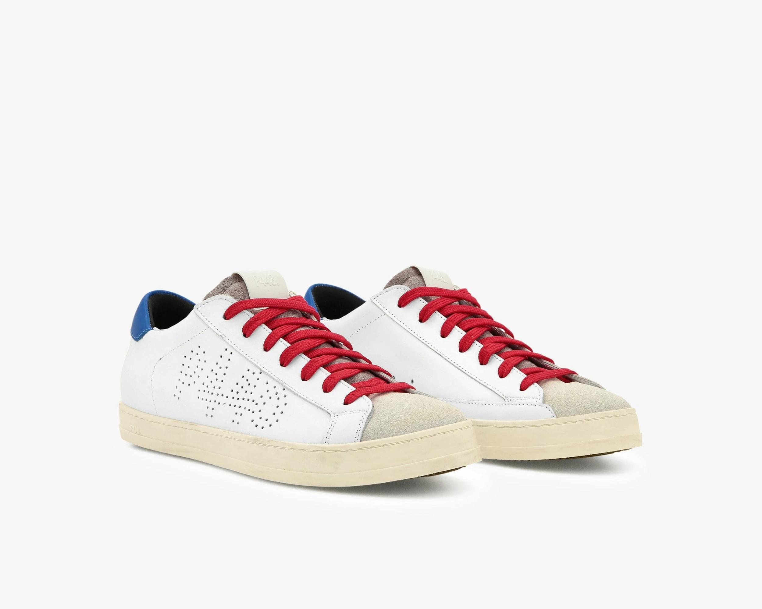 The John White/Tamigi is the best-selling low-top silhouette with a white leather upper, beige suede tongue, cashmere suede toe, royal blue leather heel tab, and finished with red cotton laces for a pop of color.