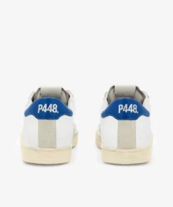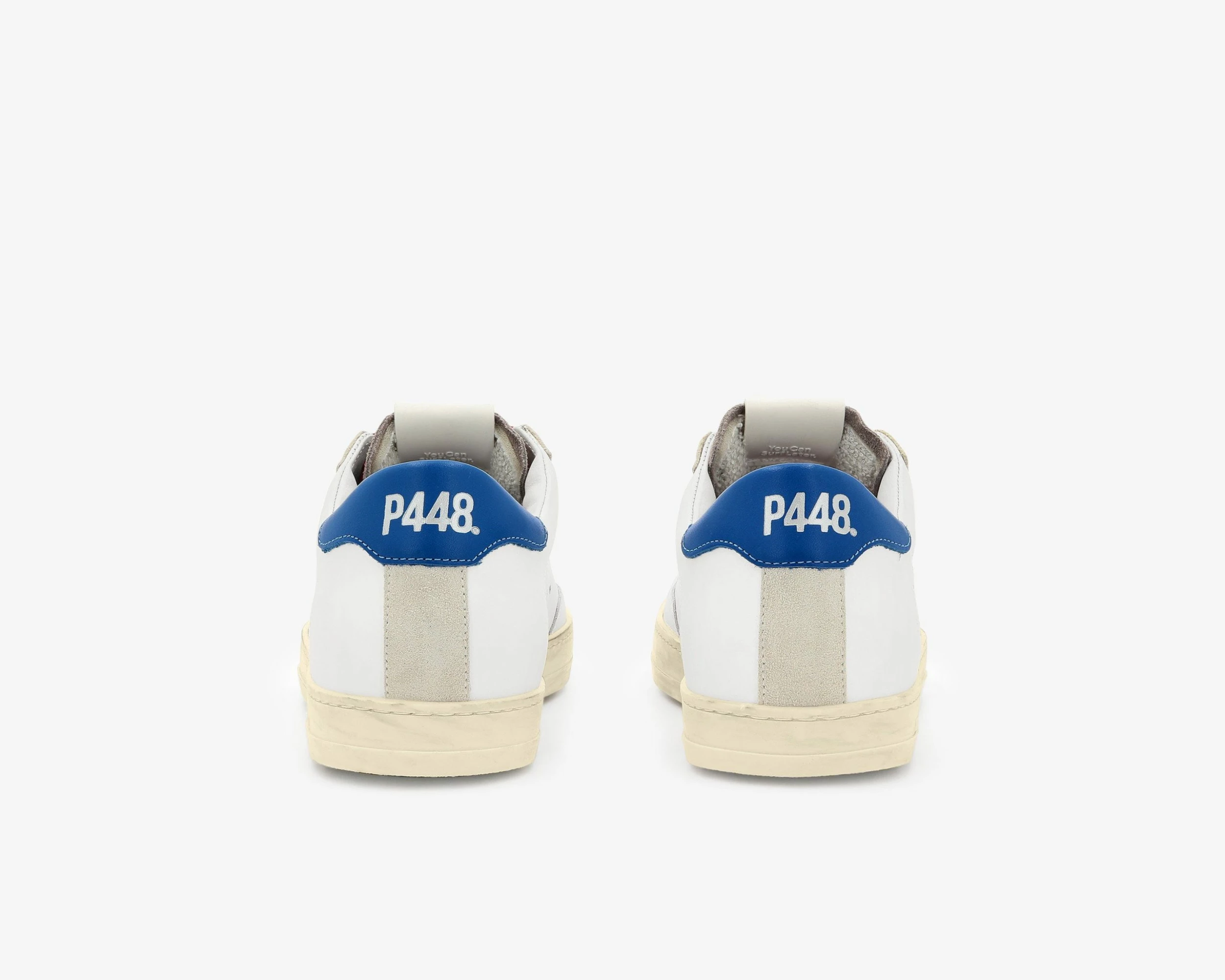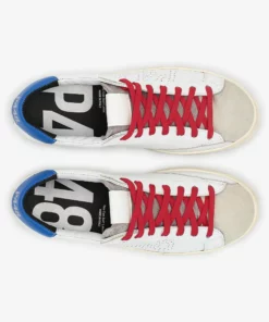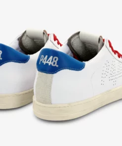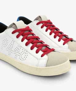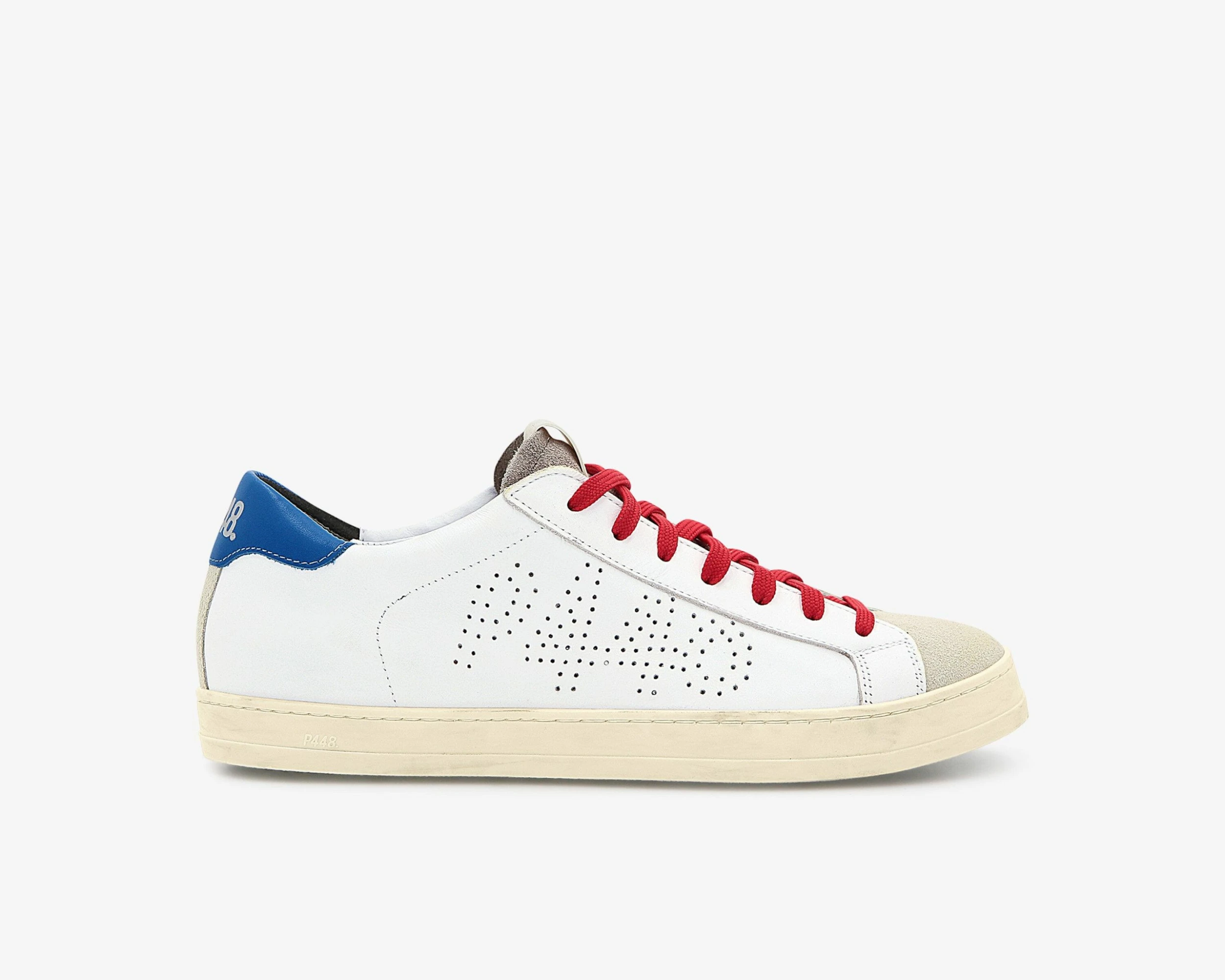 The John White/Tamigi is the best-selling low-top silhouette with a white leather upper, beige suede tongue, cashmere suede toe, royal blue leather heel tab, and finished with red cotton laces for a pop of color.