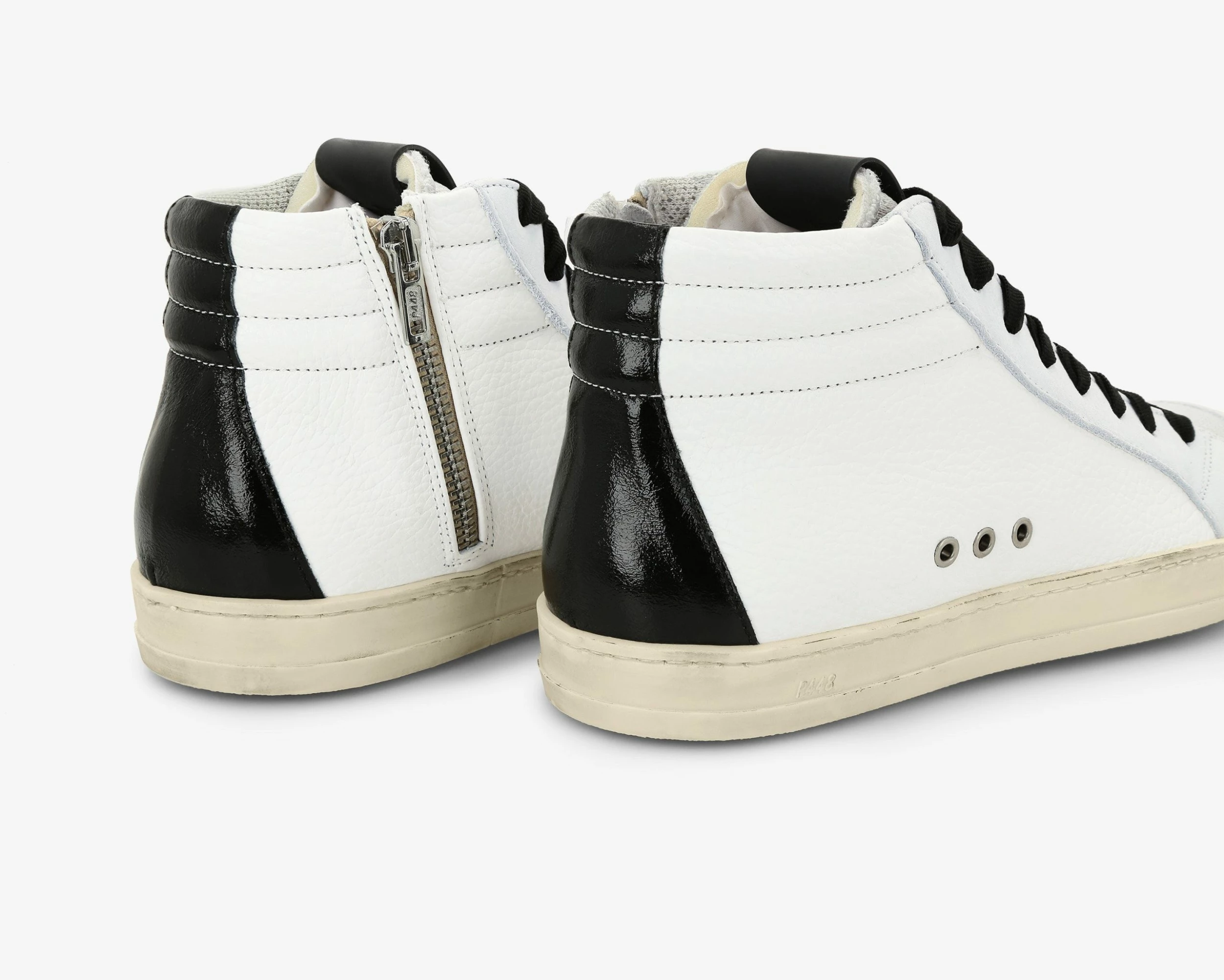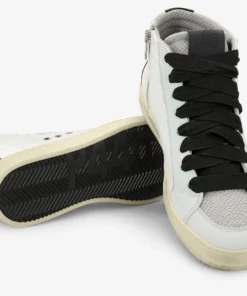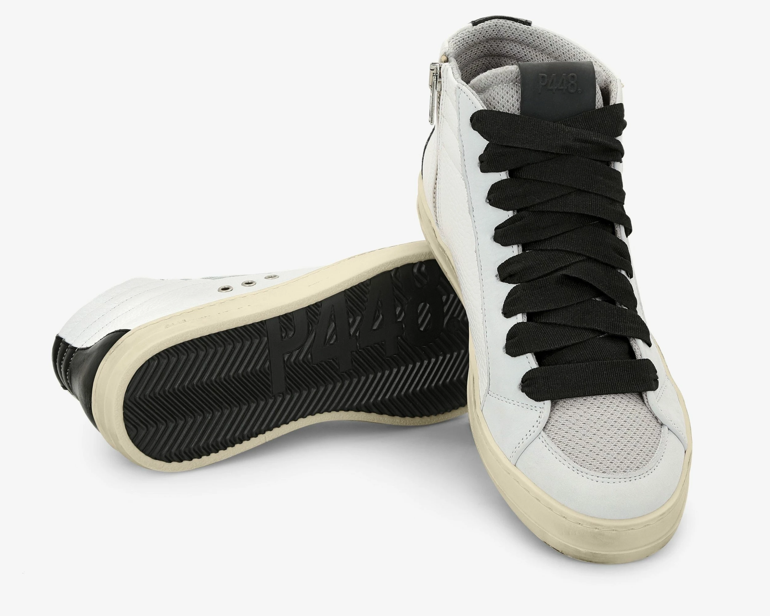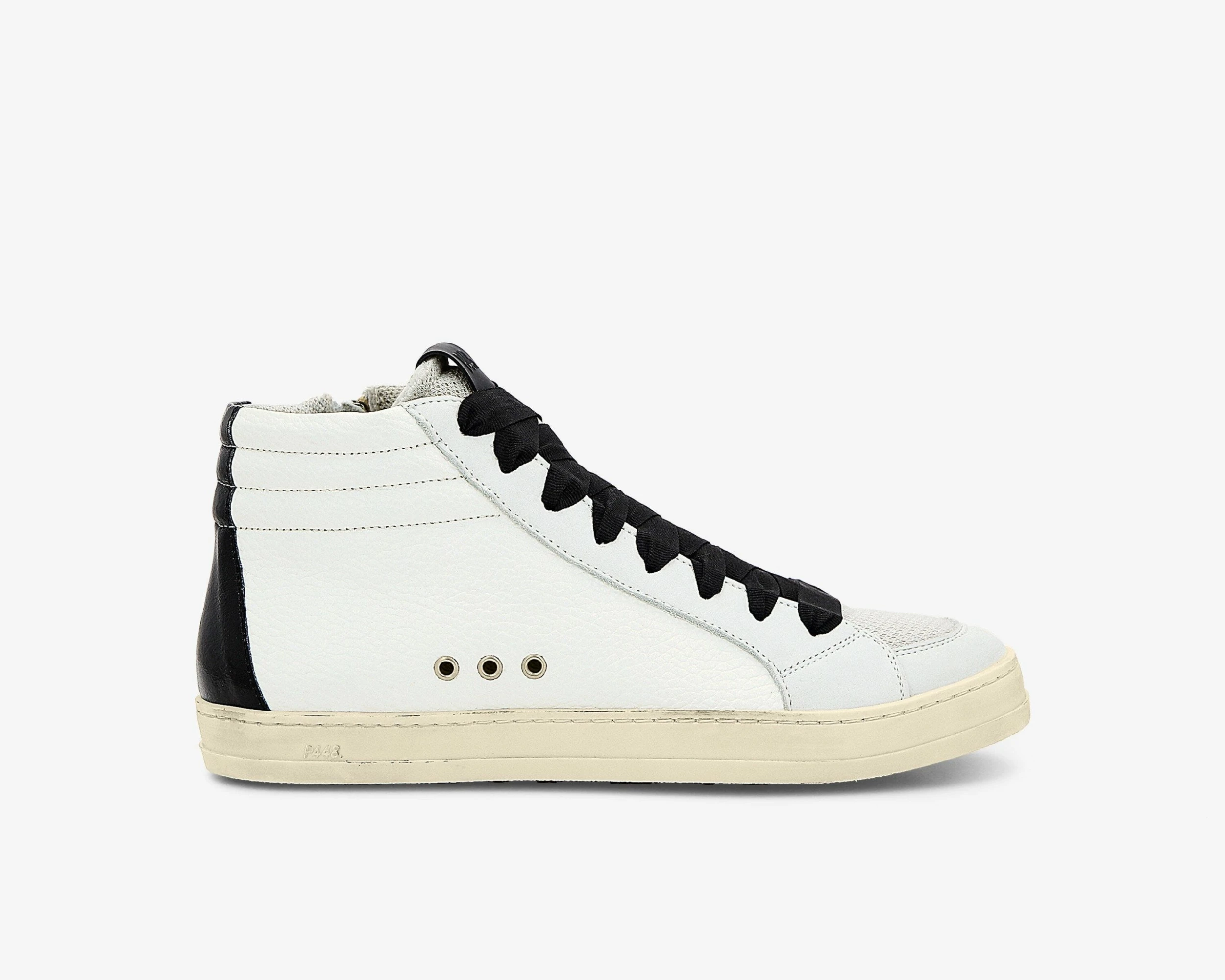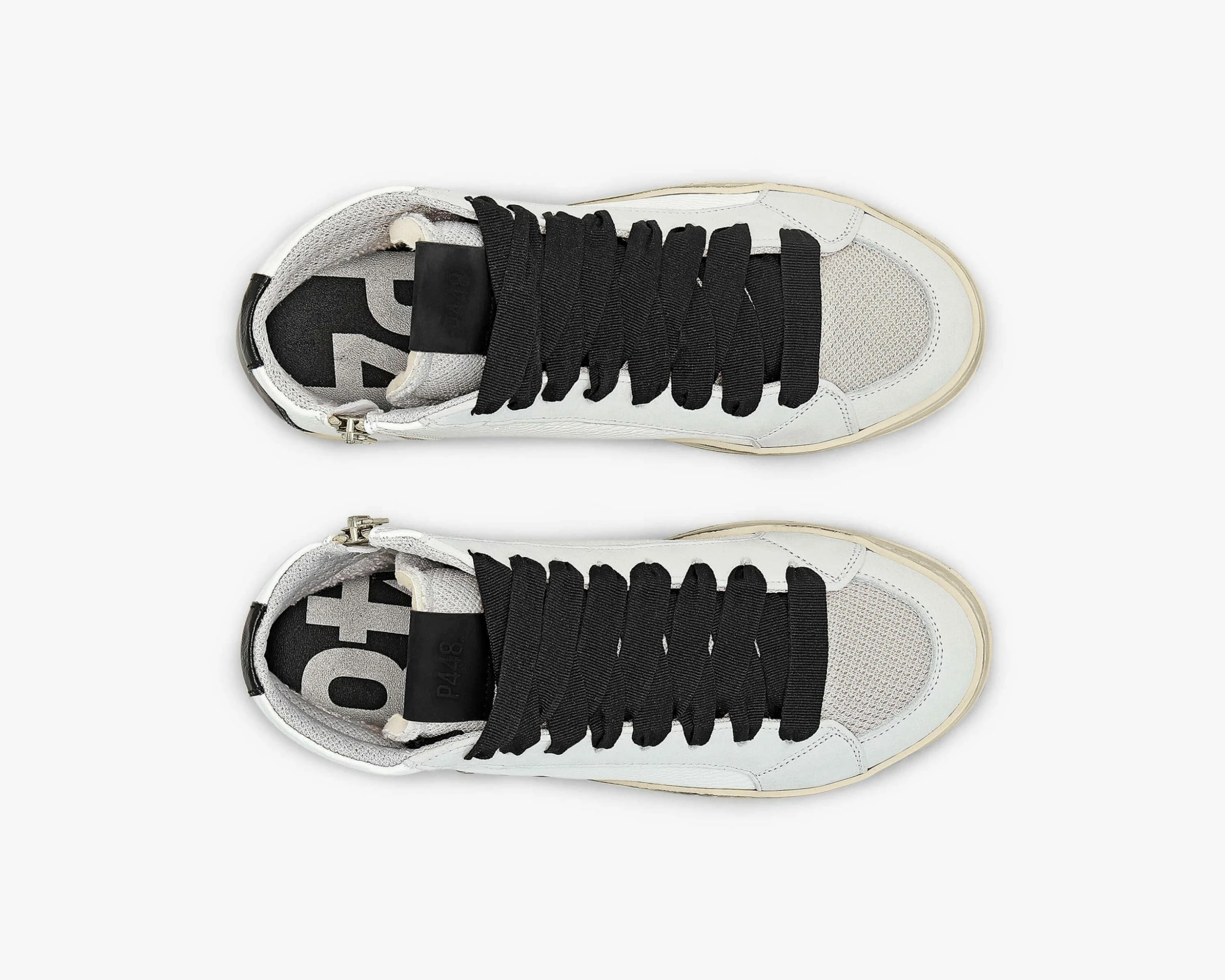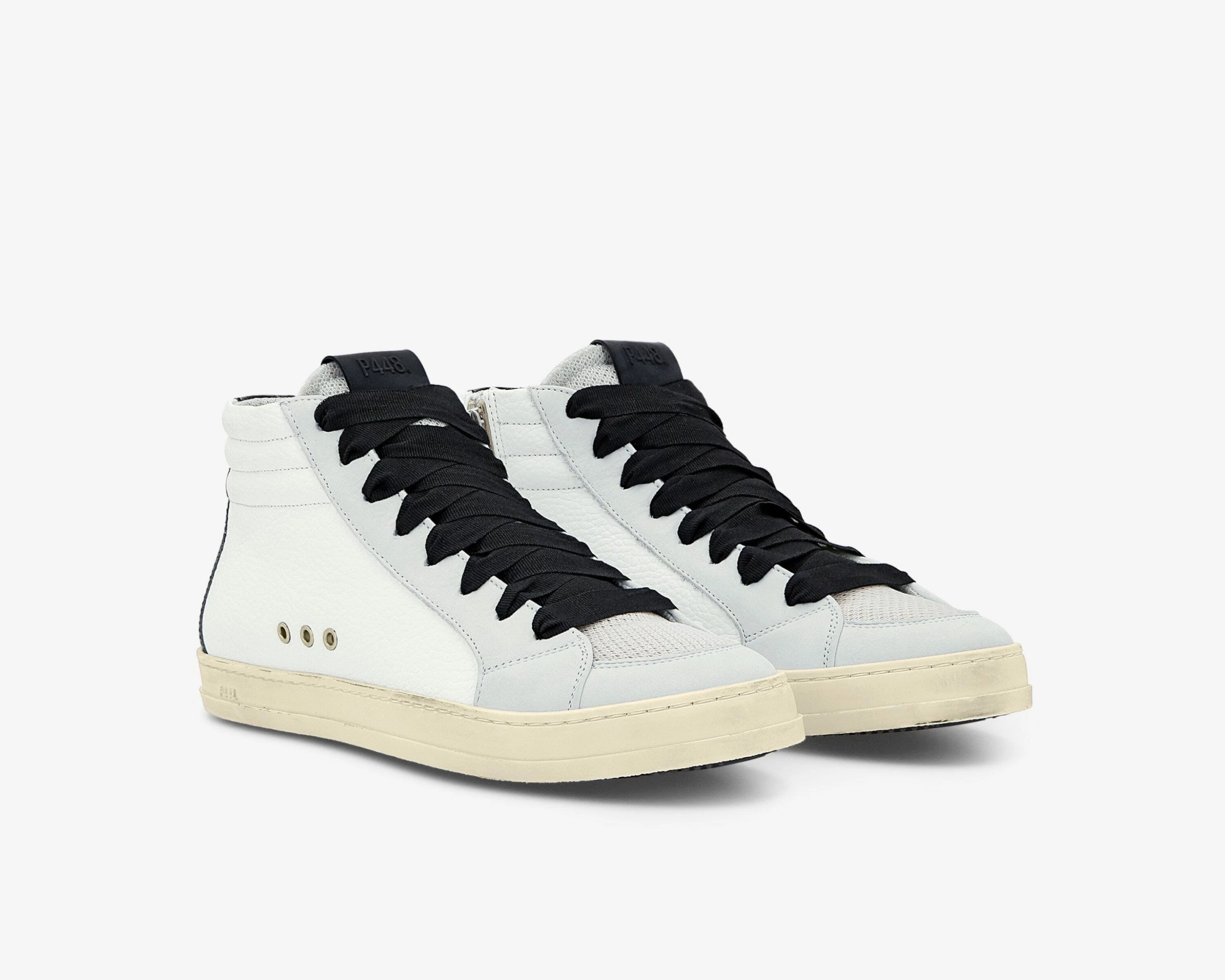 Meet the Skate Hammer, skate culture-inspired high-top style in a neutral colorway featuring a white leather upper with a unique grained texture, a grey knit mesh tongue & toe, off-white suede trim, a black leather heel tab and wide black grosgrain ribbon laces.