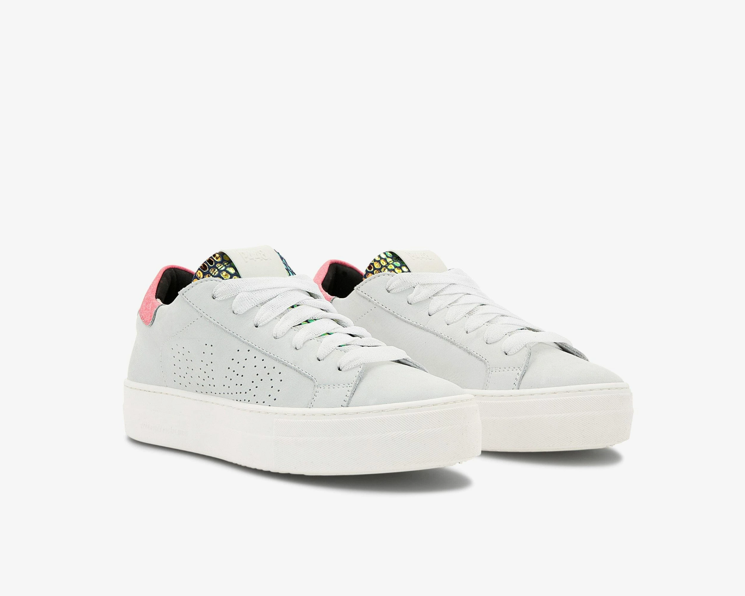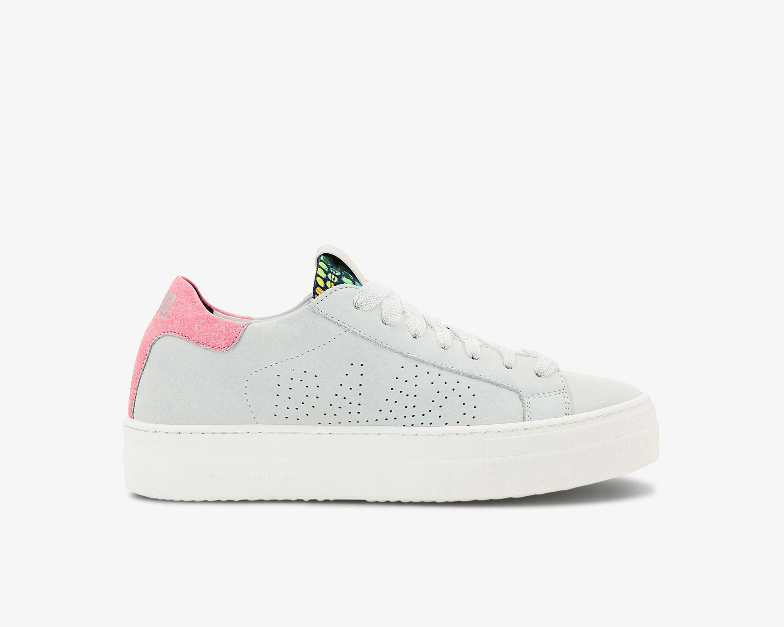 The low-top platform compliment to the Taylor UFO, the Thea UFO features an off-white nubuck leather upper, trim, and toe with an oxidized fuchsia heel tab, a blue suede tongue embossed with a holographic circular pattern, and sheer laces.