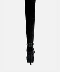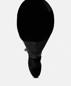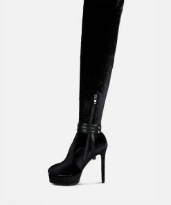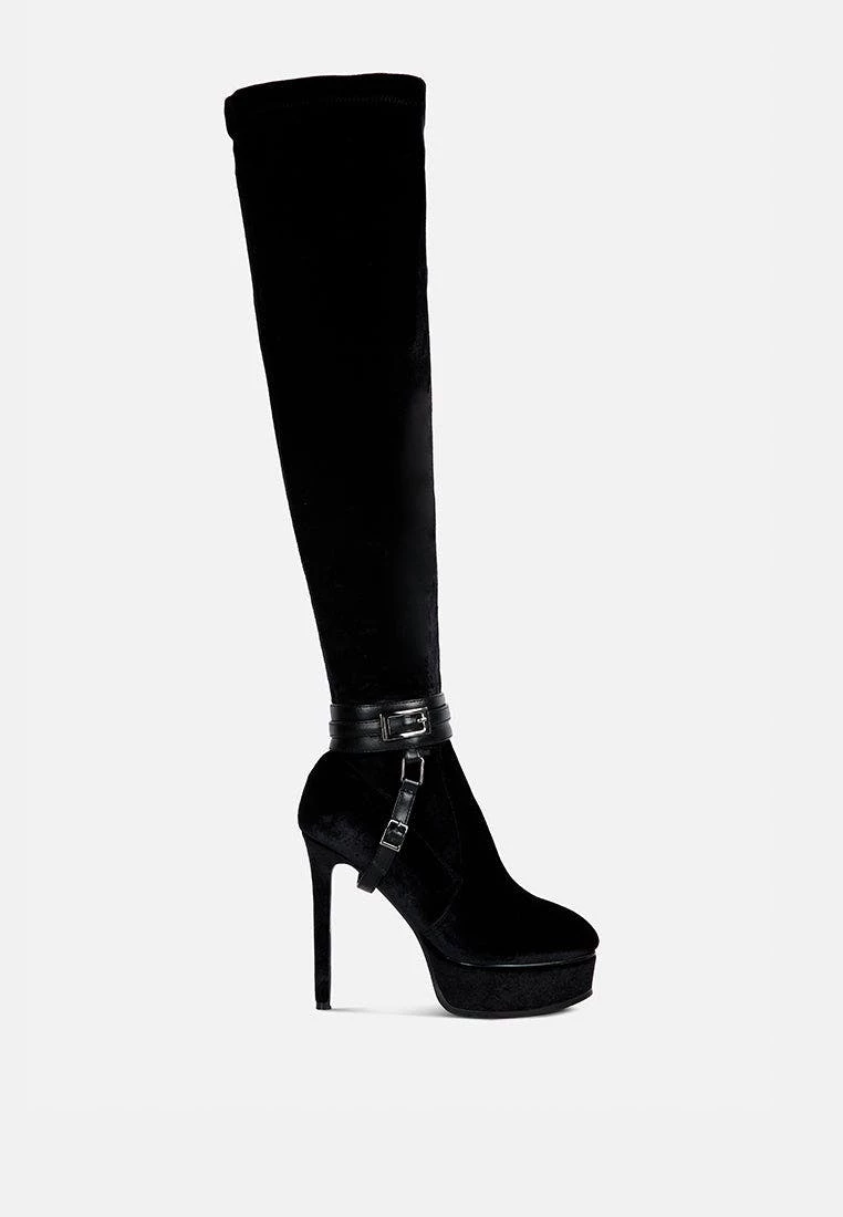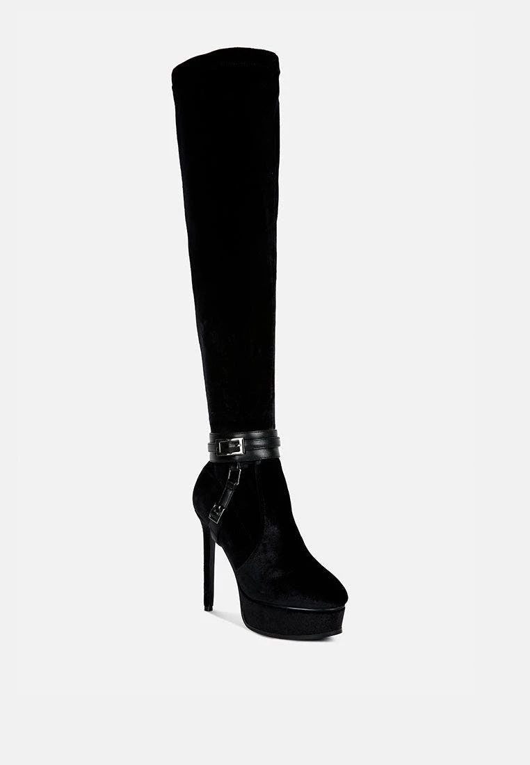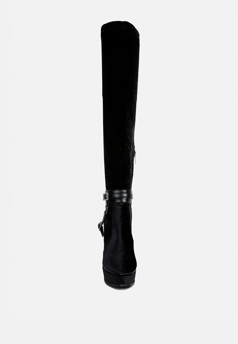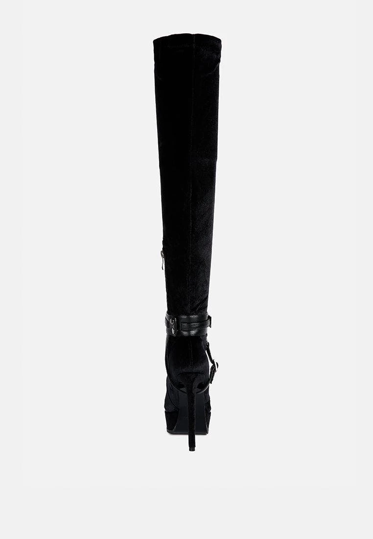 Keeps you winter ready with dose of oomph: The Stiletto Heeled Long Boot further accentuated by high platform is a killer fall boot made with cut pile velvet as outer. It has side zipper which makes it easy to wear. Comes with harness bands on the ankle which have metallic pin buckle details.