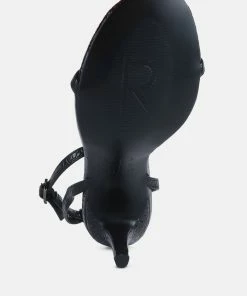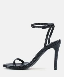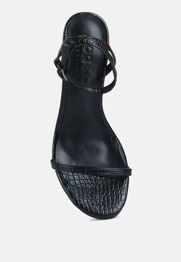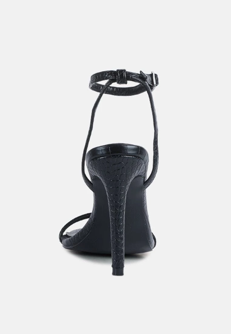 High heeled casual sandal in beautiful Croc textured fine leatherette. Comes with pin buckle fastening at ankle. Comes with soft cushioning which cuts strain.