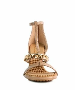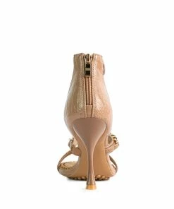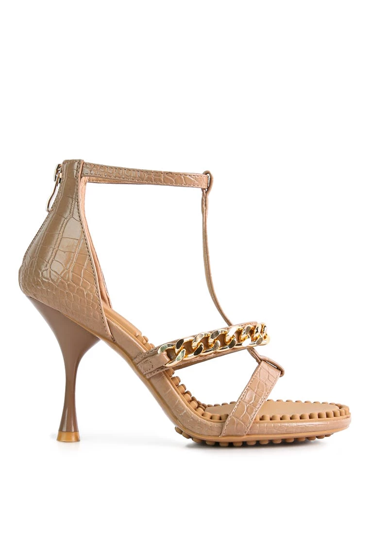High-heeled metal chain detail sandal. The T strap heeled sandal has a sturdy design and looks beautiful and has an easy-to-wear back zipper opening. It has groovious insock, edge line, and outsole.