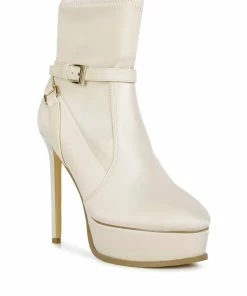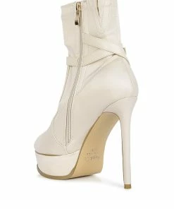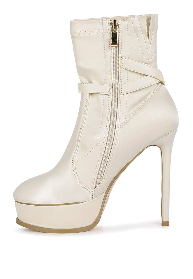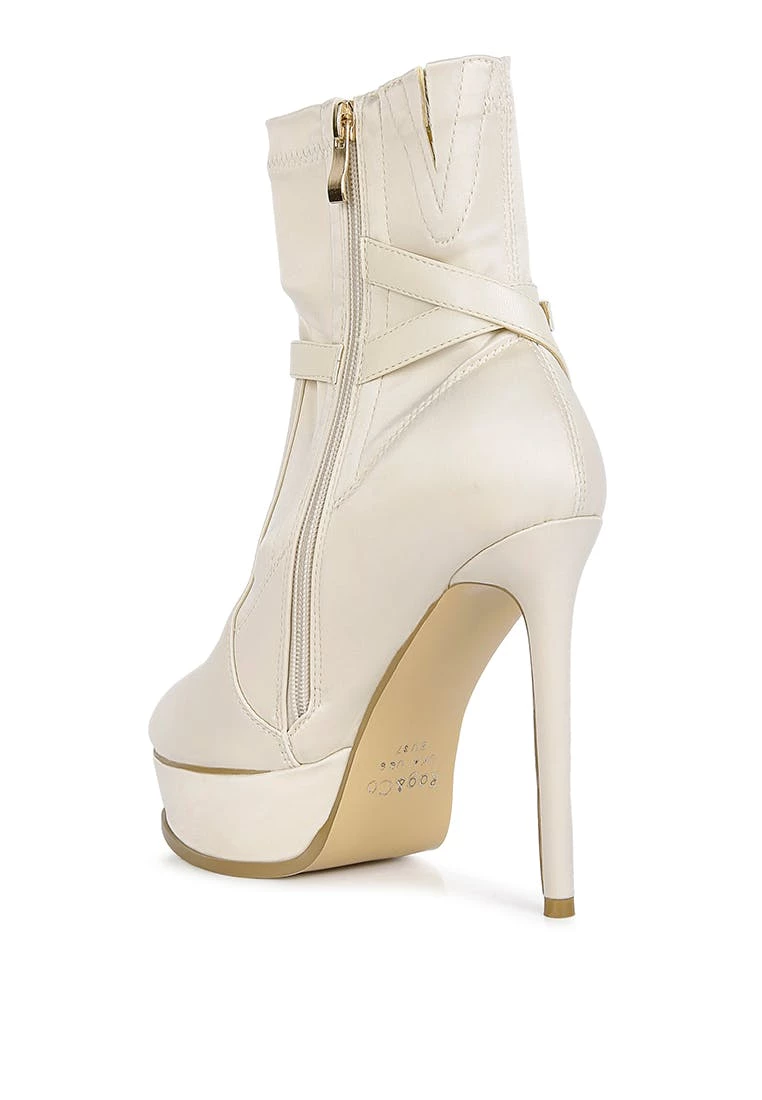 High heeled plush Satin Stiletto Heeled Ankle Bootie. Made with fine craftsmanship, this pair of pointed toe structure luxe winter boot comes with side zipper opening and ankle band harness details. The elasticated dart gussets make it more flexible and add to the fit.