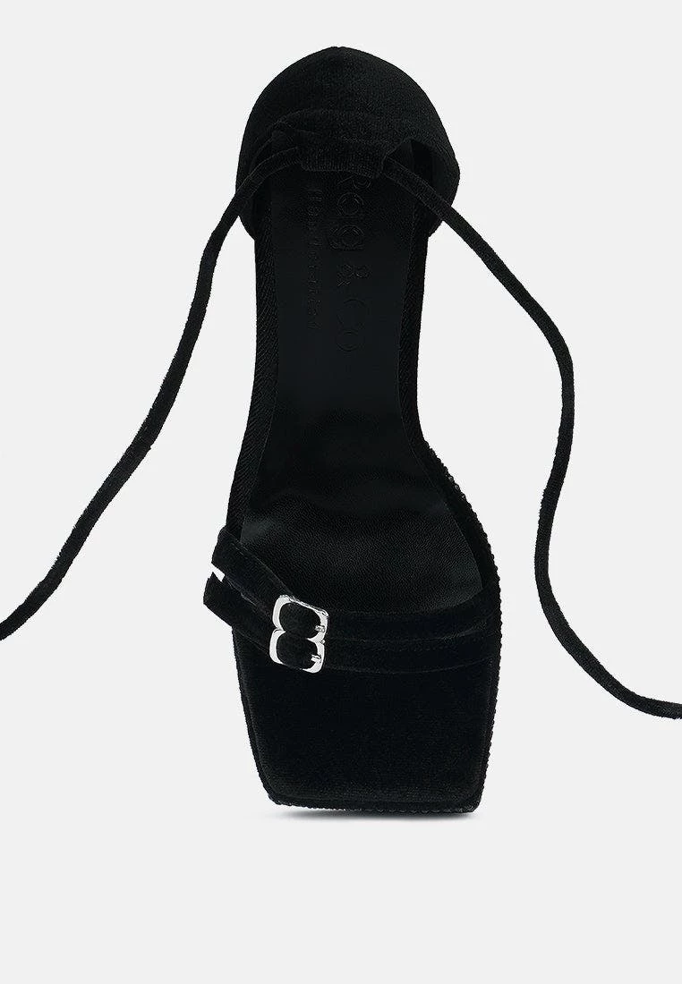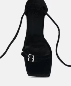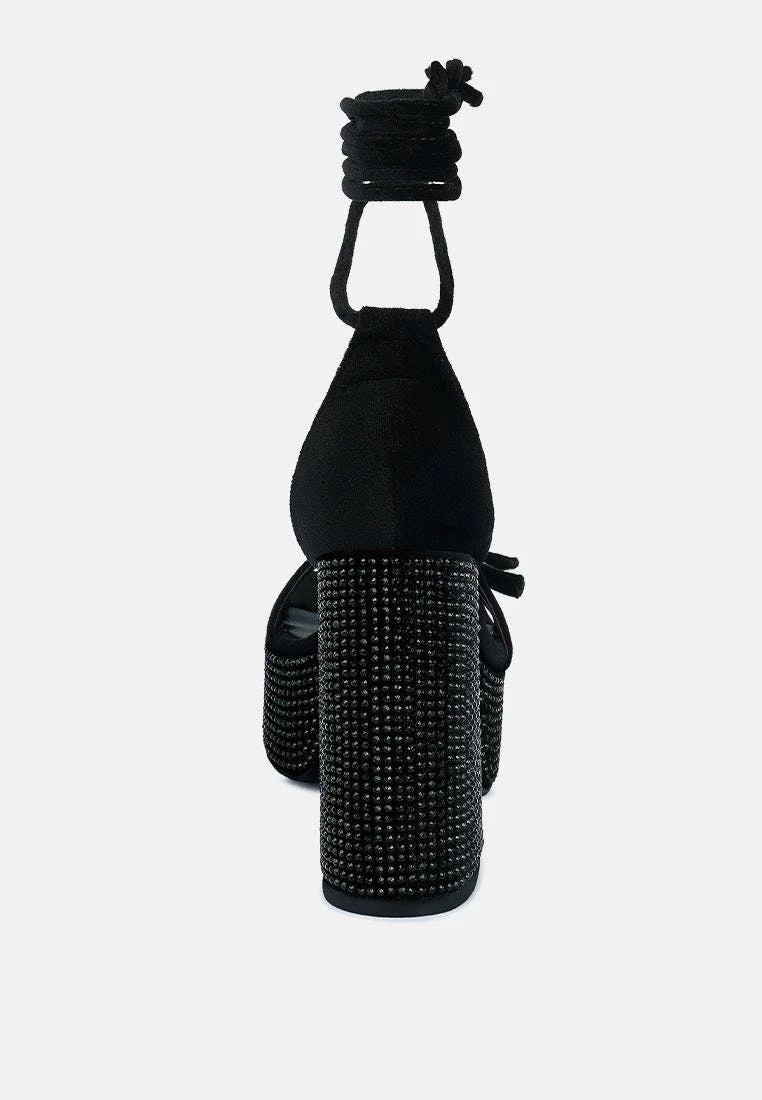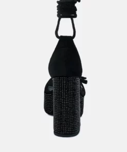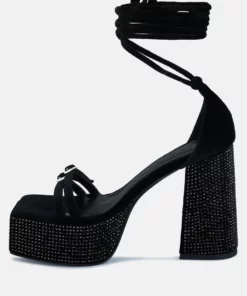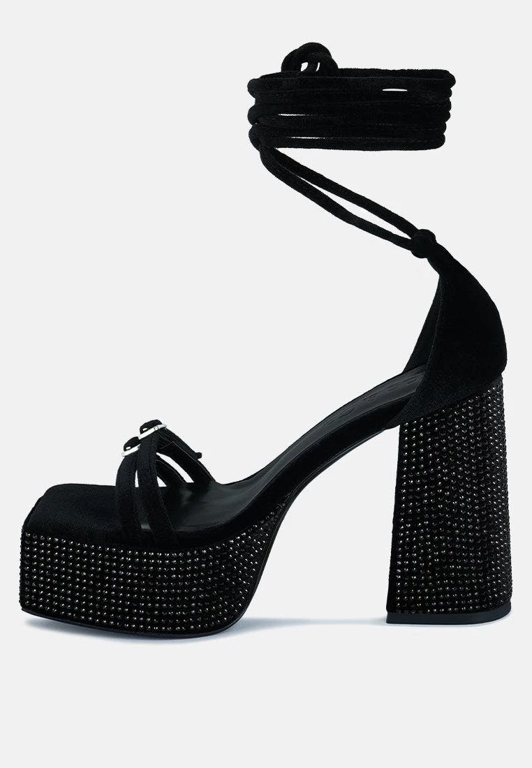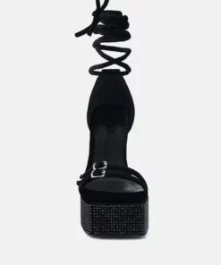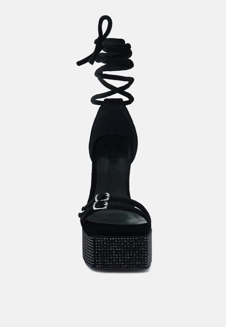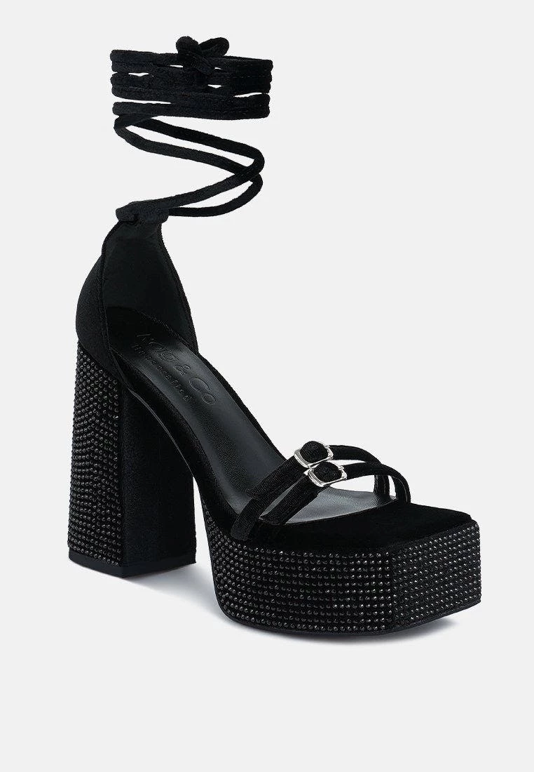 The velvet platform heels are embellished with rhinestones and the tie ups are a trendy touch. The aesthetic of the platform sandals is dazzling and are perfect for fancy occasions such as wedding reception, bachelorette parties, etc.
