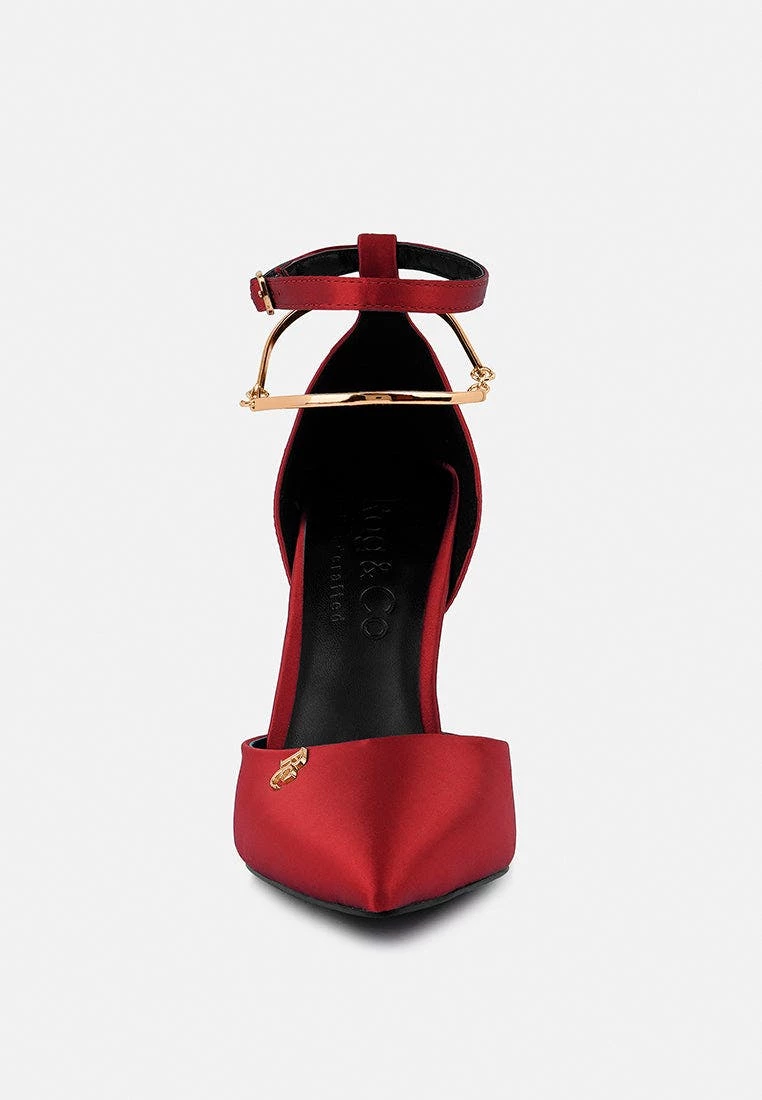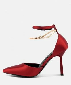Pointed-toe high-heeled satin sandals. The luxurious dress sandals have interesting ankle pin buckle fastening details with metallic anklet detailing. It has soft cushioning which cuts strain and looks uber stylish.