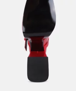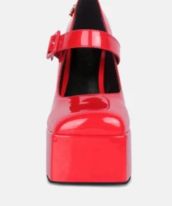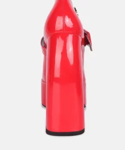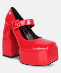 Badas, bold and blingy: handcrafted in patent redeveloped pu leather, this pair of ulta high block heel mary jane is not for the faint hearted. The sandals are well supported by the chunky high platform which adds to the height and cuts strain from feet. It has monochrome pin buckle fastening. The concave cut block heel makes it a head turner.