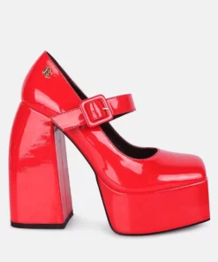 Badas, bold and blingy: handcrafted in patent redeveloped pu leather, this pair of ulta high block heel mary jane is not for the faint hearted. The sandals are well supported by the chunky high platform which adds to the height and cuts strain from feet. It has monochrome pin buckle fastening. The concave cut block heel makes it a head turner.
