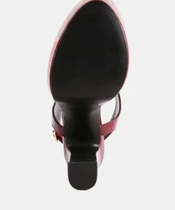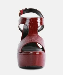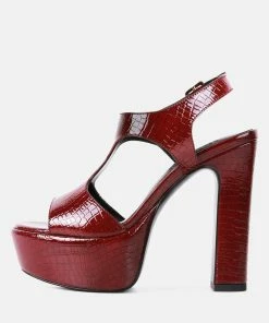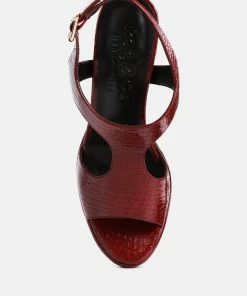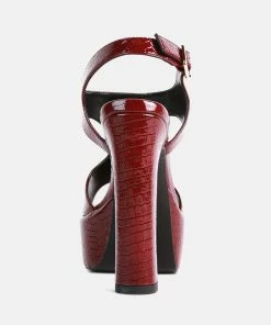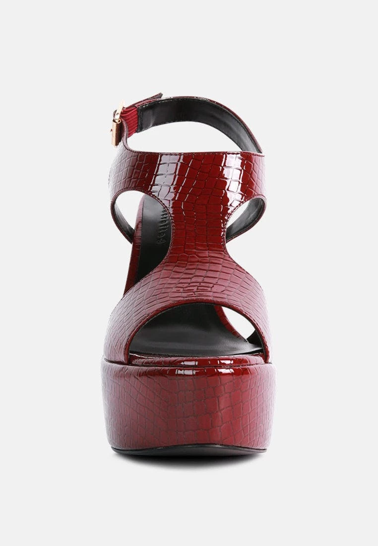 Style blazing cut out sandals are must for your closet: ultra high heeled block sandals in croc textured faux leather. The superb construction and finish is for keeps! The dainty construction in enhanced with shiny metallic hardware.