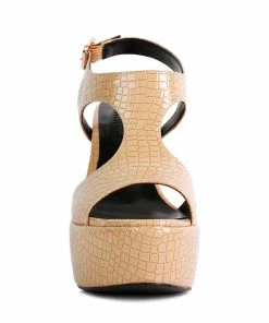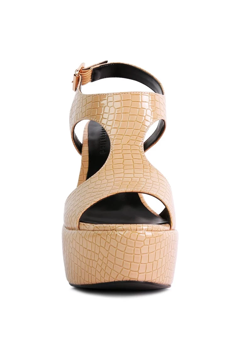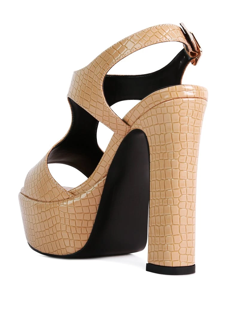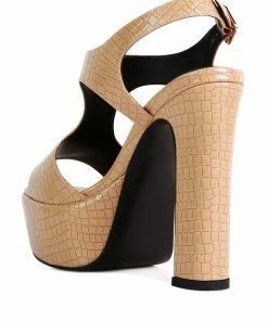 Style blazing cut out sandals are must for your closet: ultra high heeled block sandals in croc textured faux leather. The superb construction and finish is for keeps! The dainty construction in enhanced with shiny metallic hardware.
