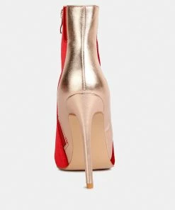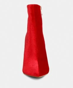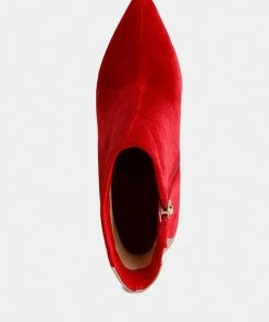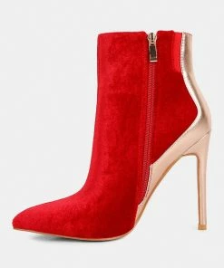Chase wild highs in these high heel stiletto boots in velvet. The black velvet looks gorgeous with silver metallic panel. It has side zipper opening which makes it easy to put on. the closed pointed toe ankle bootie is perfect to make any winter look gorg.