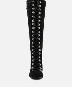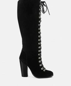 Handcrafted in high-quality genuine leather, this pair of high heeled calf boot has antique metal eyelets which exhibits a vintage charm. The side zipper opening makes it a comfy pair to wear. These are perfect as after party shoes or bachelorette heels.